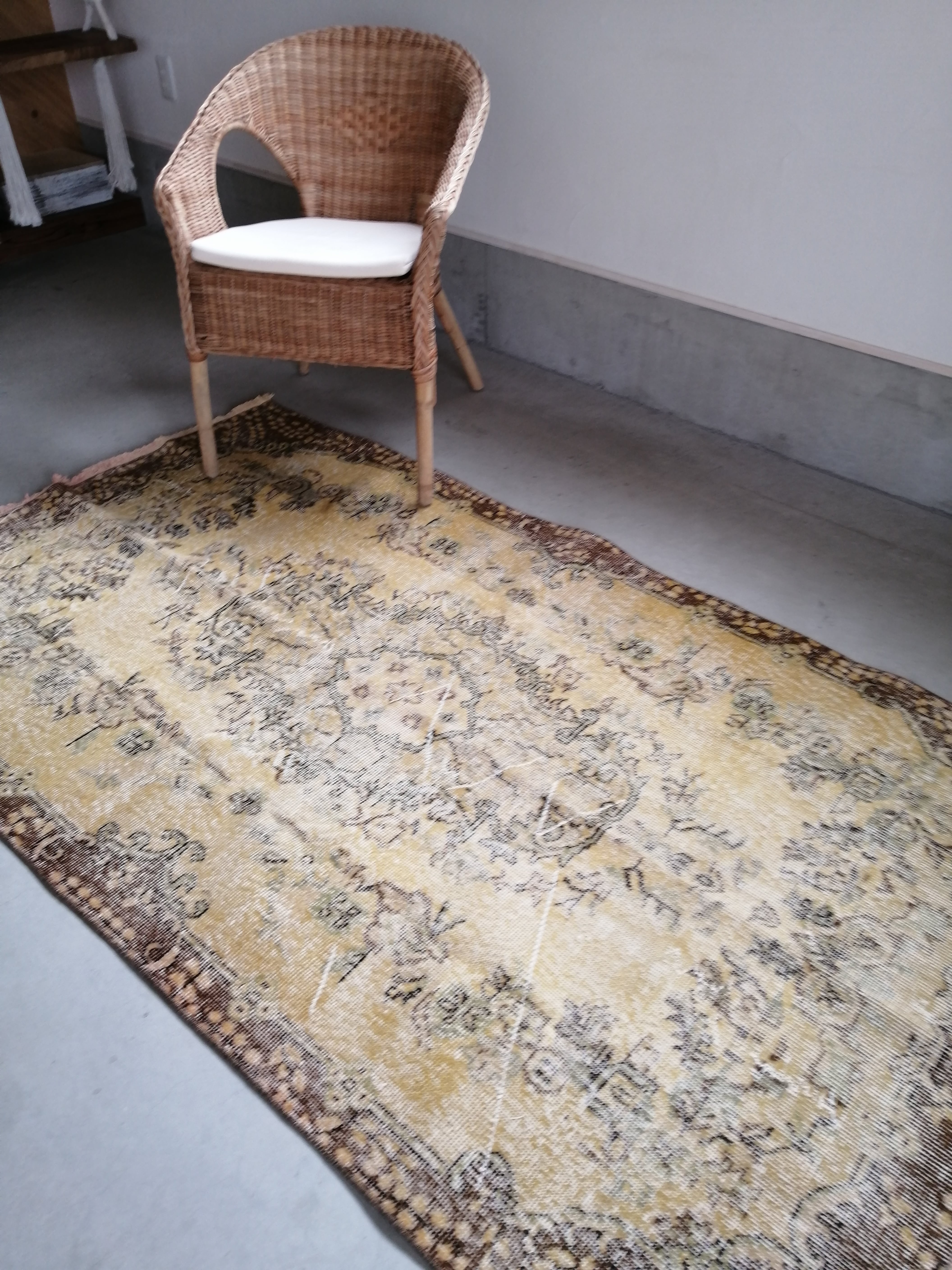 優しい少しマスタード寄りのイエローで後染めされたオーバーダイラグ。下にもとの柄が見え、ラグに深みを足しています。縁はブラウン、柄の水色が浮き出ます。