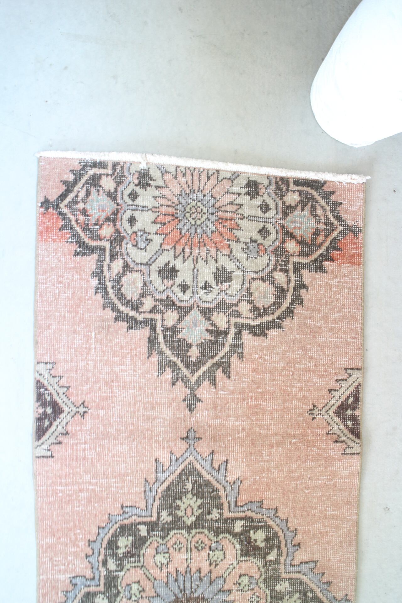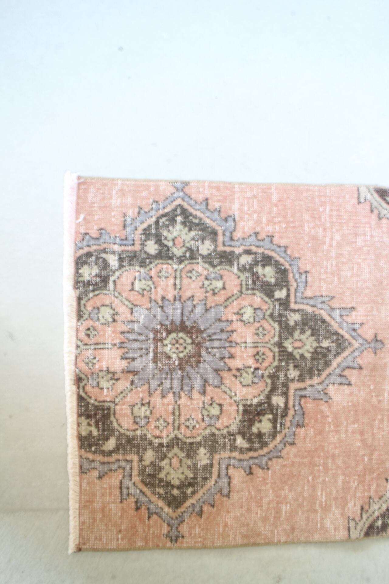 くすみピンクをベースに、ブラウンやパープル寄りのブルーでメダリオン柄が入る上品なラグ。