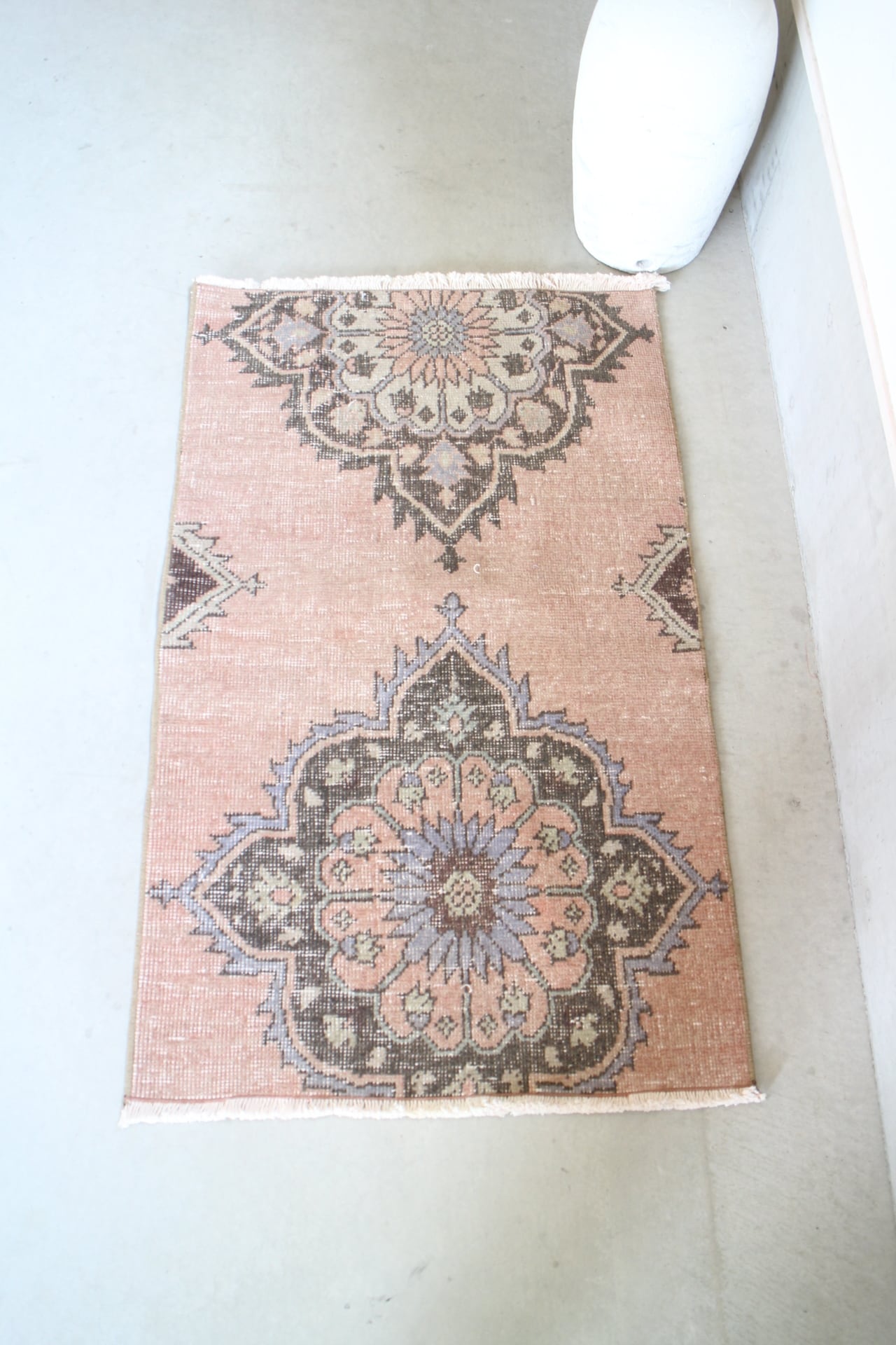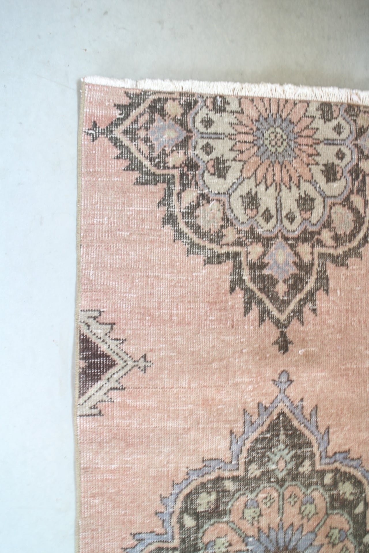 くすみピンクをベースに、ブラウンやパープル寄りのブルーでメダリオン柄が入る上品なラグ。