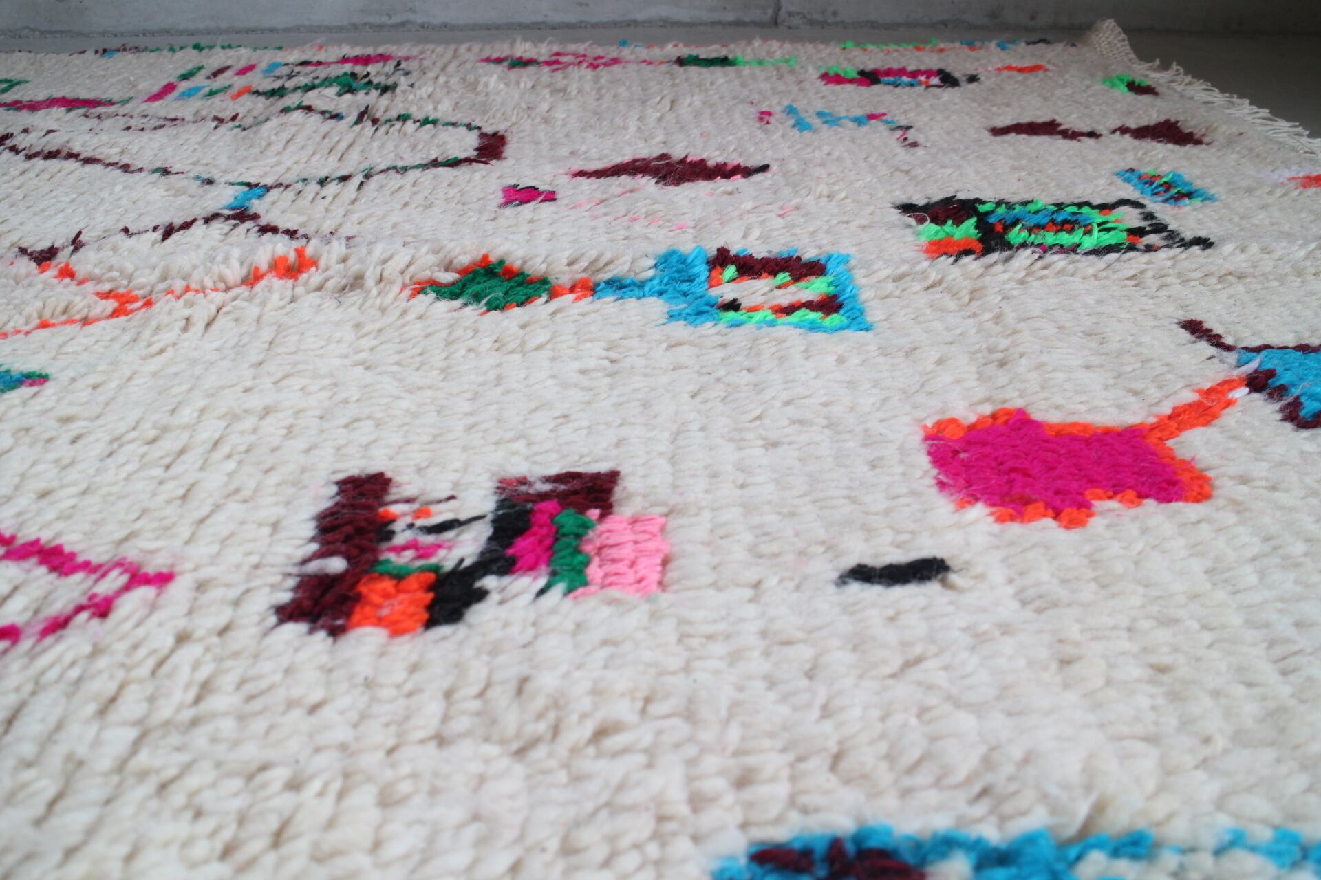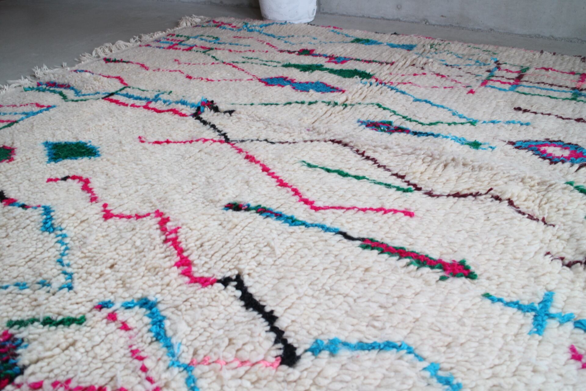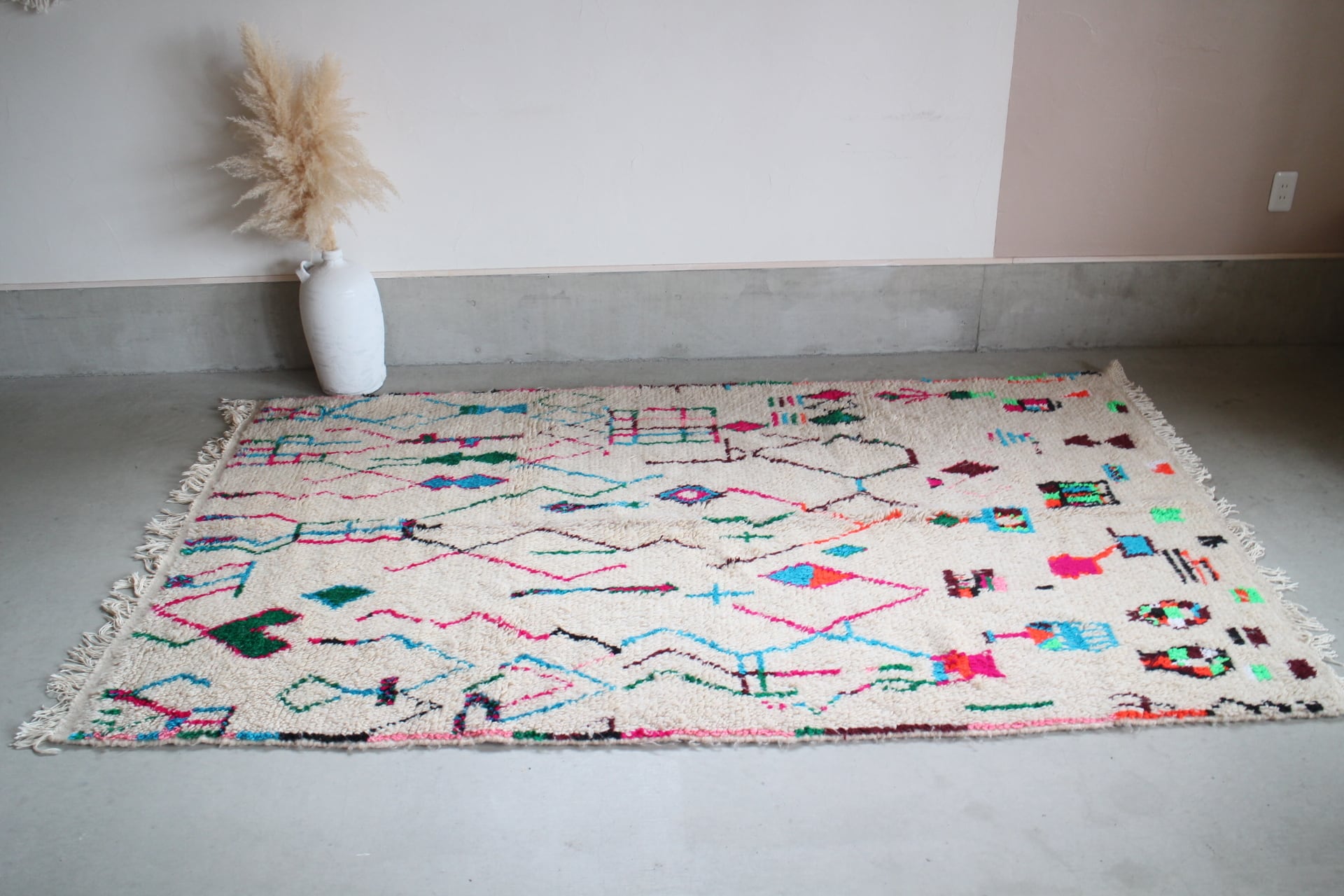アイボリーをベースにアジラルらしいカラフルなネオンカラーで模様が入ります。鮮やかなオレンジや黄緑、水色がモダンな印象。ベルベル人の女性が織りあげる模様は、同じものが二つとない一点ものの作品です。bohoインテリアやモダンなミッドセンチュリーのお部屋に。