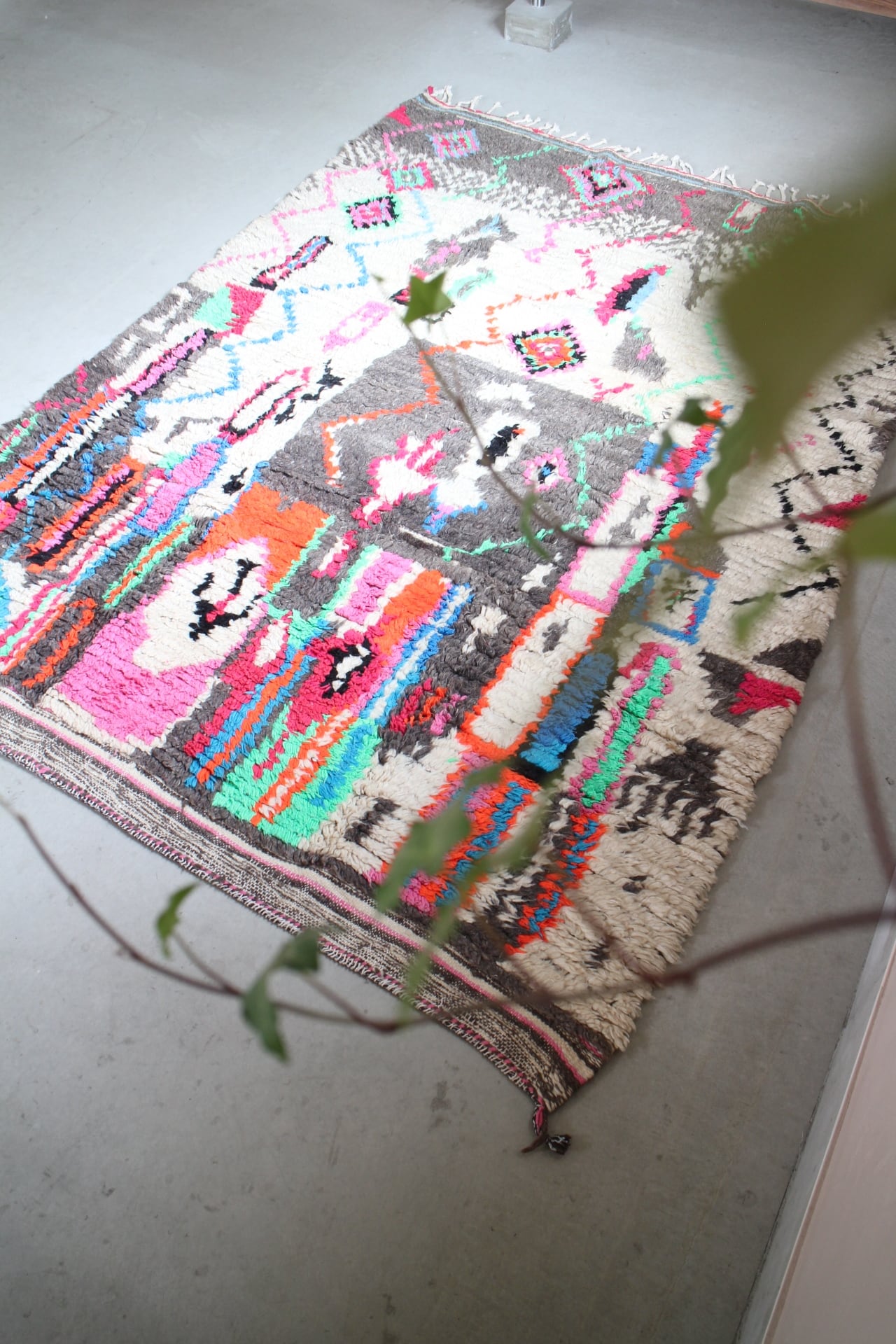 濃いめのグレージュとアイボリーをベースに華やかなネオンカラーが入るモダンアートのような印象のラグ。