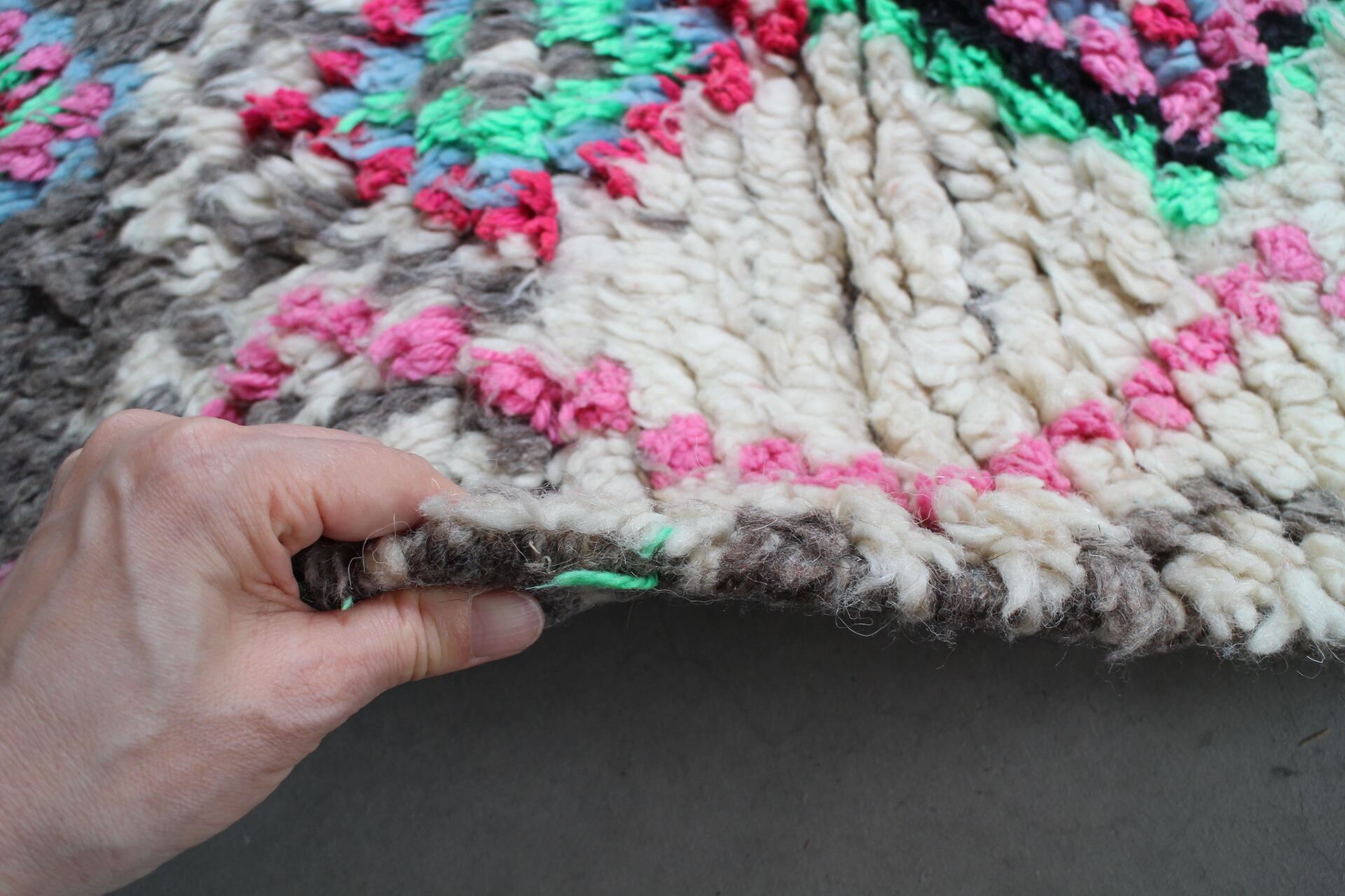 ただし、モロッコラグの特徴として羊毛に髪の毛のような黒い繊維が混じったり、固い草の繊維のようなものや、カラフルな小さなビニールが混じることがあります。