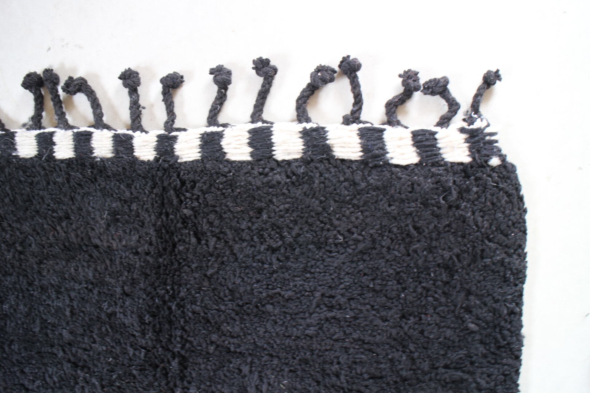 数の少ない、ブラックのベニワレンラグ。単色のラグですが端の処理がストライプに柄が入り、片方はアイボリーの三つ編みフリンジ、もう片方はブラックの三つ編みフリンジと洒落ています。