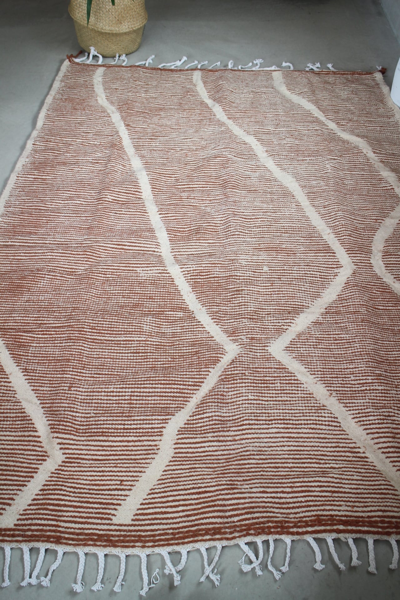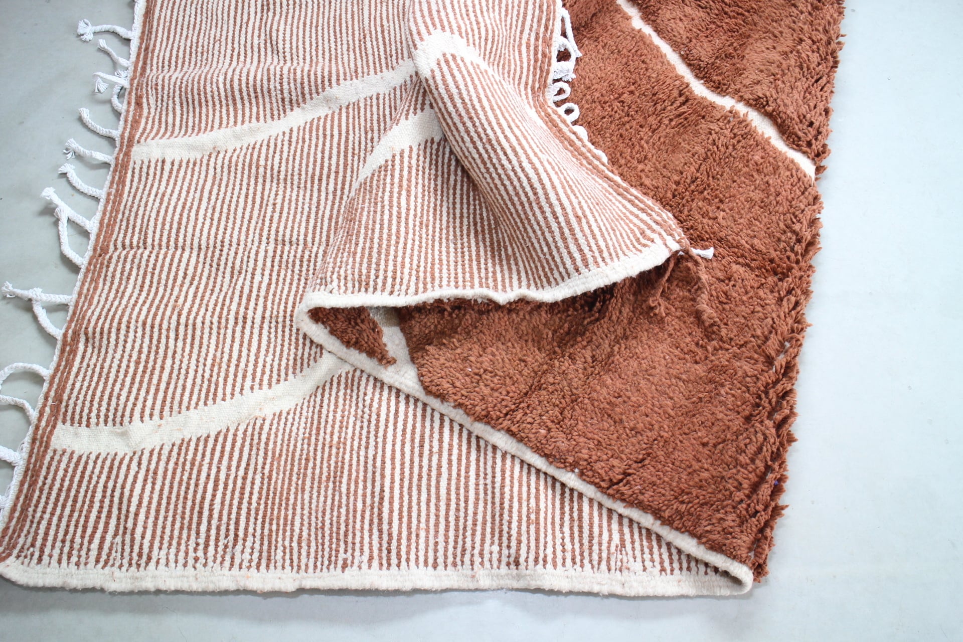 珍しく希少なミルクチョコレートブラウンのベニワレンラグ。単色のラグですが不規則なライン状に平織りが入り、モダンな印象のラグです。