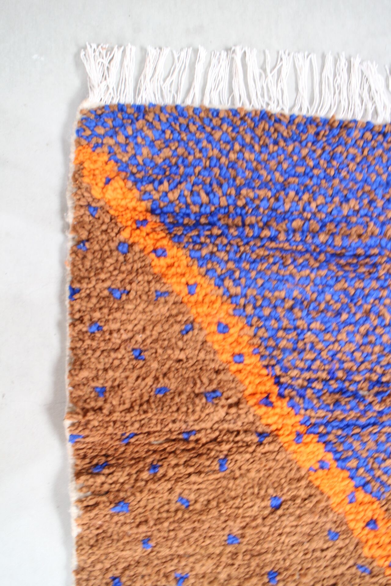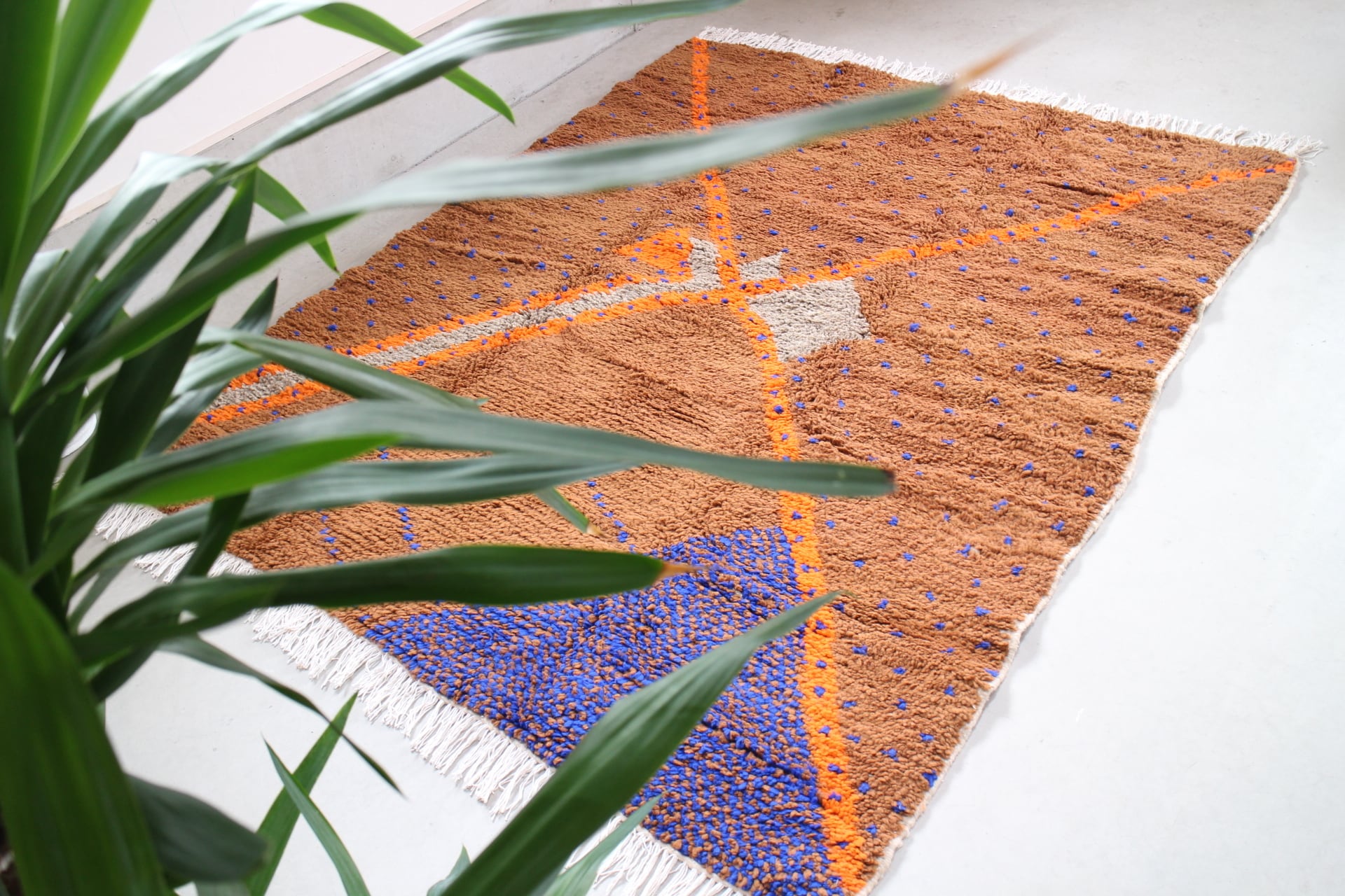 このラグの特徴は個性的な柄、色合わせです。ブラウンのベースにロイヤルブルーのドットが入り、オレンジやグレーで柄が入るモダンアートの様な一枚。