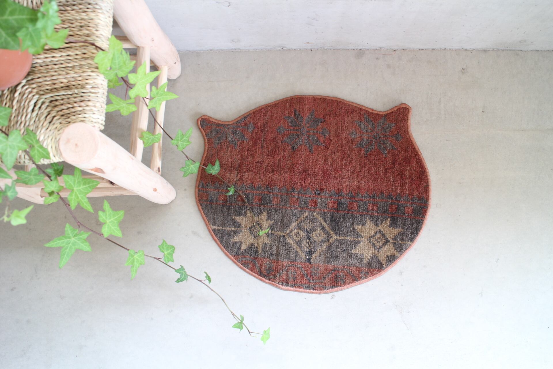 トルコラグは、いたみのある部分はカットし綺麗な部分を残しリサイズされ、またつぎの世代に受け継がれていきます。猫ちゃんの顔型にカット、サイドをミシンがけされています。猫ちゃんの休憩場所やご飯タイムのプレイスマットに。トルコラグはワンちゃんや猫ちゃんのお気に入りの居場所になります。