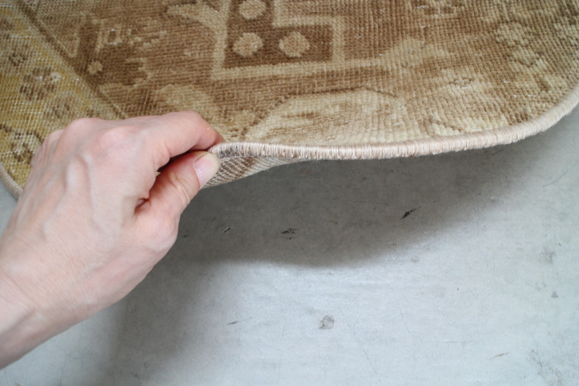 トルコラグは、いたみのある部分はカットし綺麗な部分を残しリサイズされ、またつぎの世代に受け継がれていきます。猫ちゃんの顔型にカット、サイドをミシンがけされています。猫ちゃんの休憩場所やご飯タイムのプレイスマットに。トルコラグはワンちゃんや猫ちゃんのお気に入りの居場所になります。
