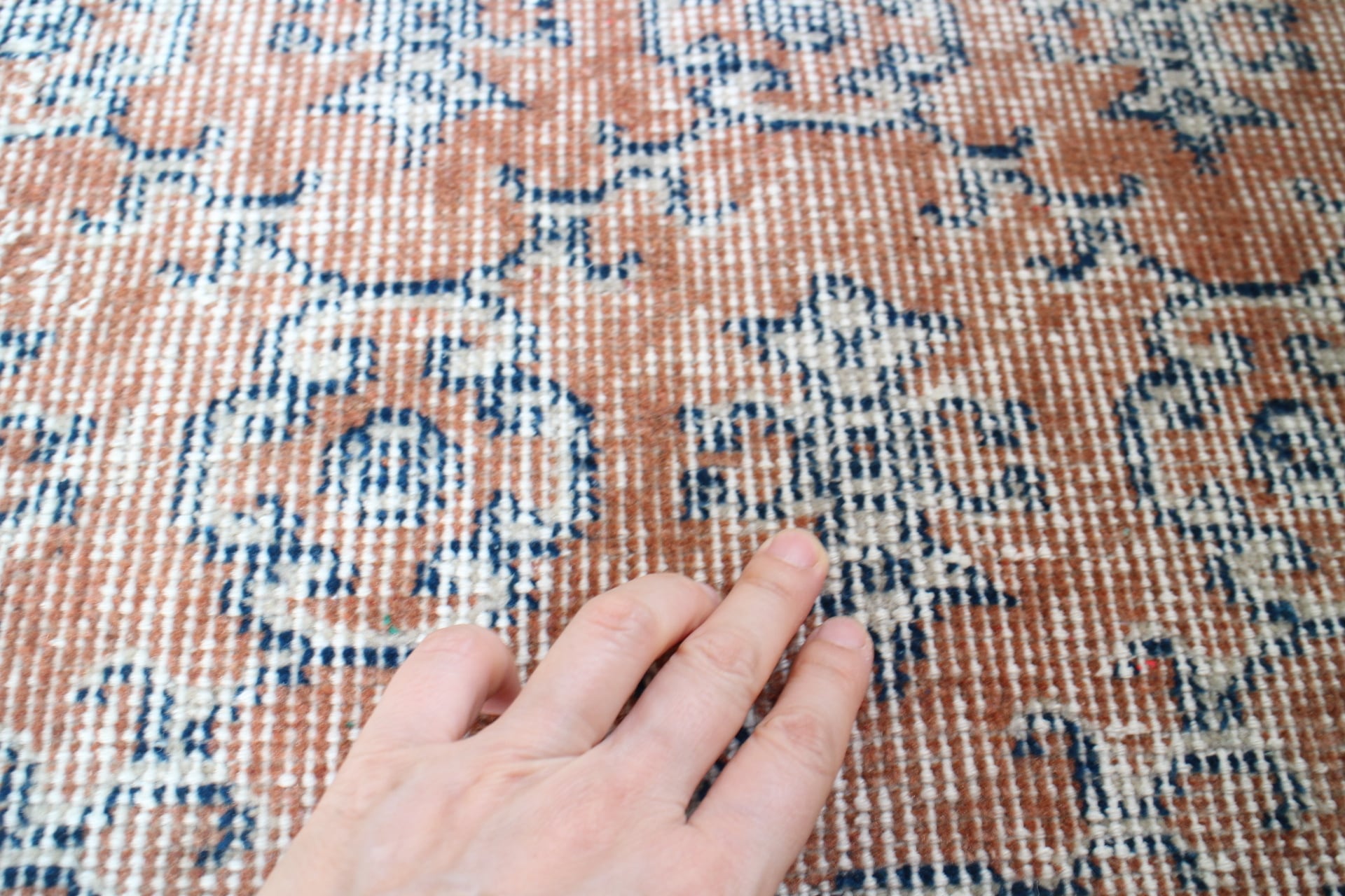 くすみオレンジベースのヴィンテージラグ。柄がネイビーで入り落ち着いた、格好良い紋章柄のラグになっています。時を経てきた物だけが持つ独特の味わいがあります。