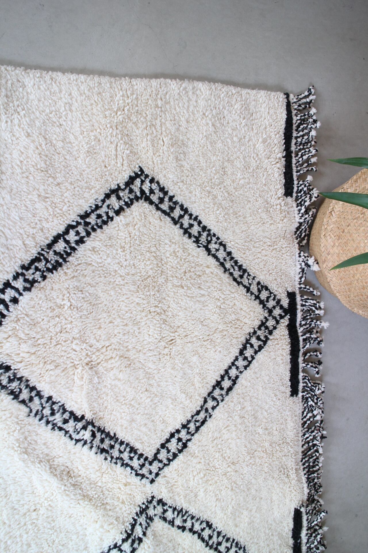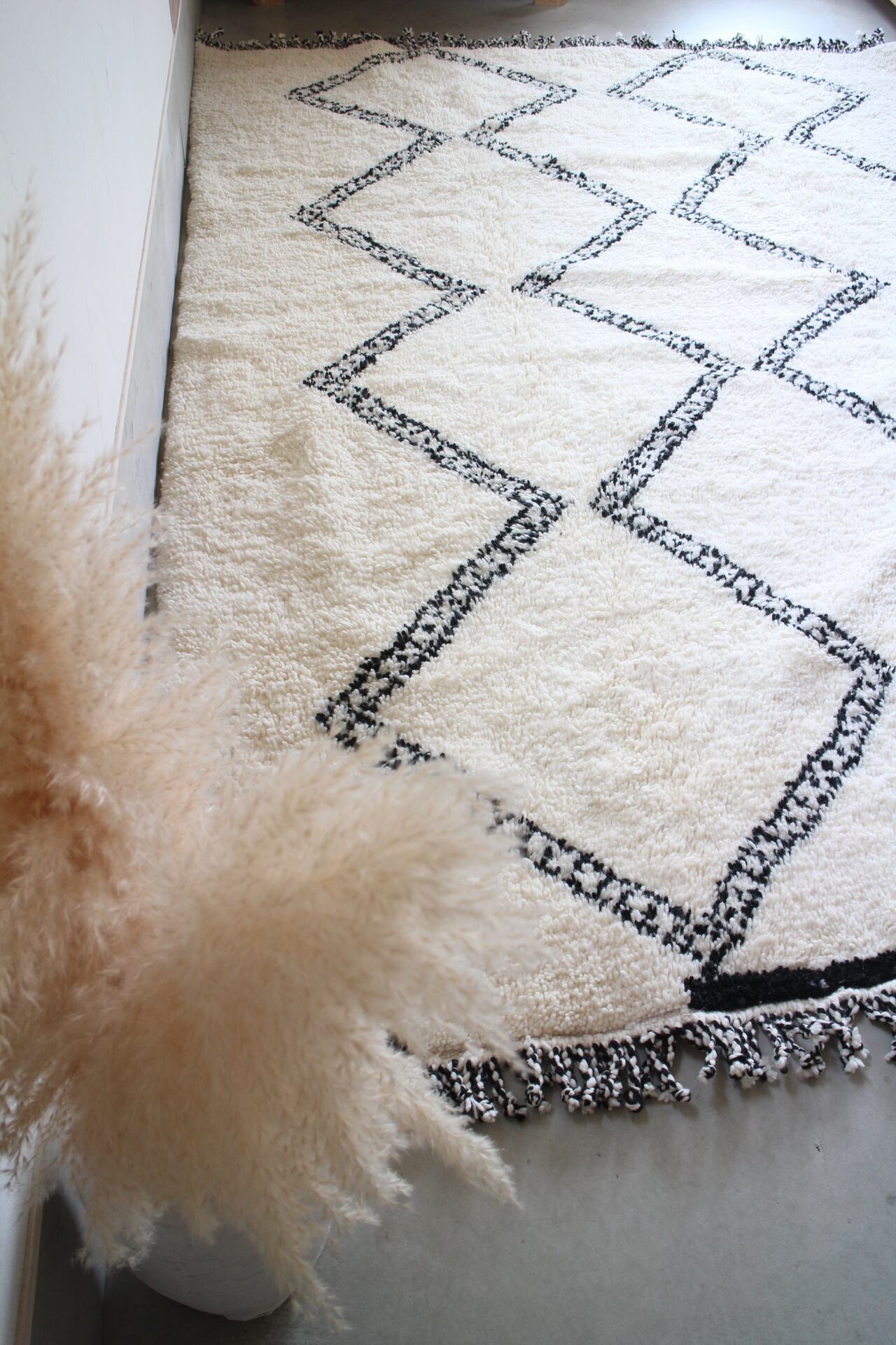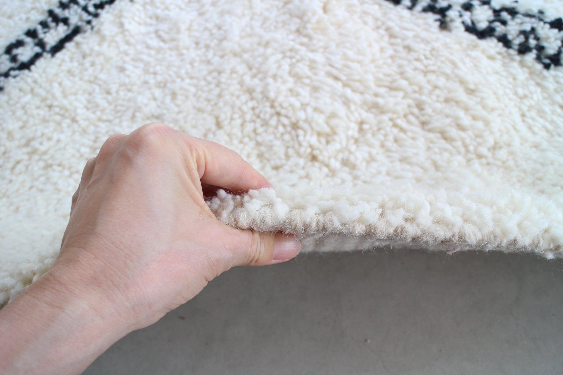羊のもつそのままの色を生かしたアイボリーに黒の模様。二重のダイヤモンド柄はかっこ良い雰囲気で男性的なインテリアやBohoインテリアによく合います。端の処理は黒で丁寧にステッチが施され、フリンジも黒白2色が混ざり職人の丁寧な仕事ぶりを感じられるラグです。