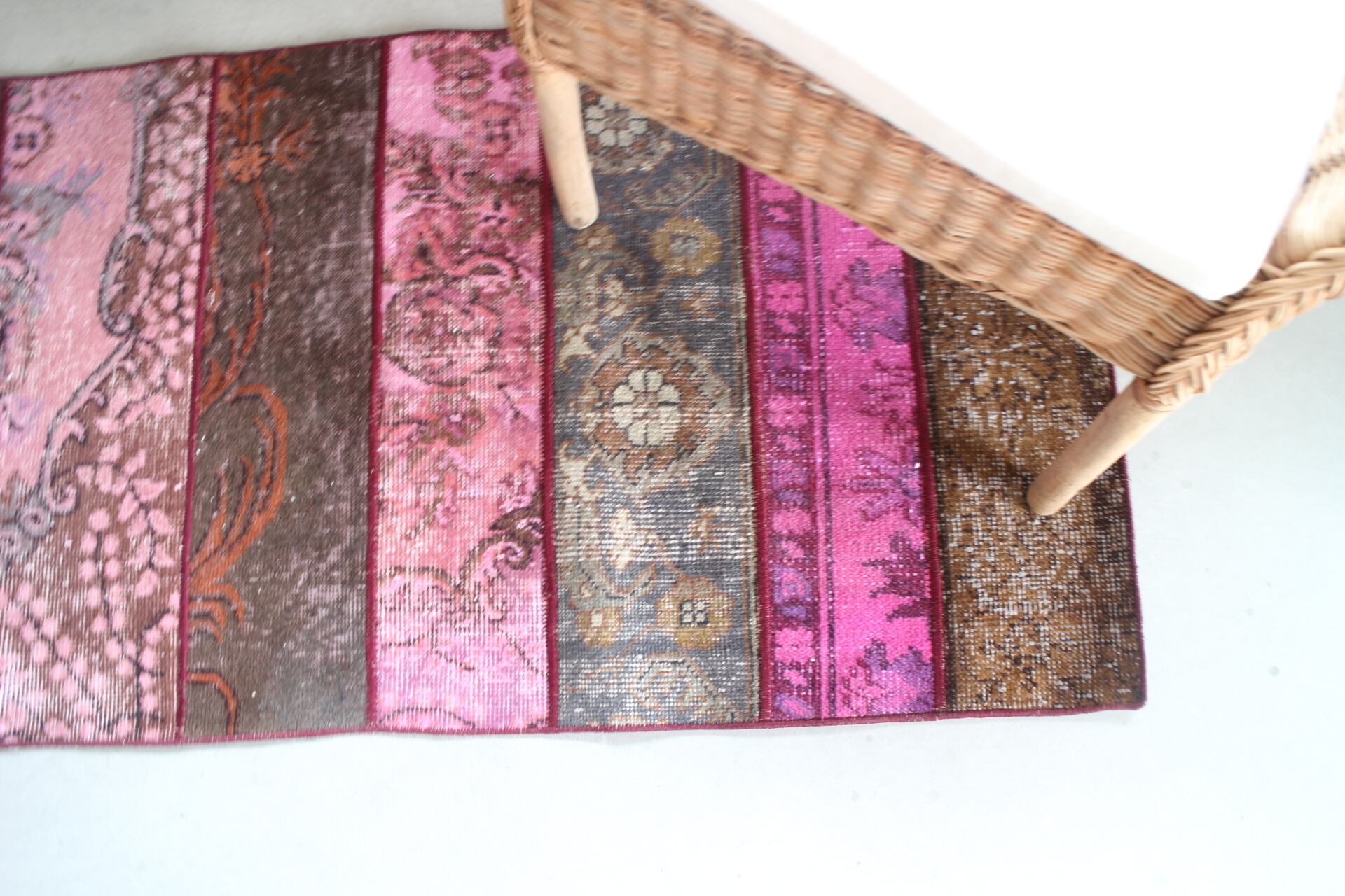 ピンクオーバーダイにブラウンやシックなネイビーが入ったパッチワークラグ。ピンクメインのラグですが可愛らしさよりもヴィンテージ特有のかっこ良さを感じるラグです。
