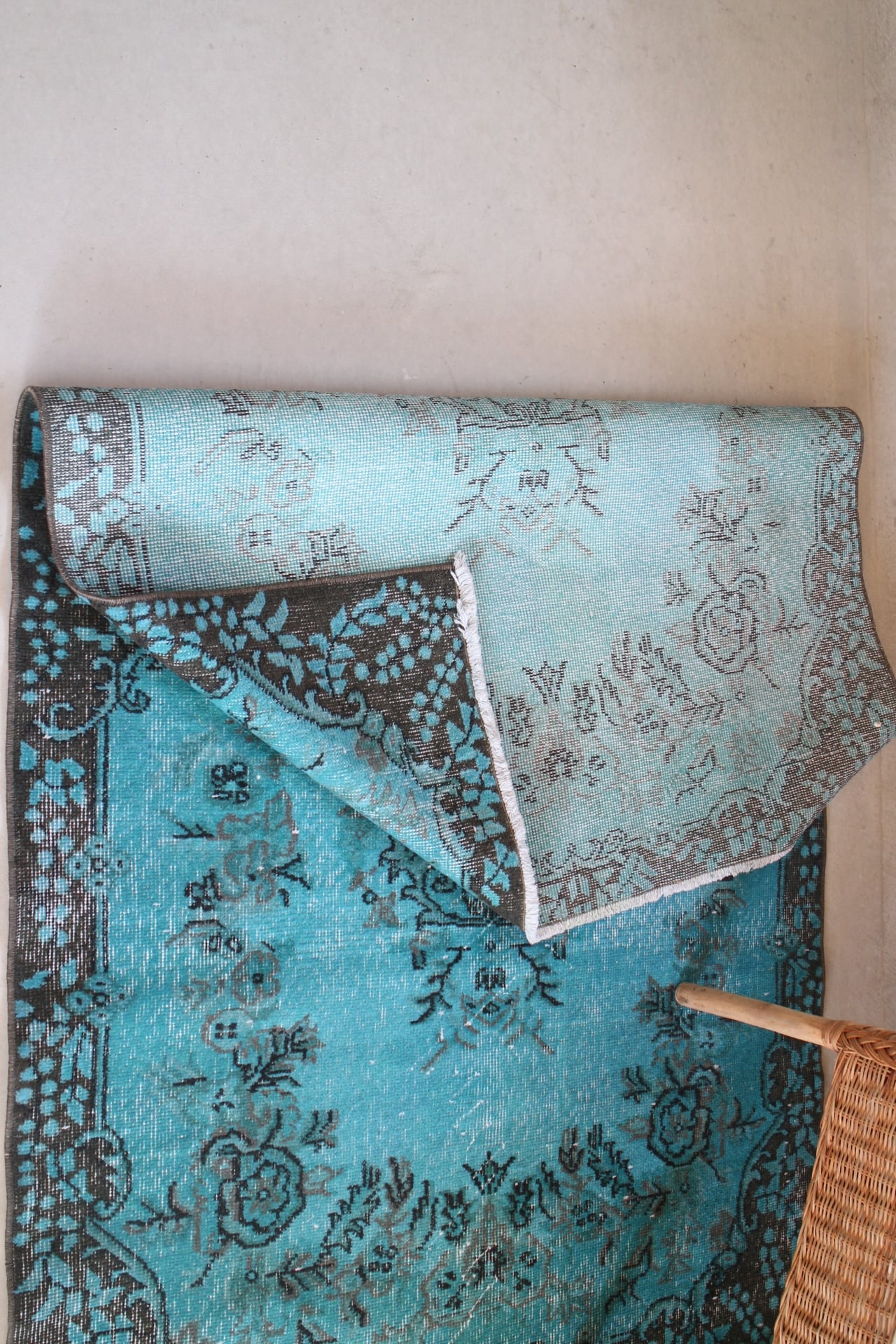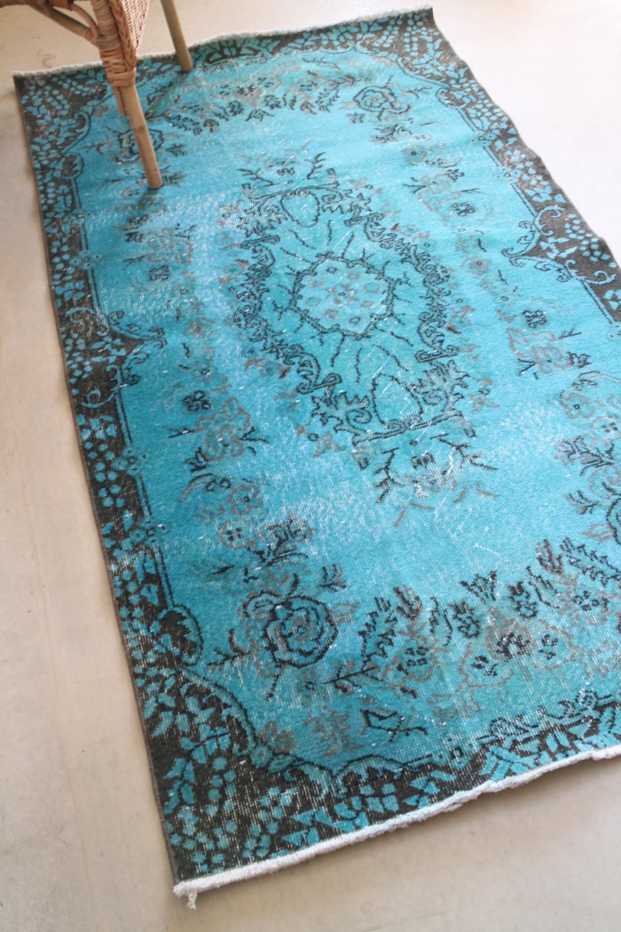 深いターコイズブルーでオーバーダイ(後染め)されたヴィンテージラグ。縁にはもともとのブラウンがのぞきます。深い海のような色合い、男性的な色合いの中にお花柄の可愛らしさもあるラグです。