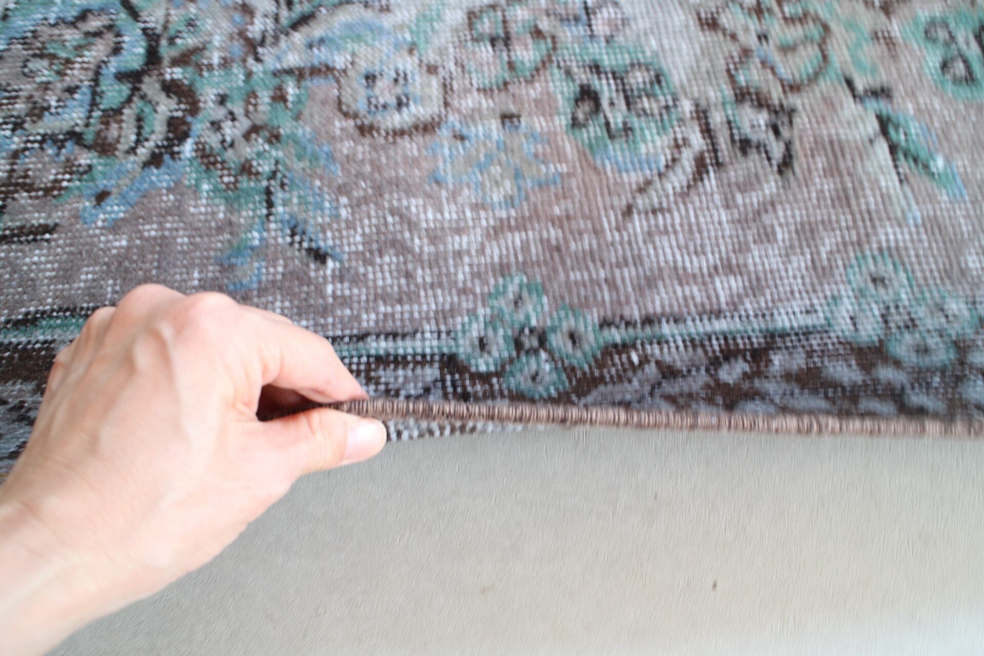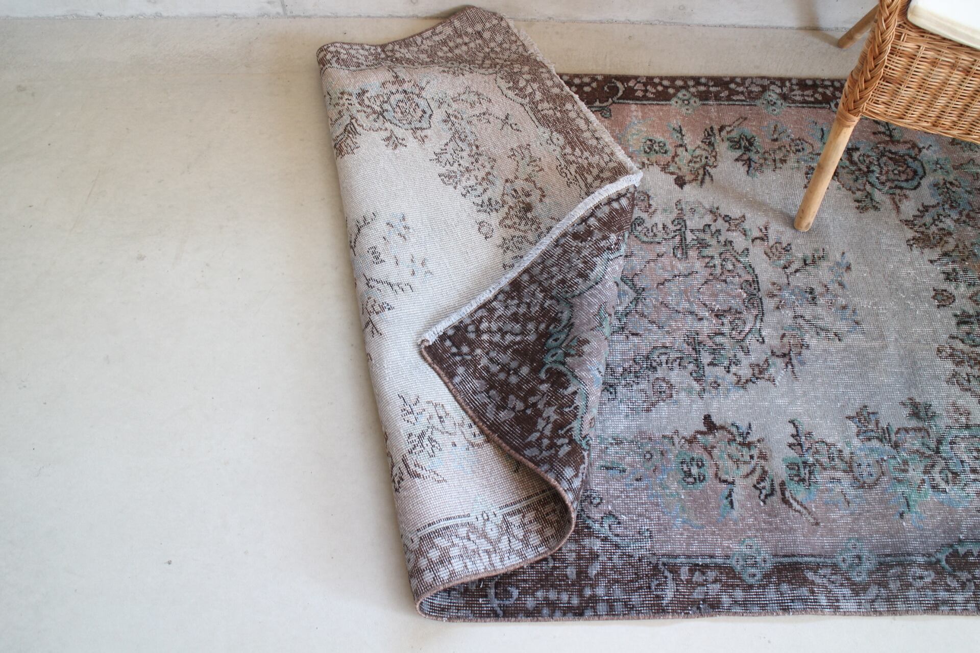 人気の高いグレーにオーバーダイ(後染め)されたヴィンテージトルコラグ。シックな色合いはインテリアと合わせやすくお勧めです。縁はブラウンでグリーンやくすみブルーが模様に入ります。