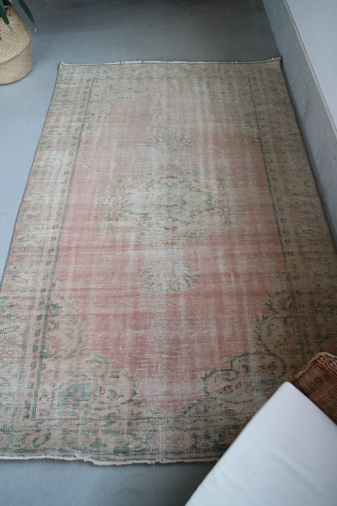 淡いくすみピンクにグリーンの模様で縁とメダリオンが入るヴィンテージラグ。ヴィンテージらしいニュアンスある一枚です。