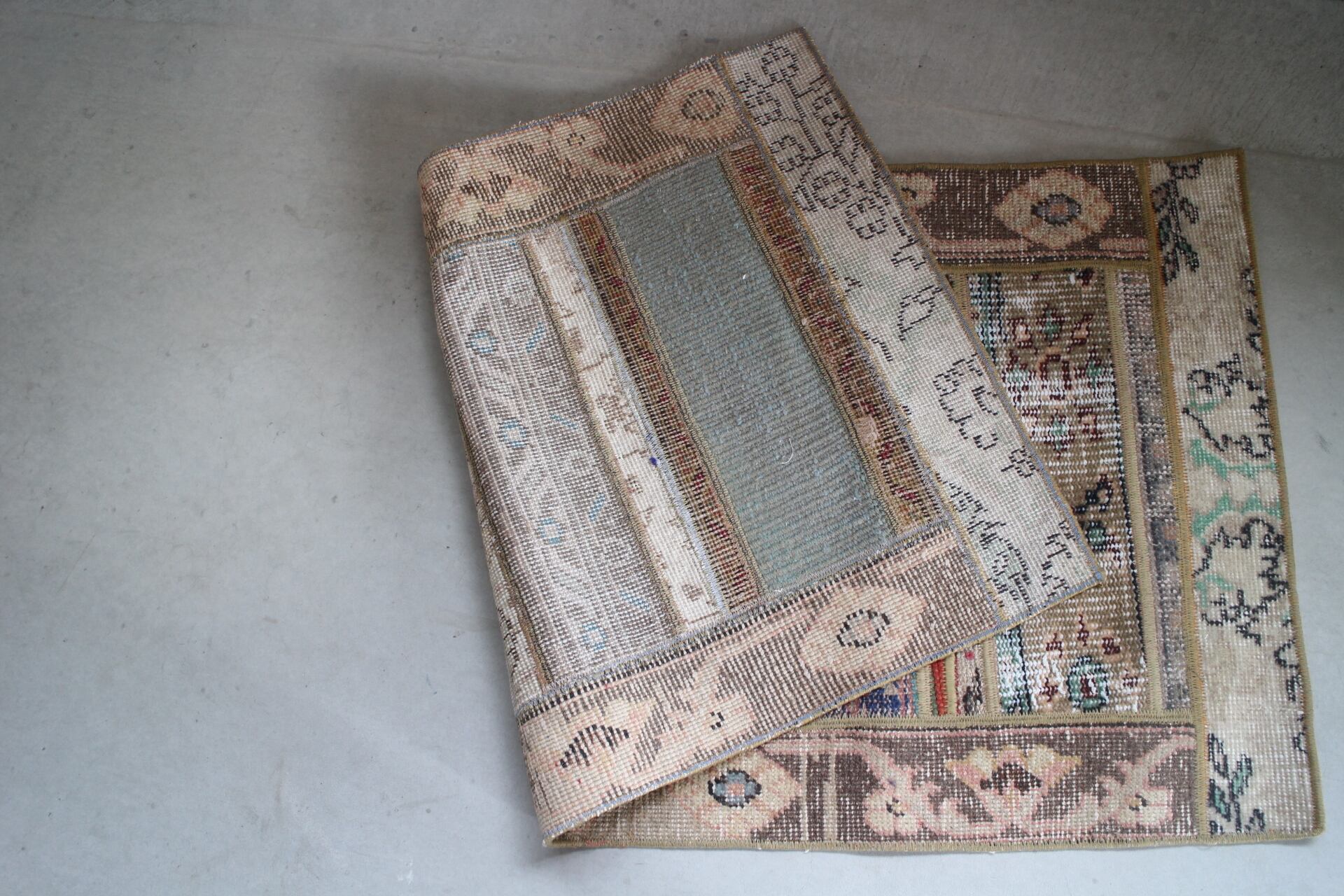 ベージュとグレージュを基本にミントグリーンが入る爽やかなカラーのパッチワークラグ。ひとさしの赤も素敵です。細かく縫い合わせられたパッチワークには職人さんの丁寧な仕事が感じられます。