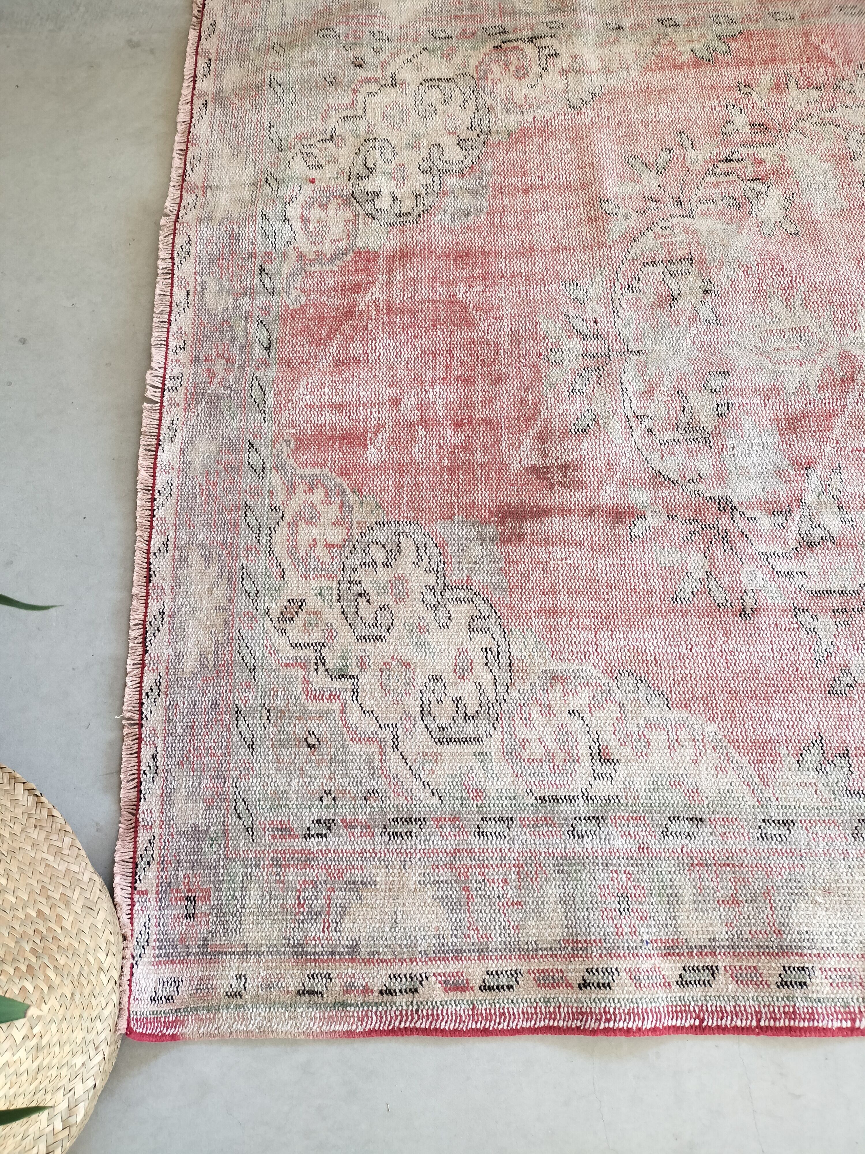 褪せたレッドがヴィンテージ感たっぷりなトルコラグ。シャビーなかすれがあり格好良い印象です。ネイビーやグリーンで柄が入っています。