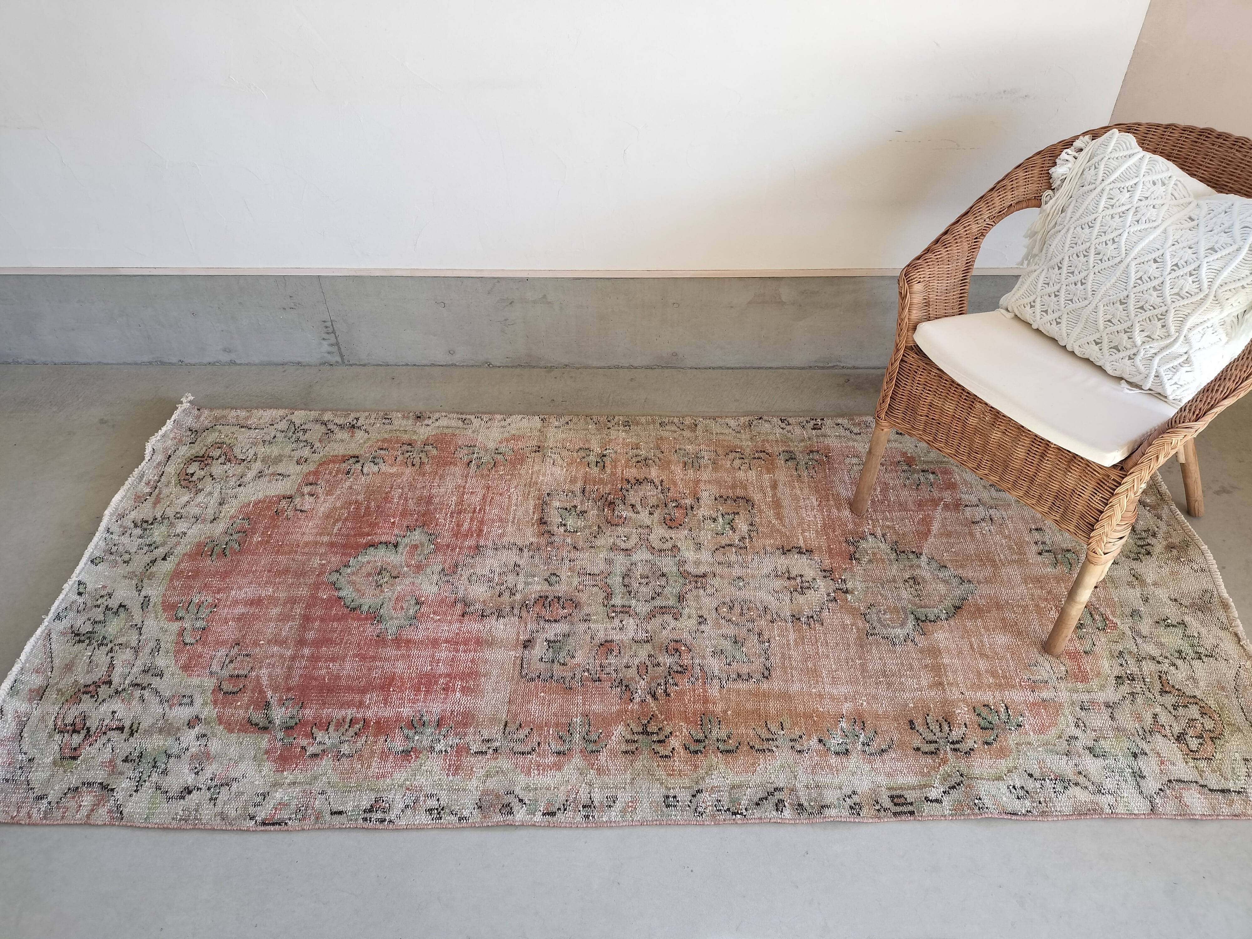 かすれたオレンジがヴィンテージらしい格好良いラグ。黒のラインにミントグリーンで模様が入ります。メダリオンの柄も男性的な印象。