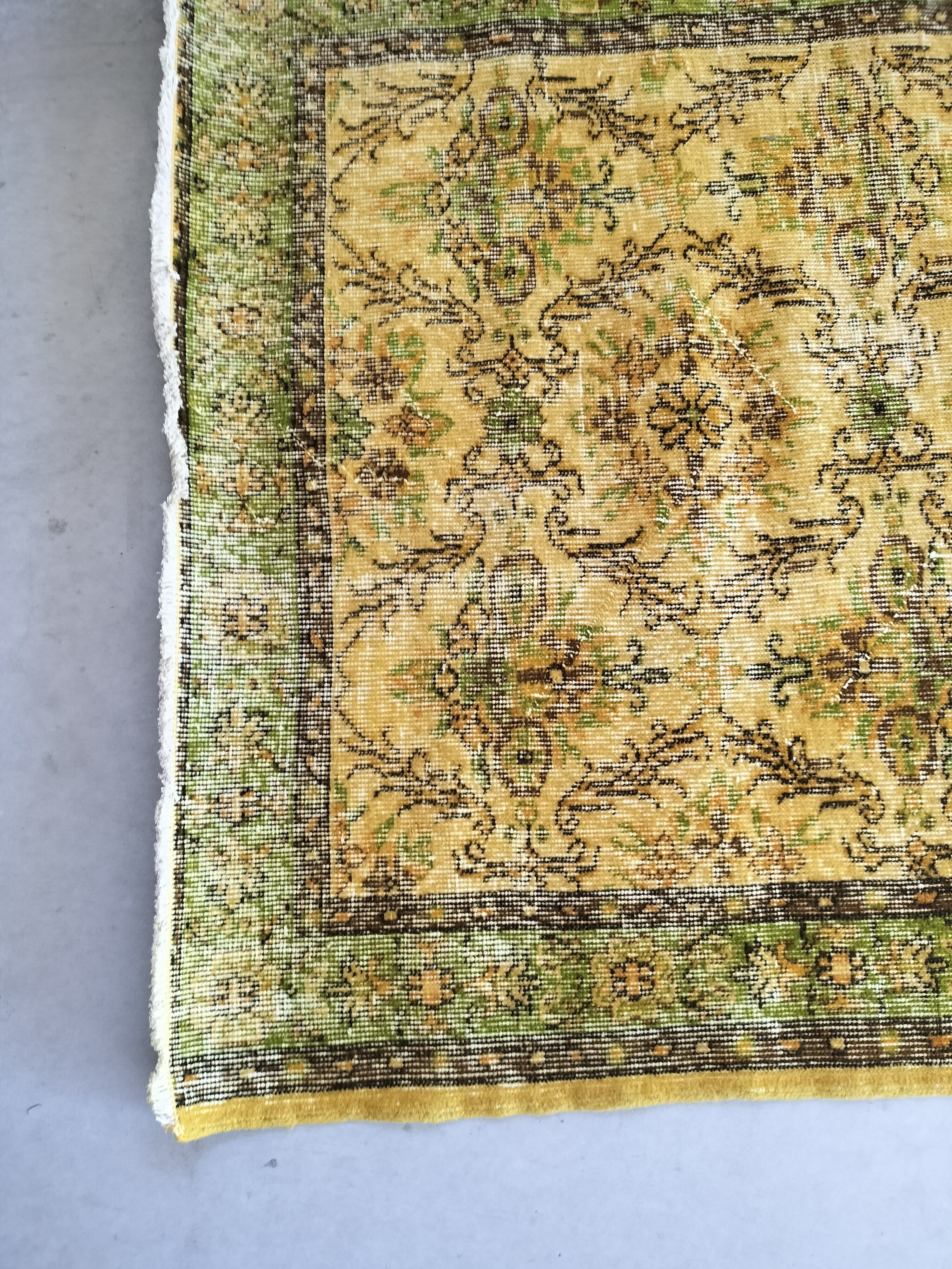 鮮やかなイエローのオーバーダイラグ。縁にはもとの柄の緑が浮き上がります。
