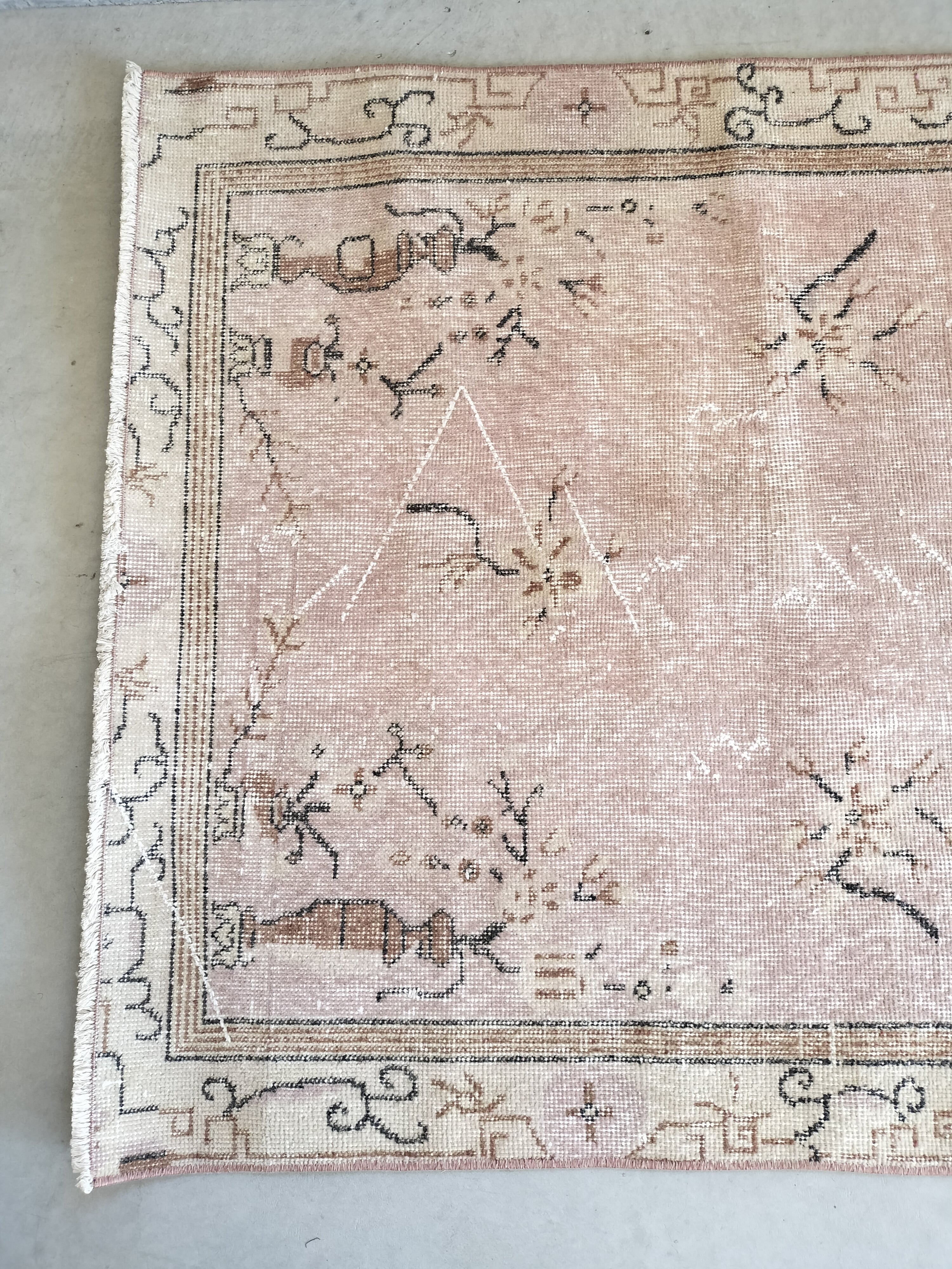 ベージュの縁にくすみピンクがベースになったシノワズリ柄のラグ。上品な柄と色合いはダークカラーの木目の家具によく合いそうです。