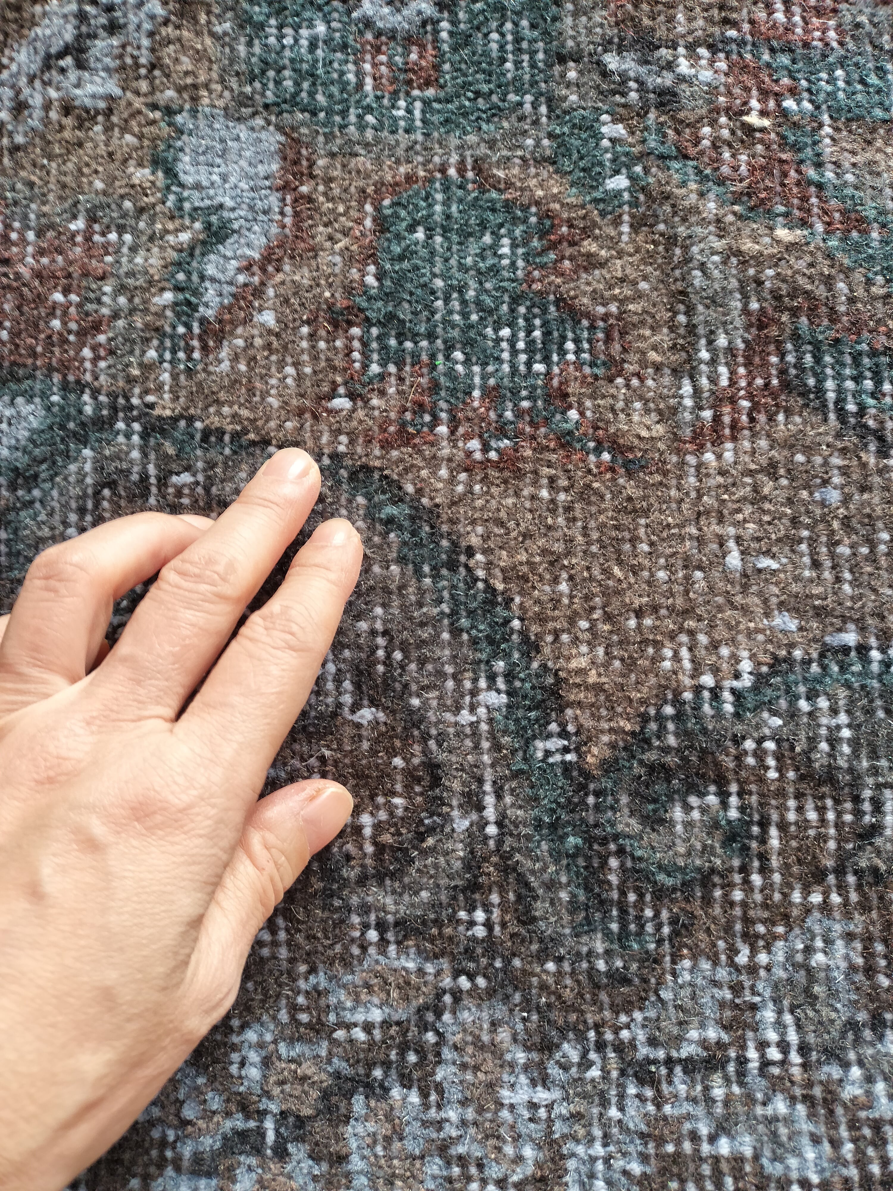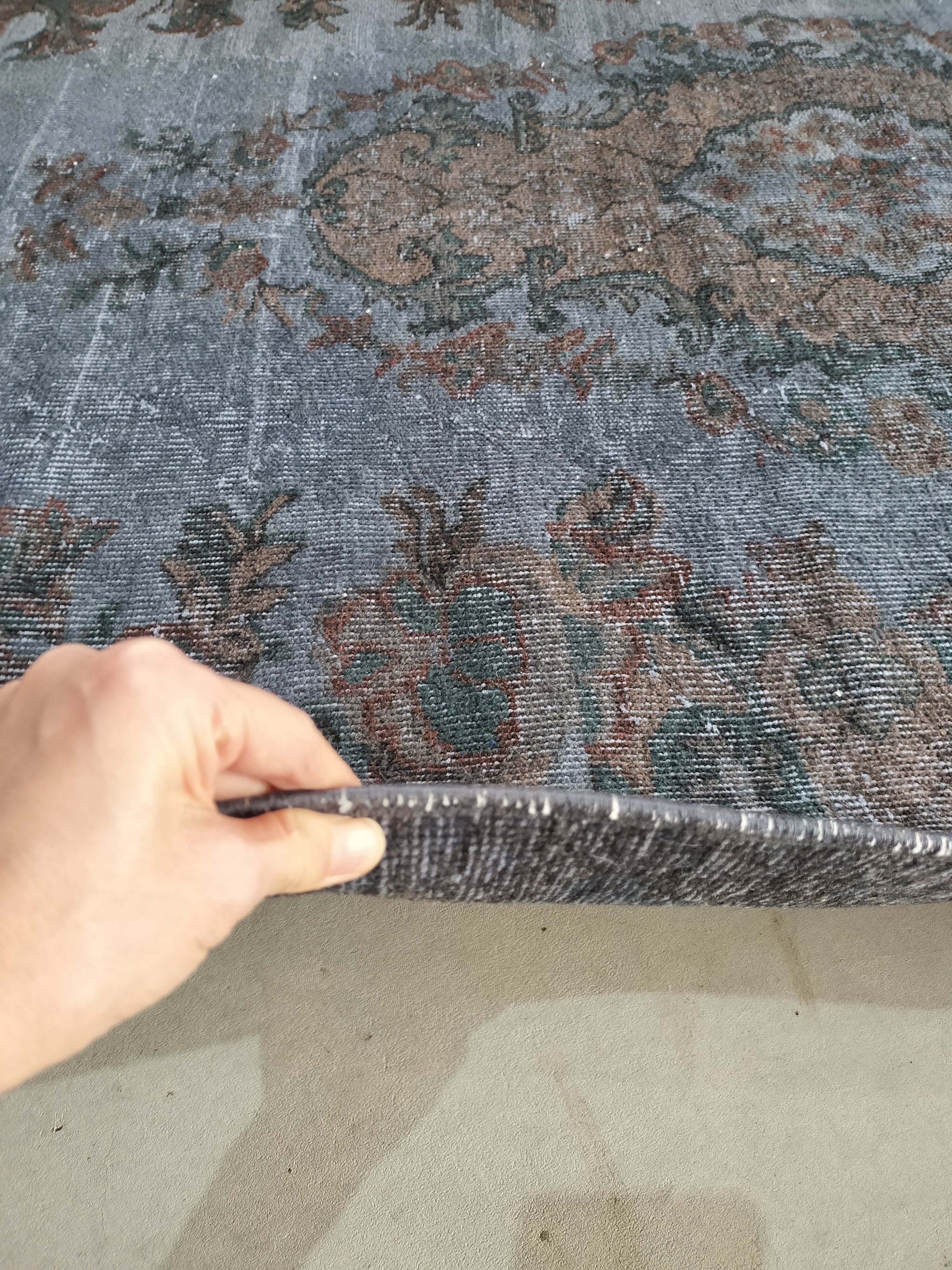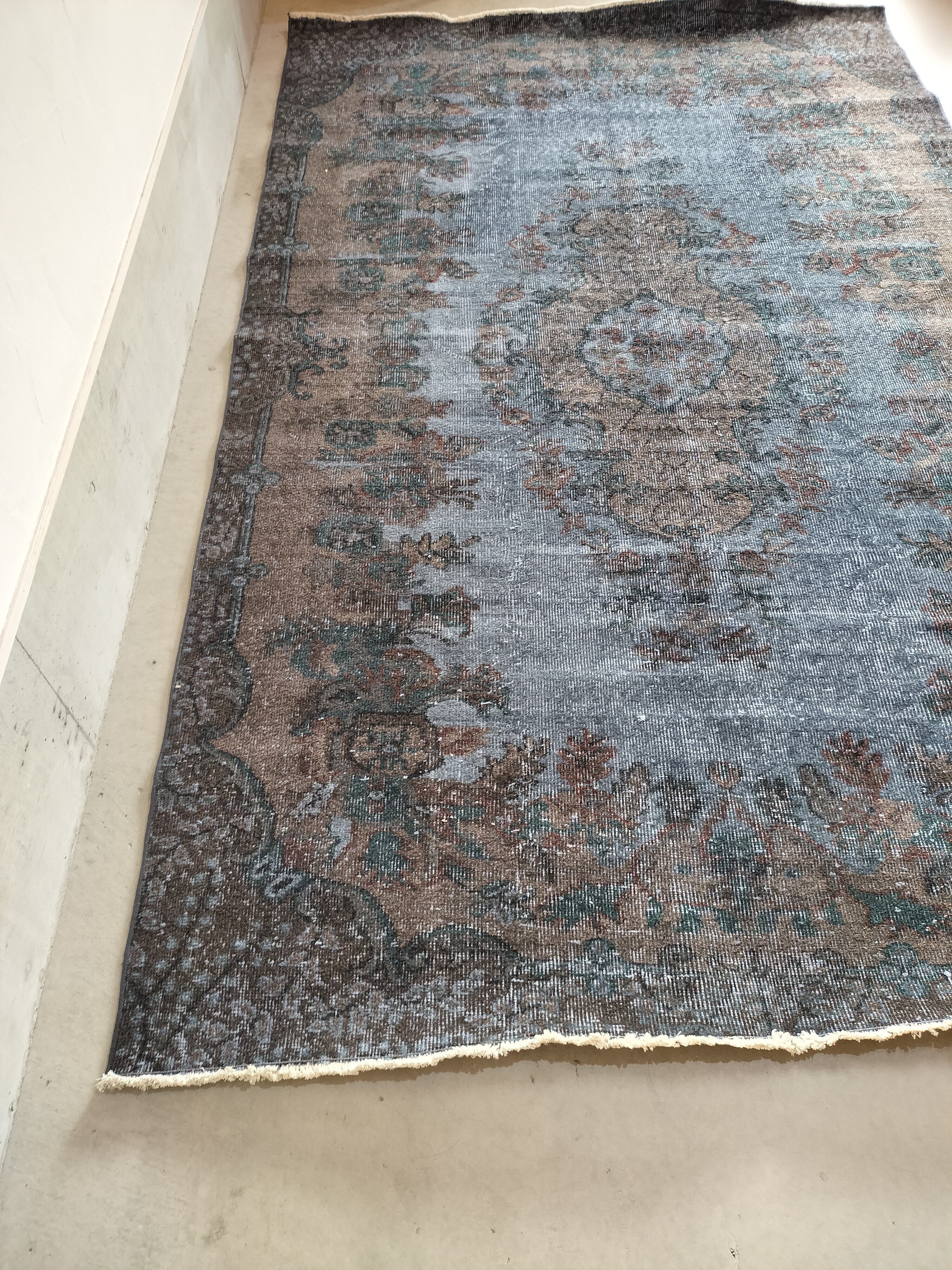 ネイビーがかったグレーでオーバーダイされたヴィンテージトルコラグ。