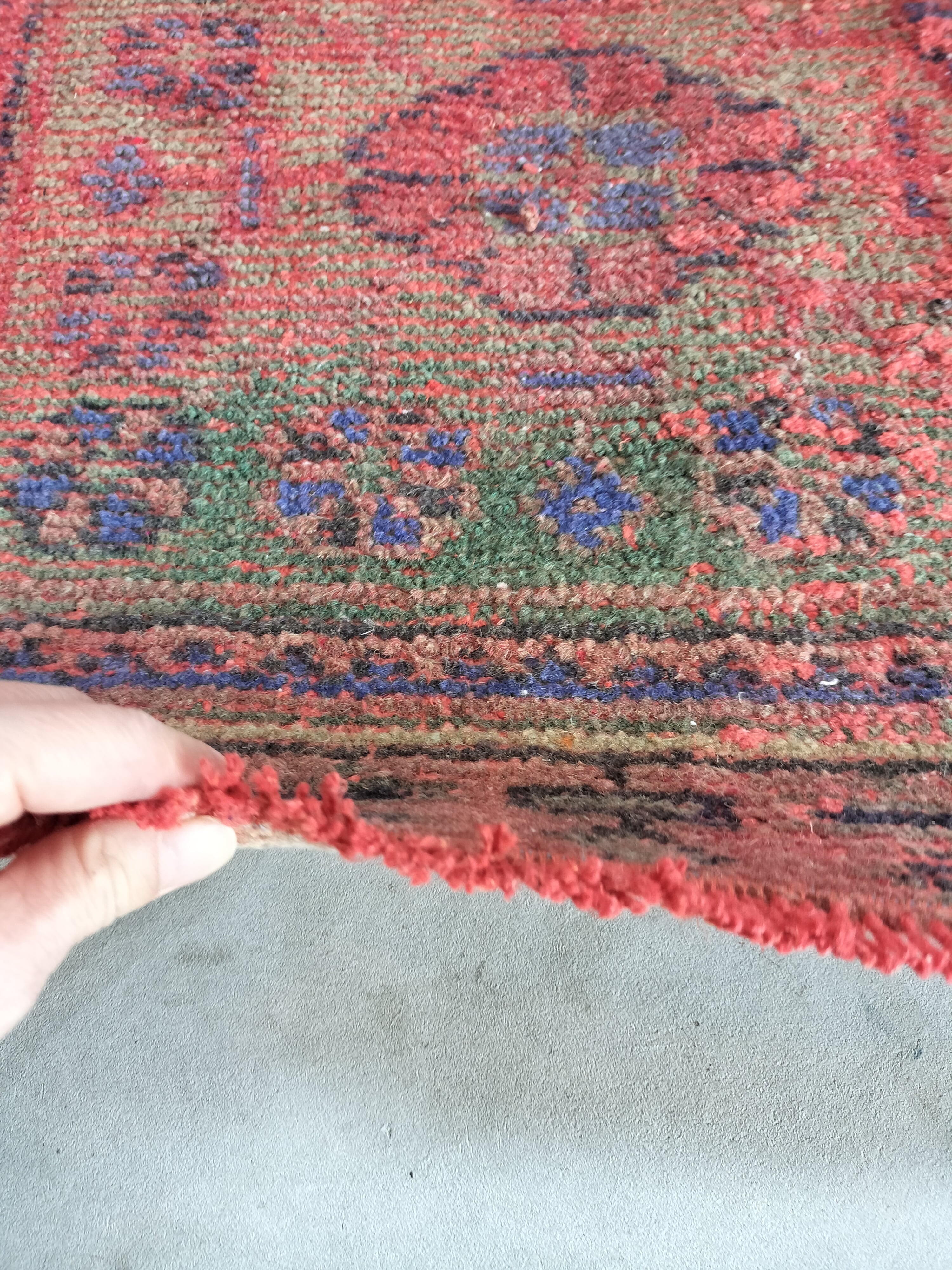こっくりと深い赤に後染めされた格好良いラグ。もとの柄は黒やグリーン、わずかにブルーで浮き上がります。