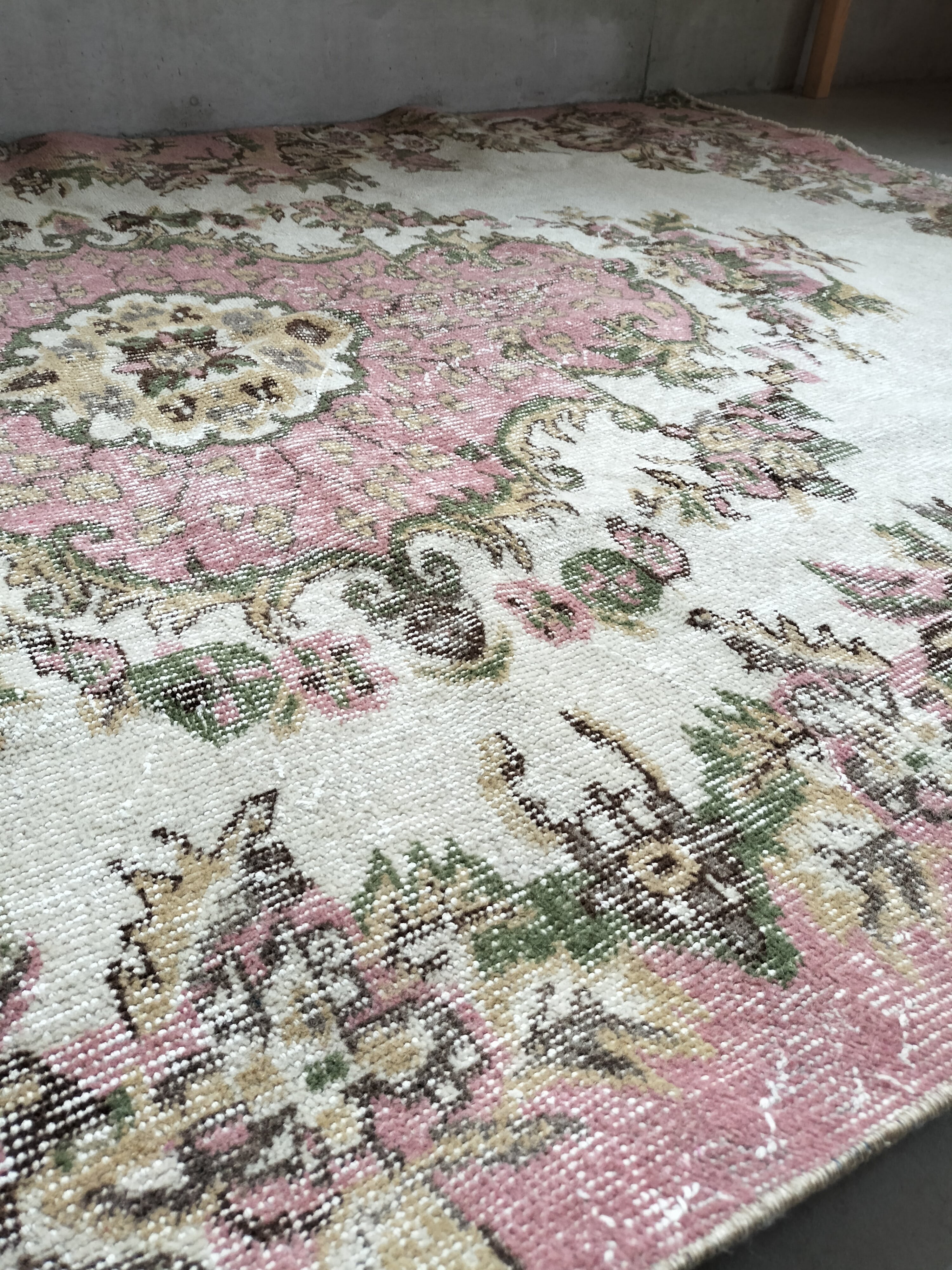 縁とメダリオンはローズピンク、ベースは落ち着いたベージュで柄にはモスグリーンが混じります。ローズピンクが華やかな印象のラグです。