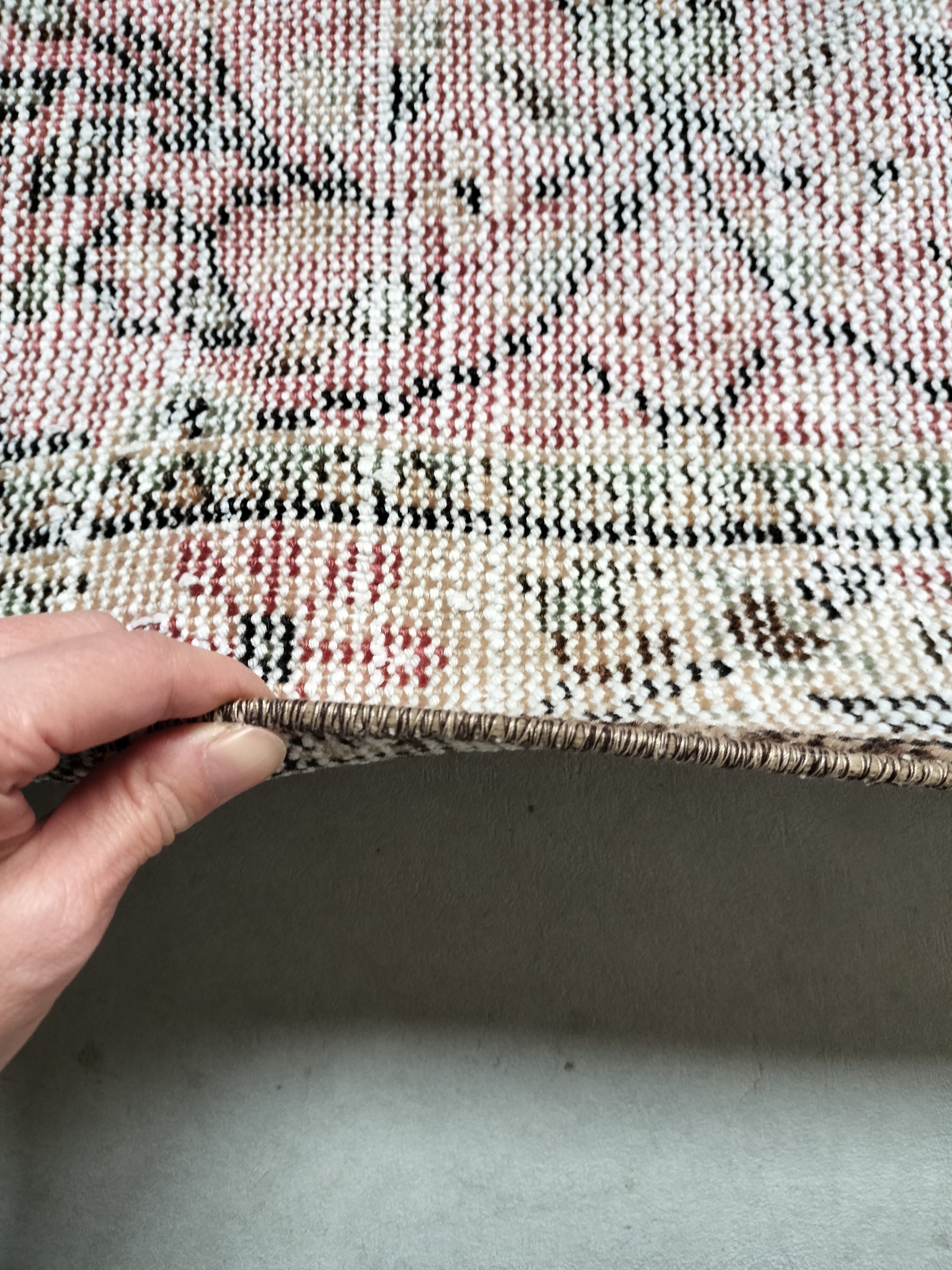 しっかりと刈り込まれウールのピンクがかすれた色合いのフラワーラグ。