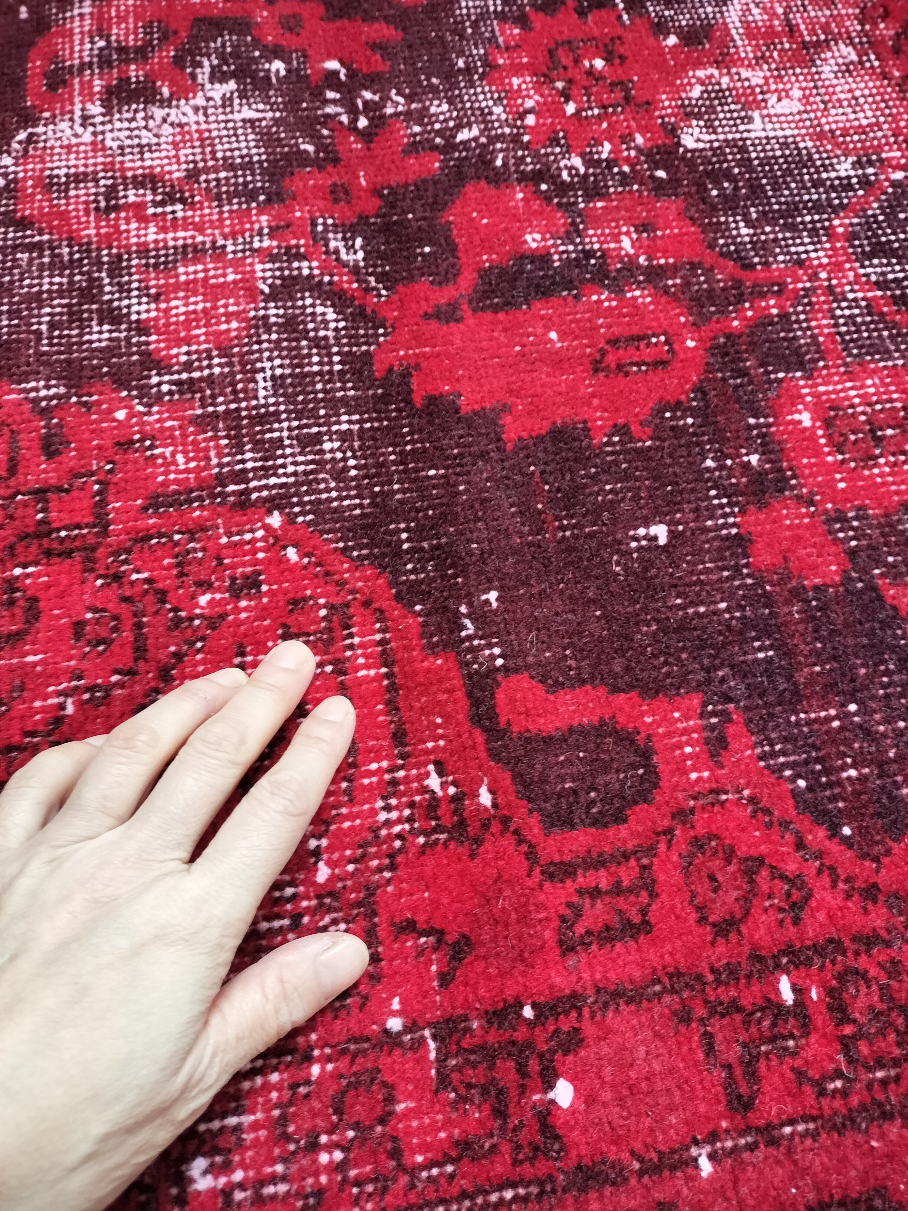 深い色合いのベルベットレッドが美しいヴィンテージラグ。オーバーダイ(後染め)のラグです。