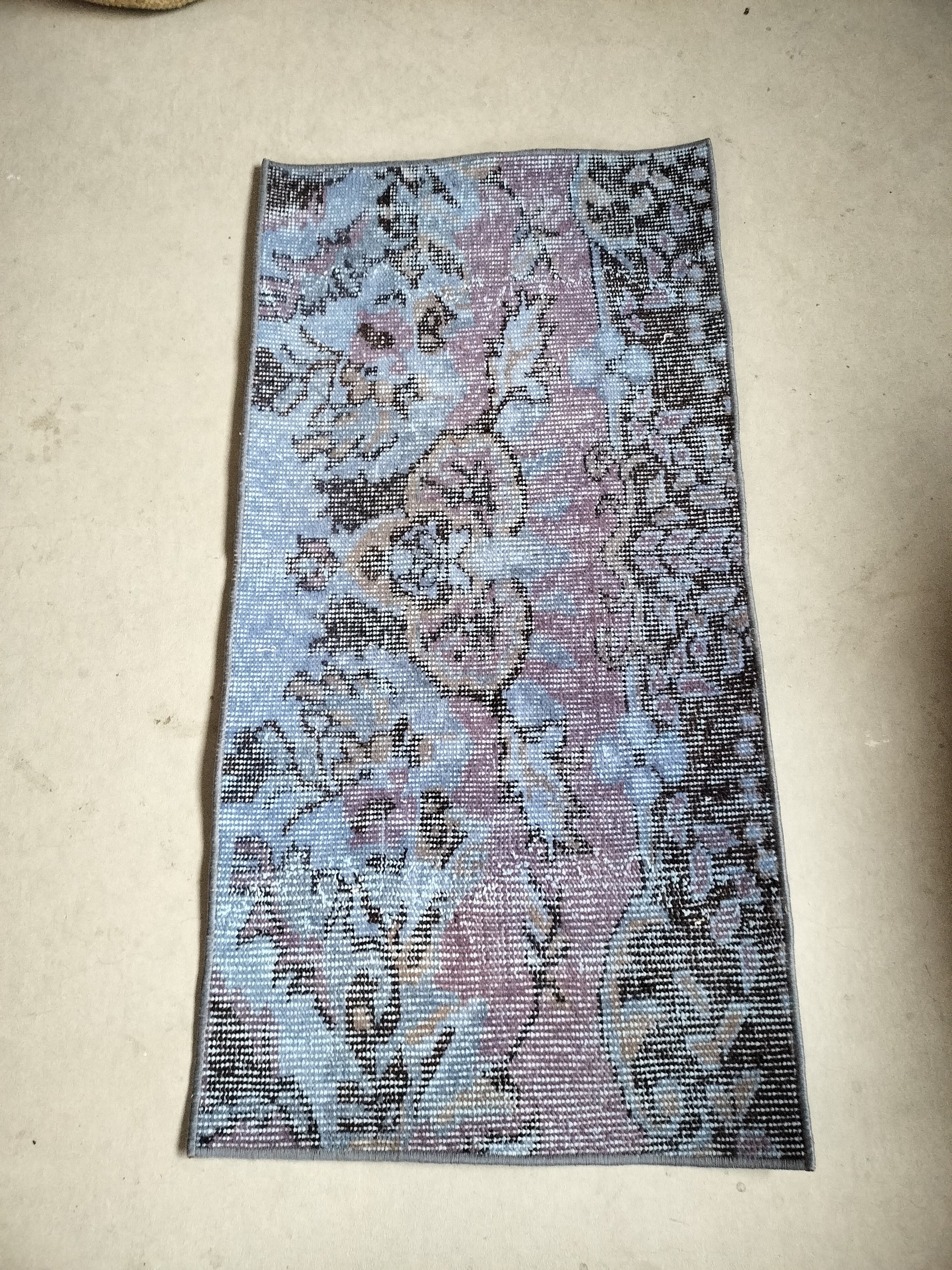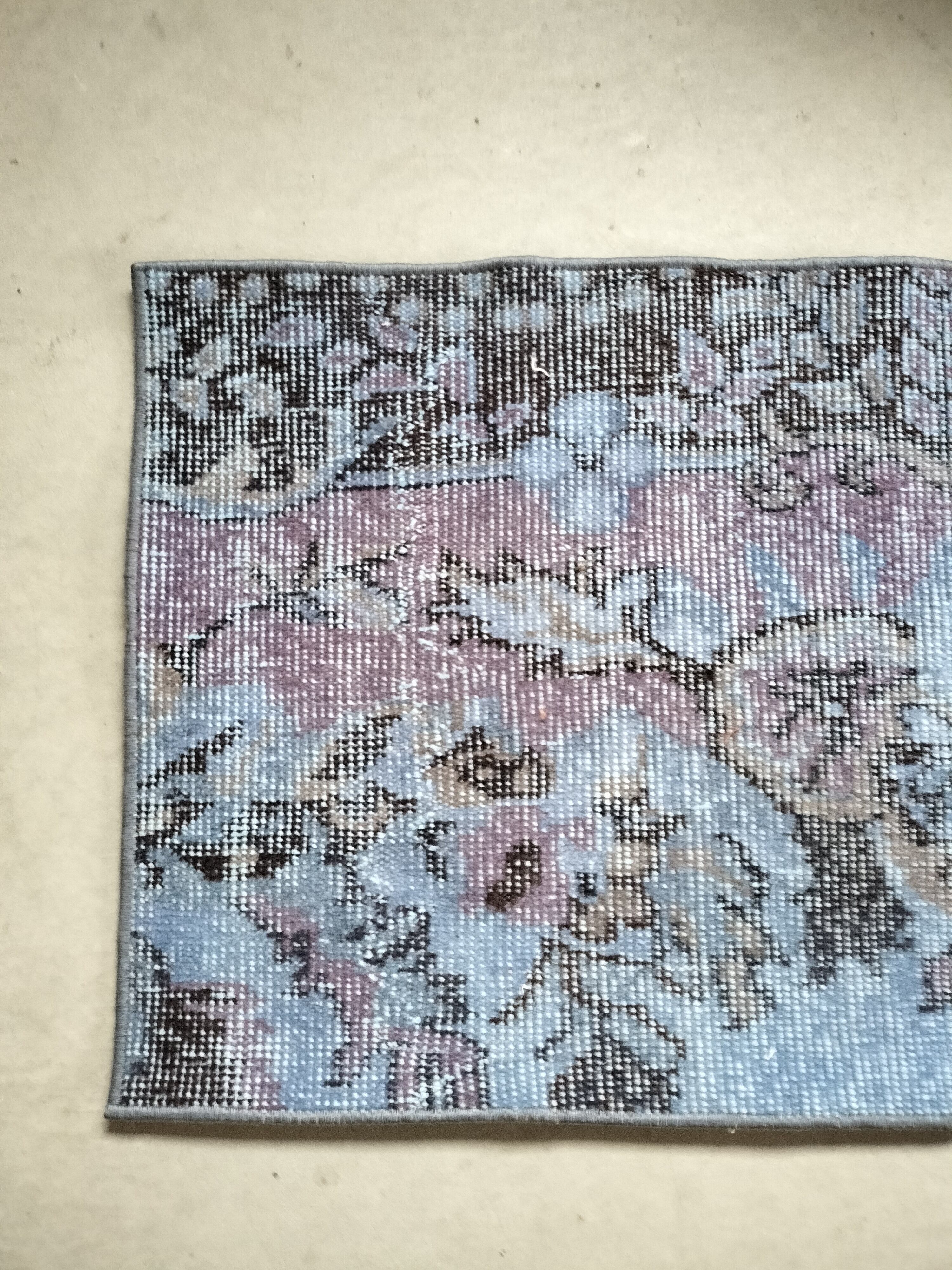 少しグレー味のある美しいブルーでオーバーダイ(後染め)されたスモールラグ。もとの柄はブラックやラベンダー、マスタードで浮かび上がり、上品な印象です。