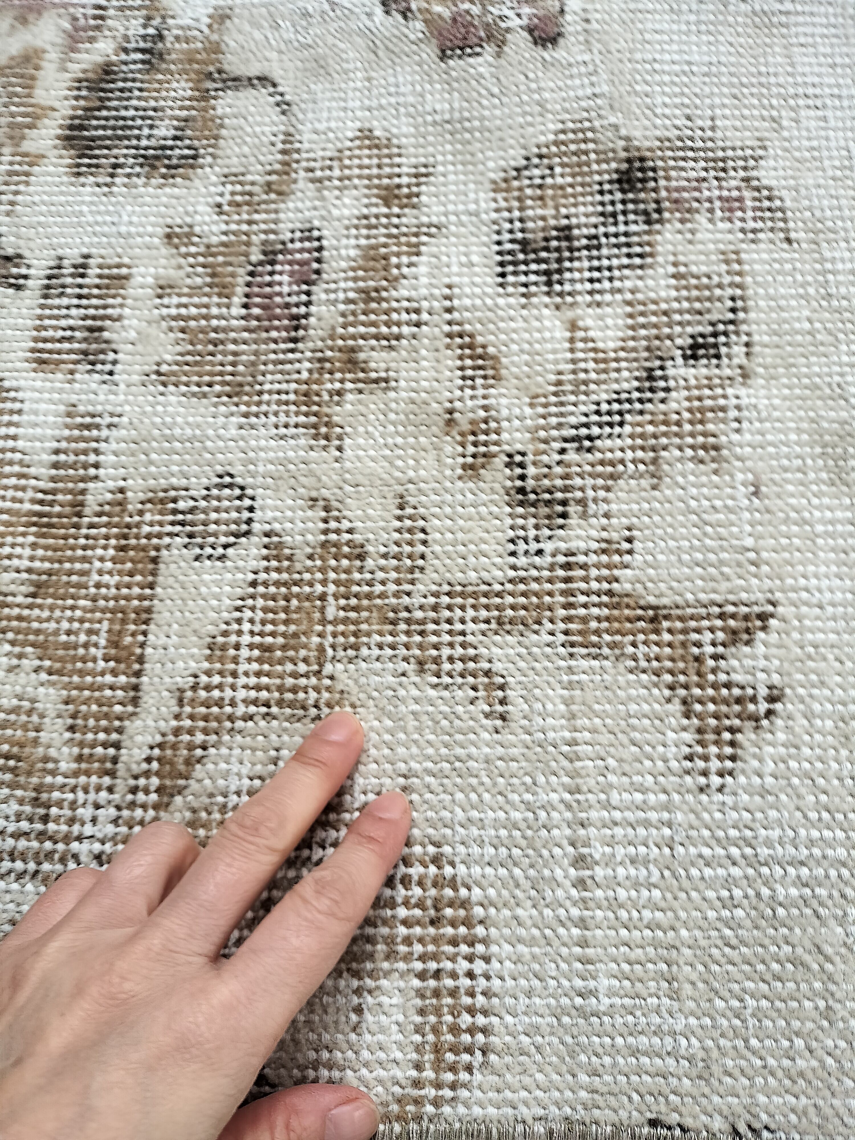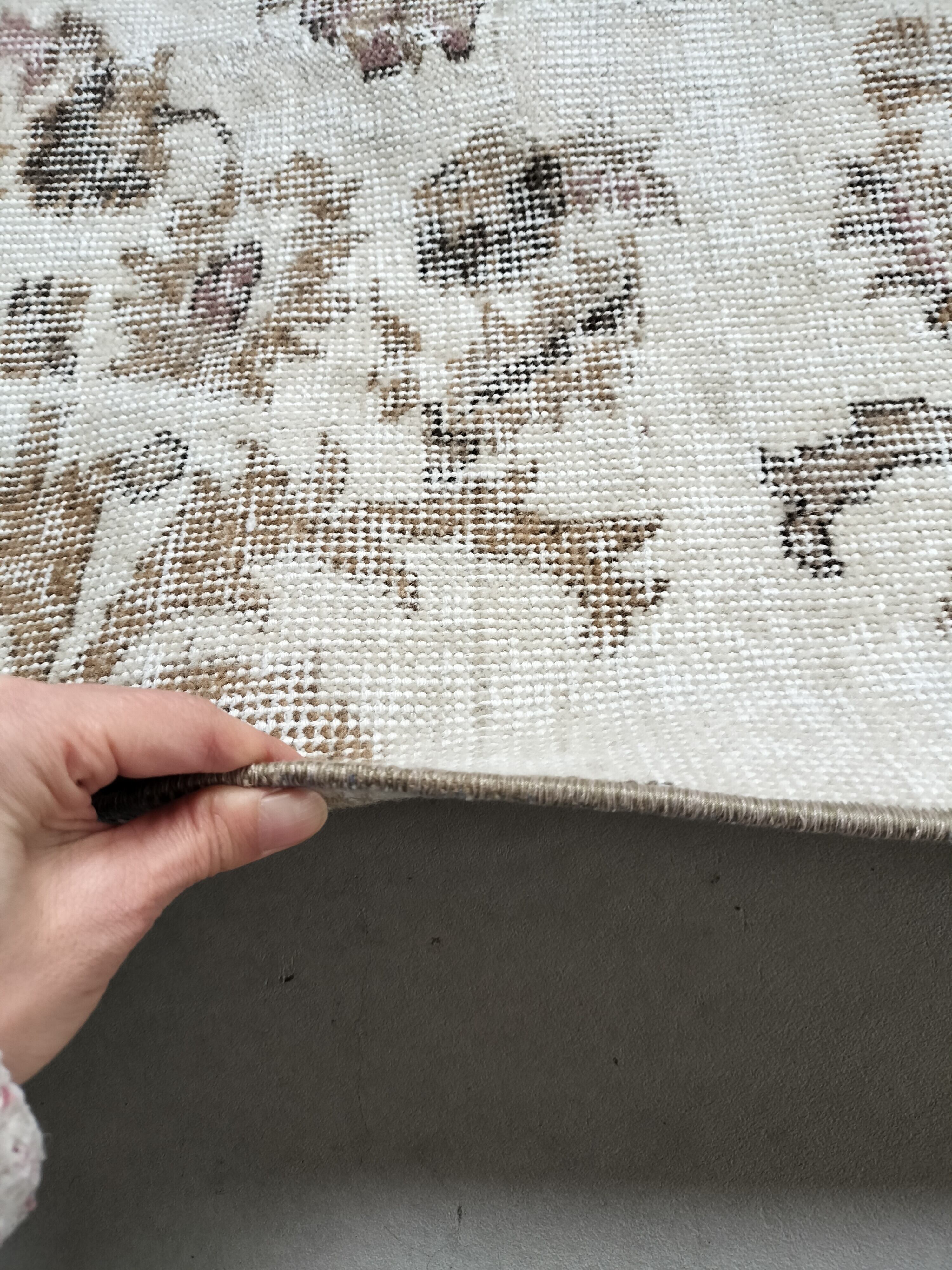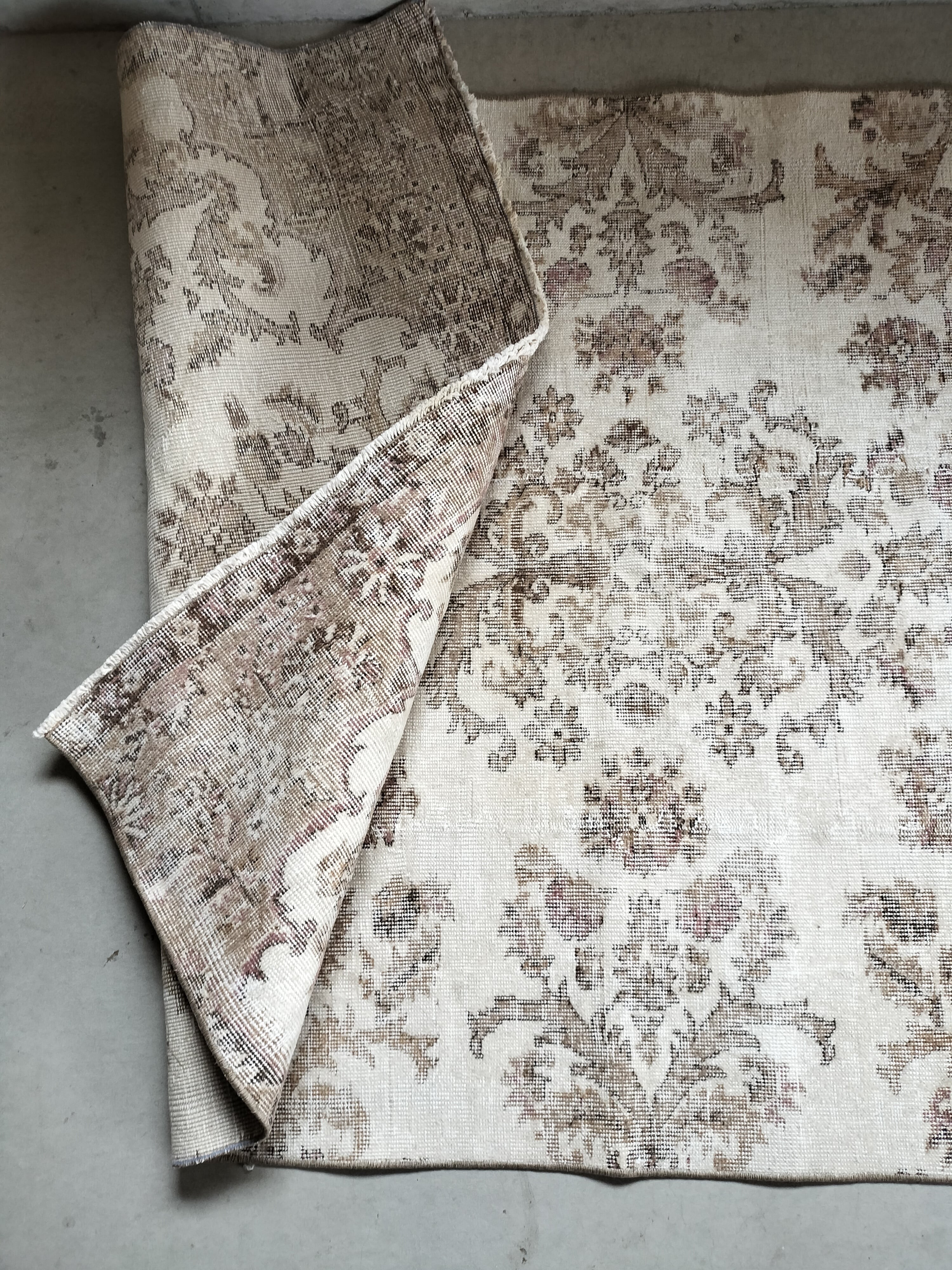 明るめのベージュをベースにカフェオレカラーでボタニカルな柄が全体に入るヴィンテージトルコラグ。