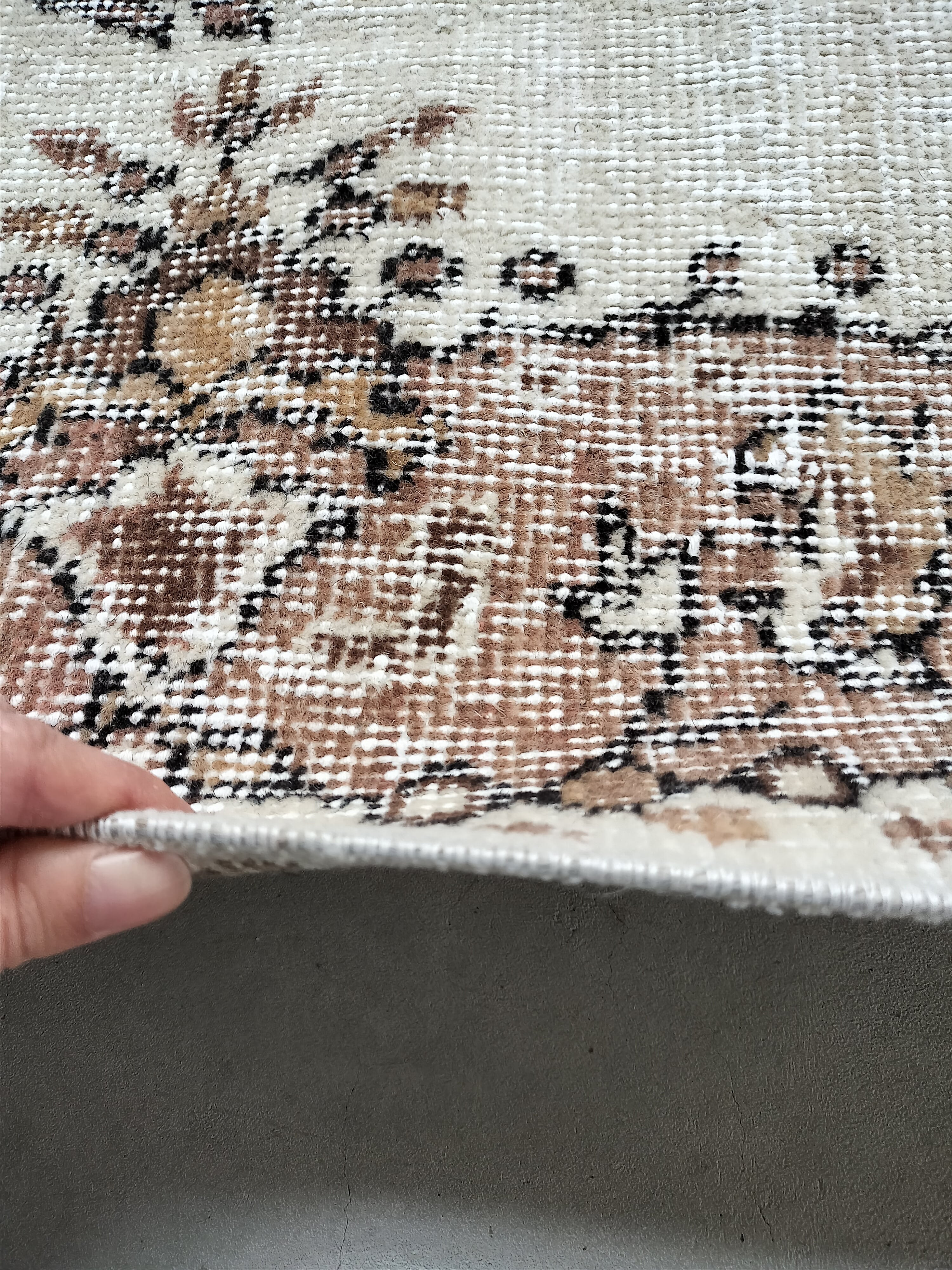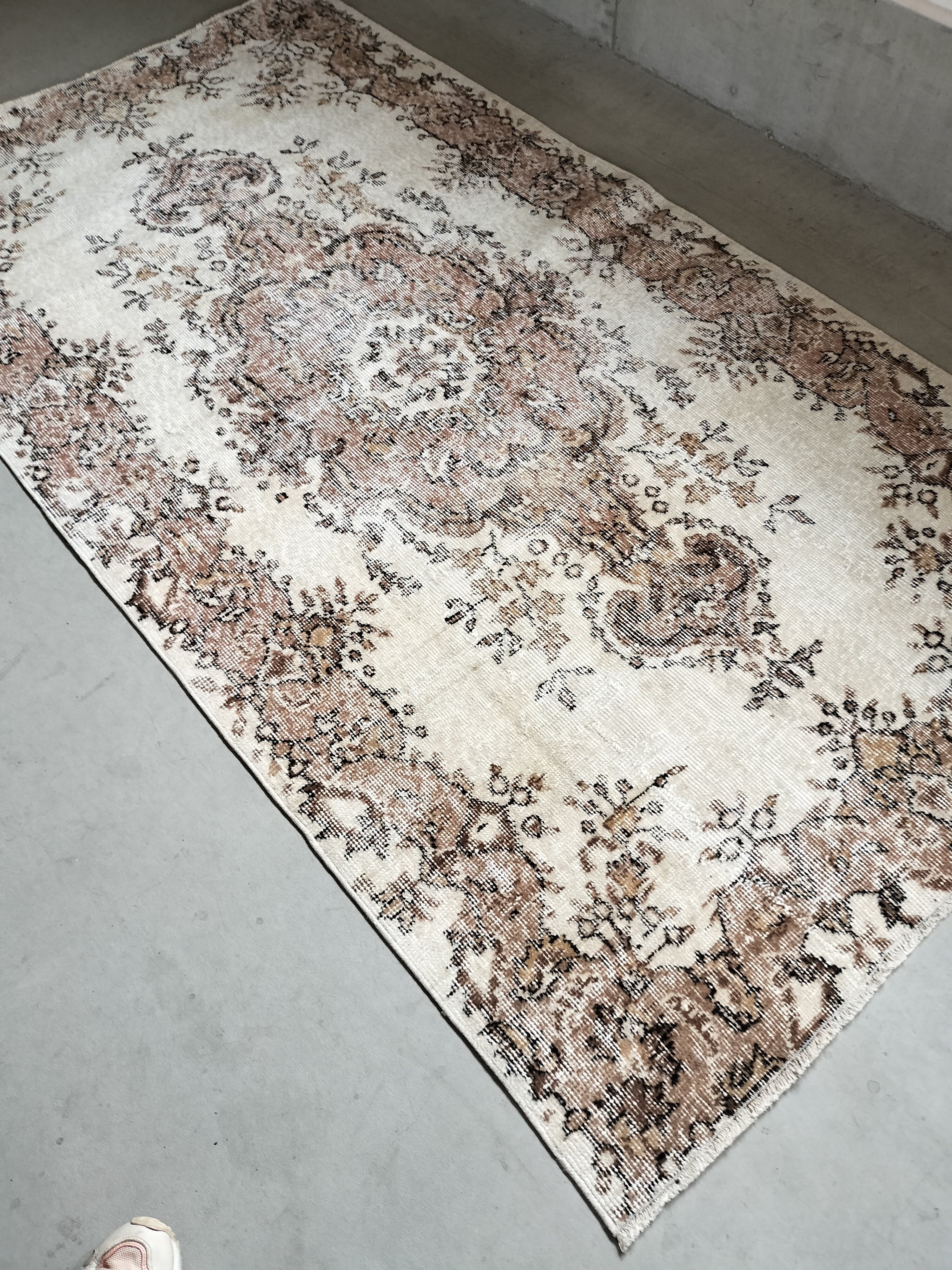 明るめのベージュをベースにココアブラウンで柄が入るヴィンテージトルコラグ。マスタードやブラックも混じりシックでインテリアに合わせやすいラグです。