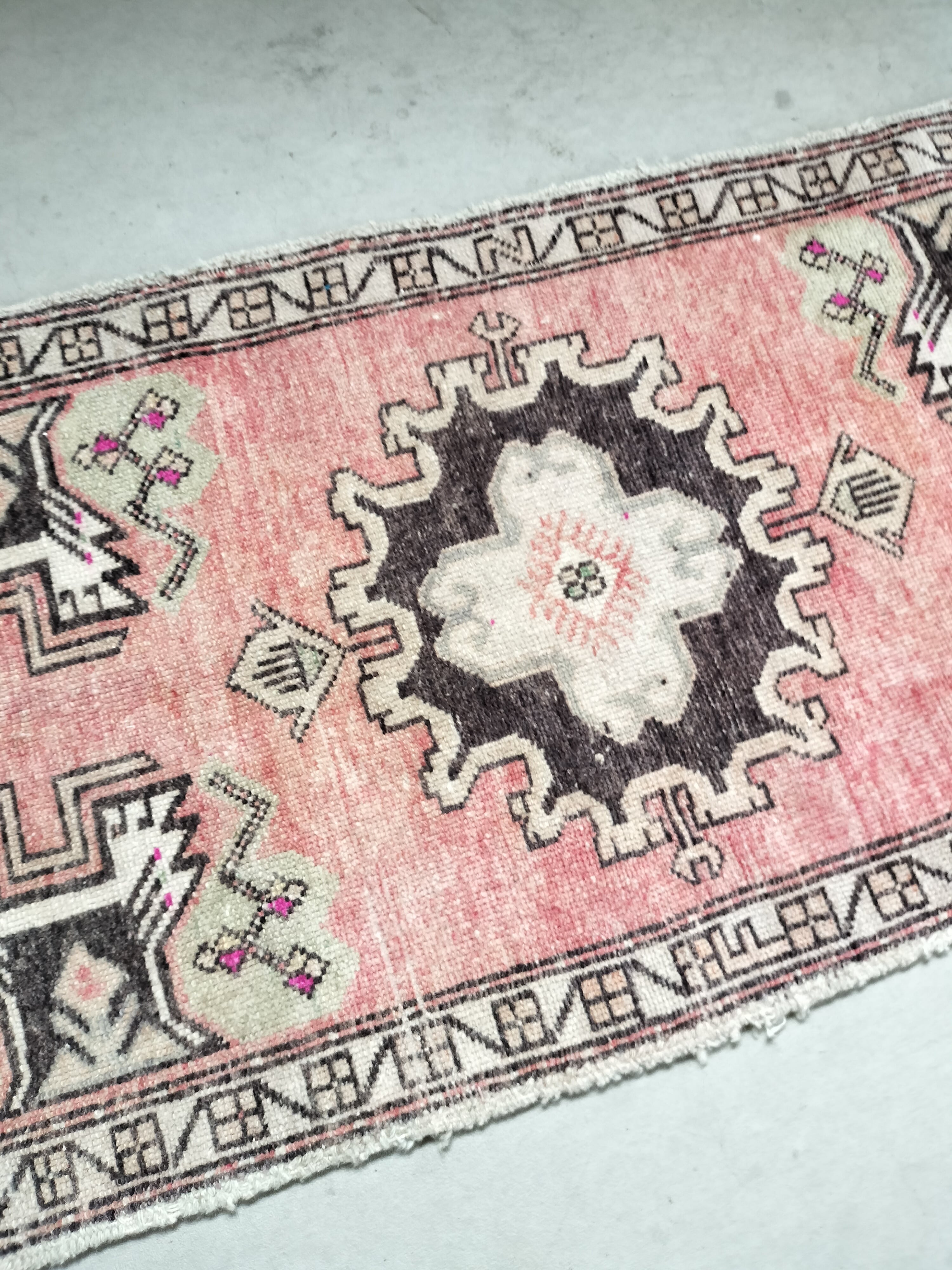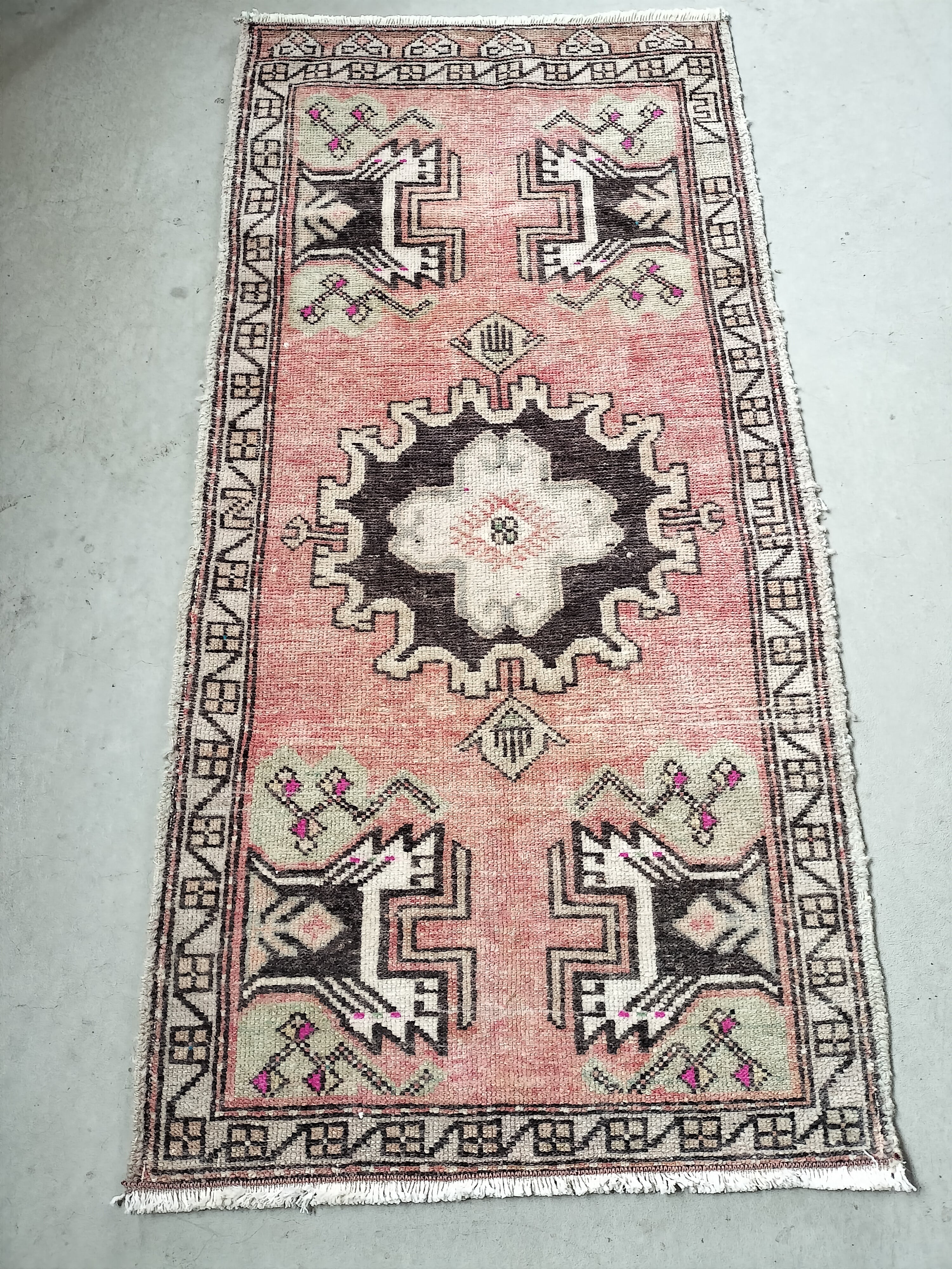 優しい色味のサーモンピンクをブラウンの柄が引き締めるヴィンテージトルコラグ。アクセントにネオンピンクが入りおしゃれです。
