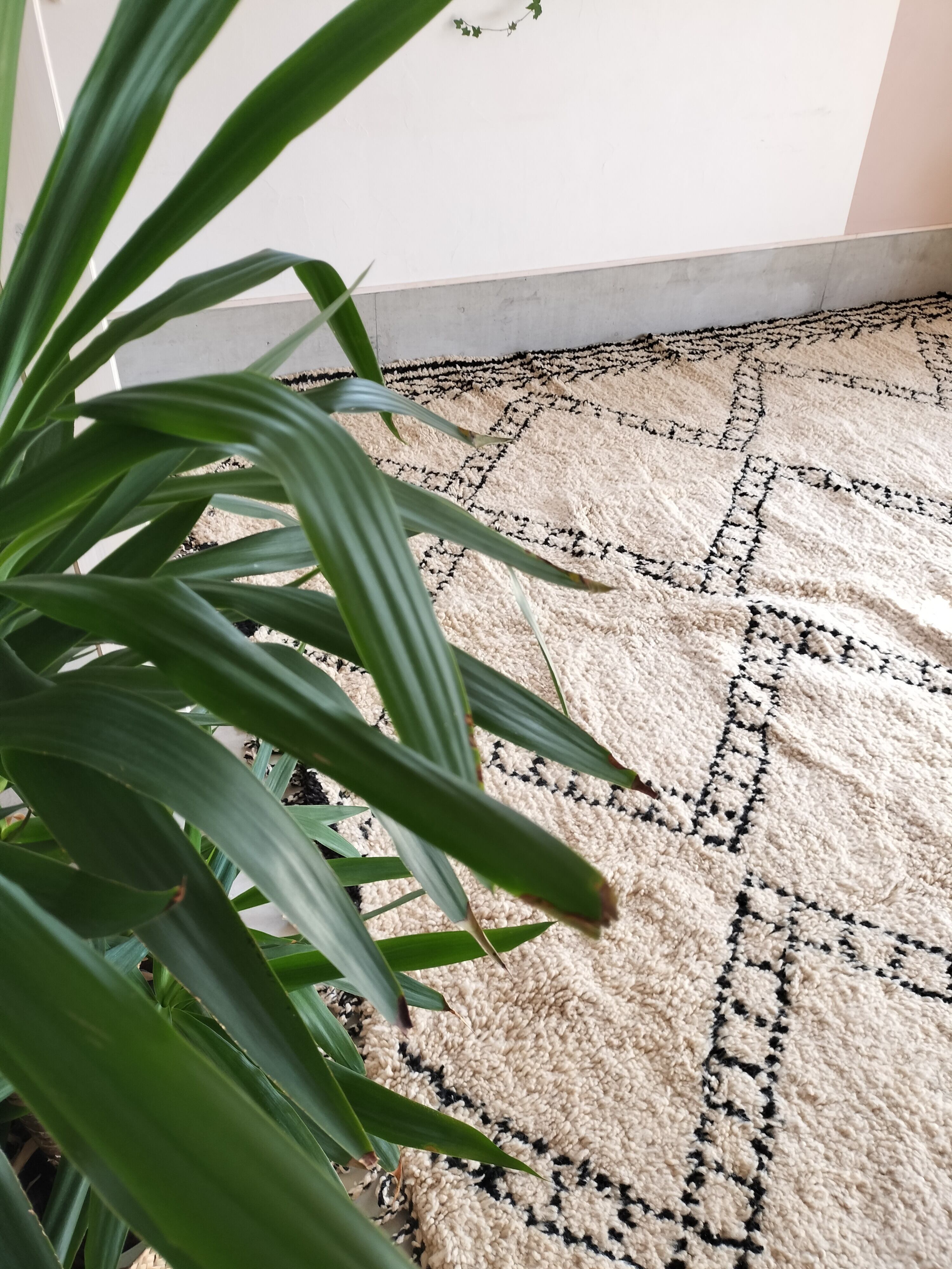 羊のもつそのままの色を生かしたアイボリーに黒の模様。黄味の強いアイボリーです。二重のダイヤモンド柄はかっこ良い雰囲気で男性的なインテリアやBohoインテリアによく合います。フリンジも黒白2色が混ざり職人の丁寧な仕事ぶりを感じられるラグです。他に類を見ないほどの大判ですごい迫力。手織りのラグのクラフト感とこの大きさ。日本ではなかなかお目にかかれないです。