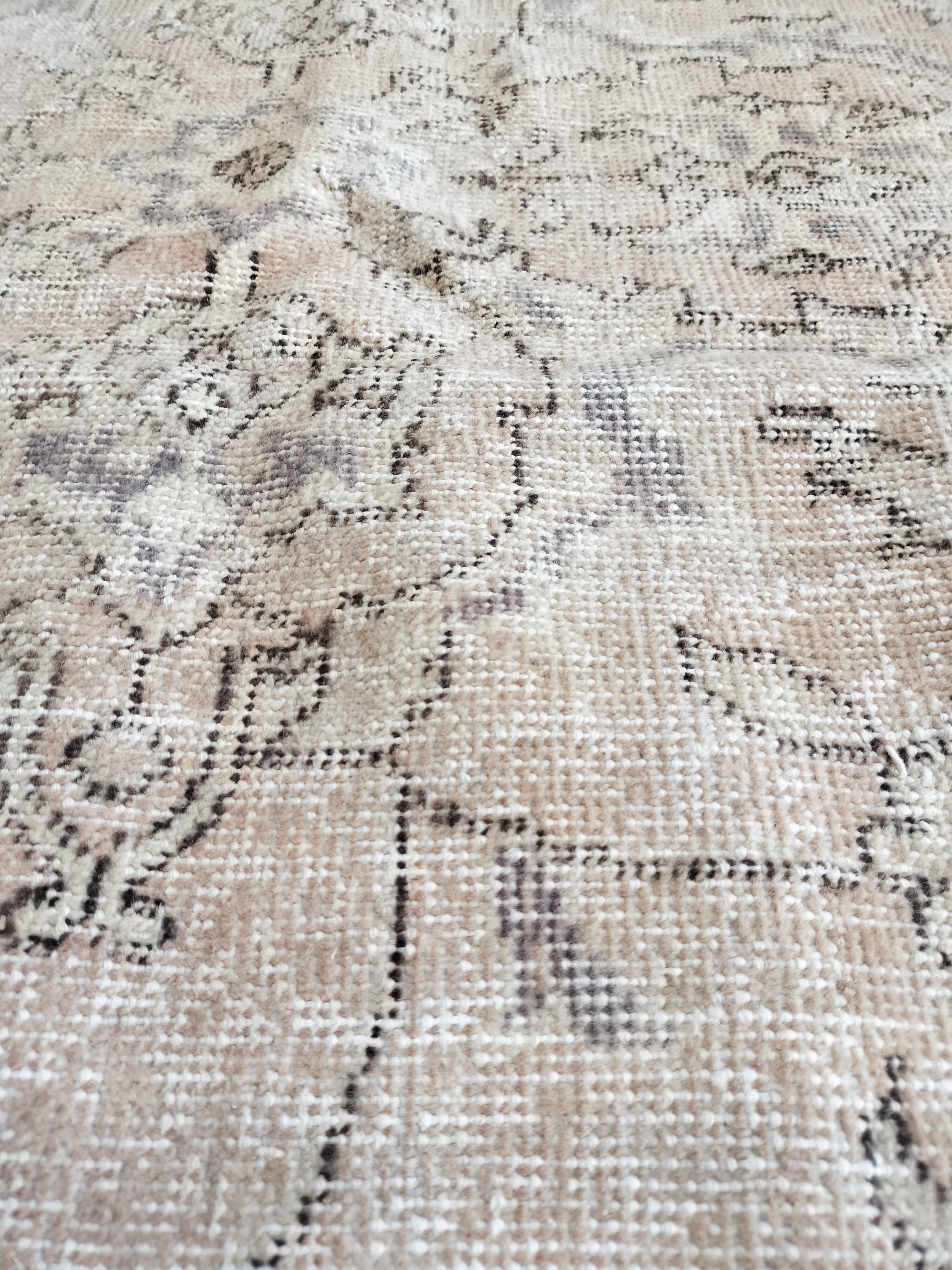 ごく淡いサーモンピンクをベースに、ダークブラウンのラインと紫がかった淡いグレーで模様が入るヴィンテージラグ。
