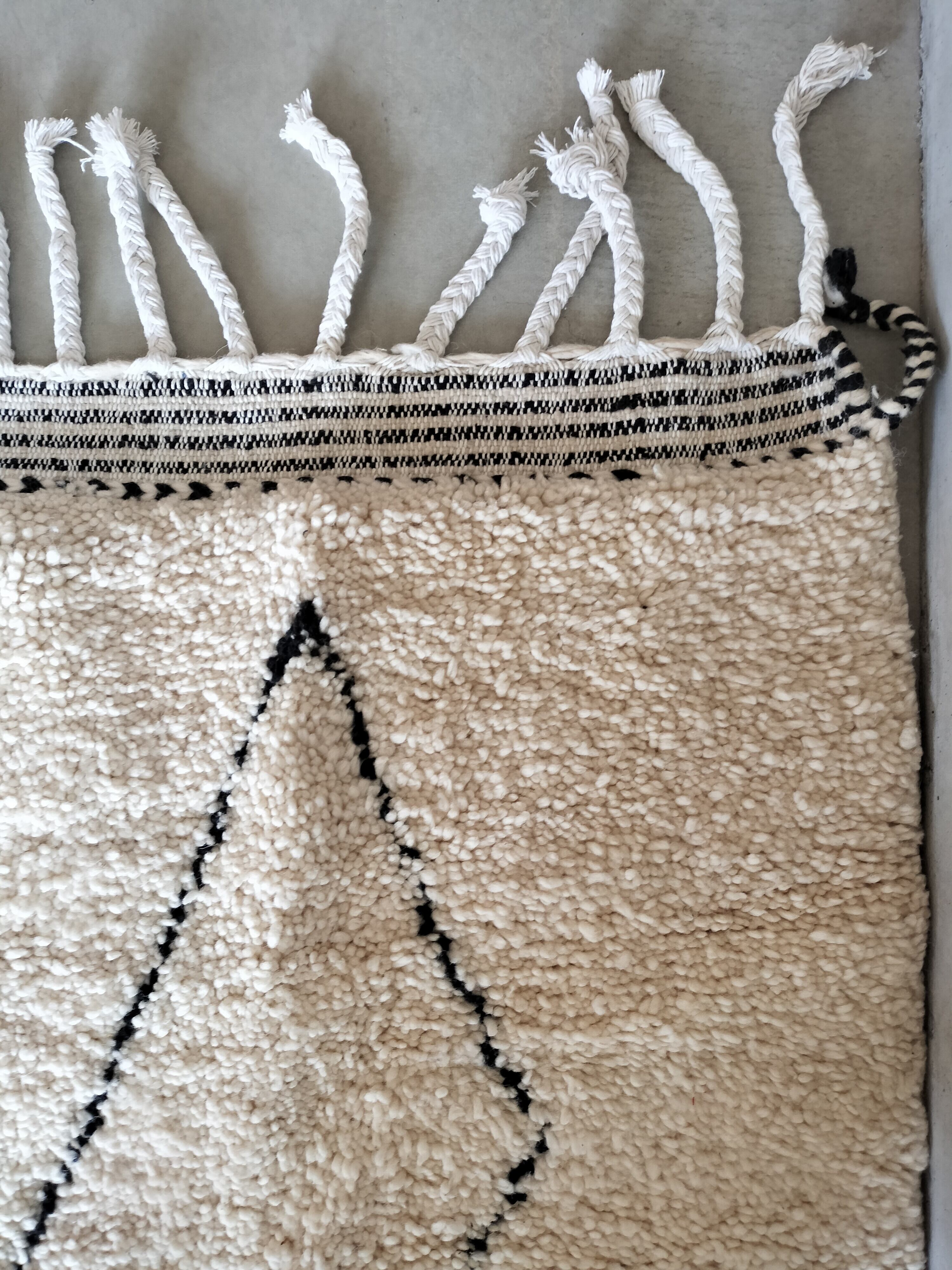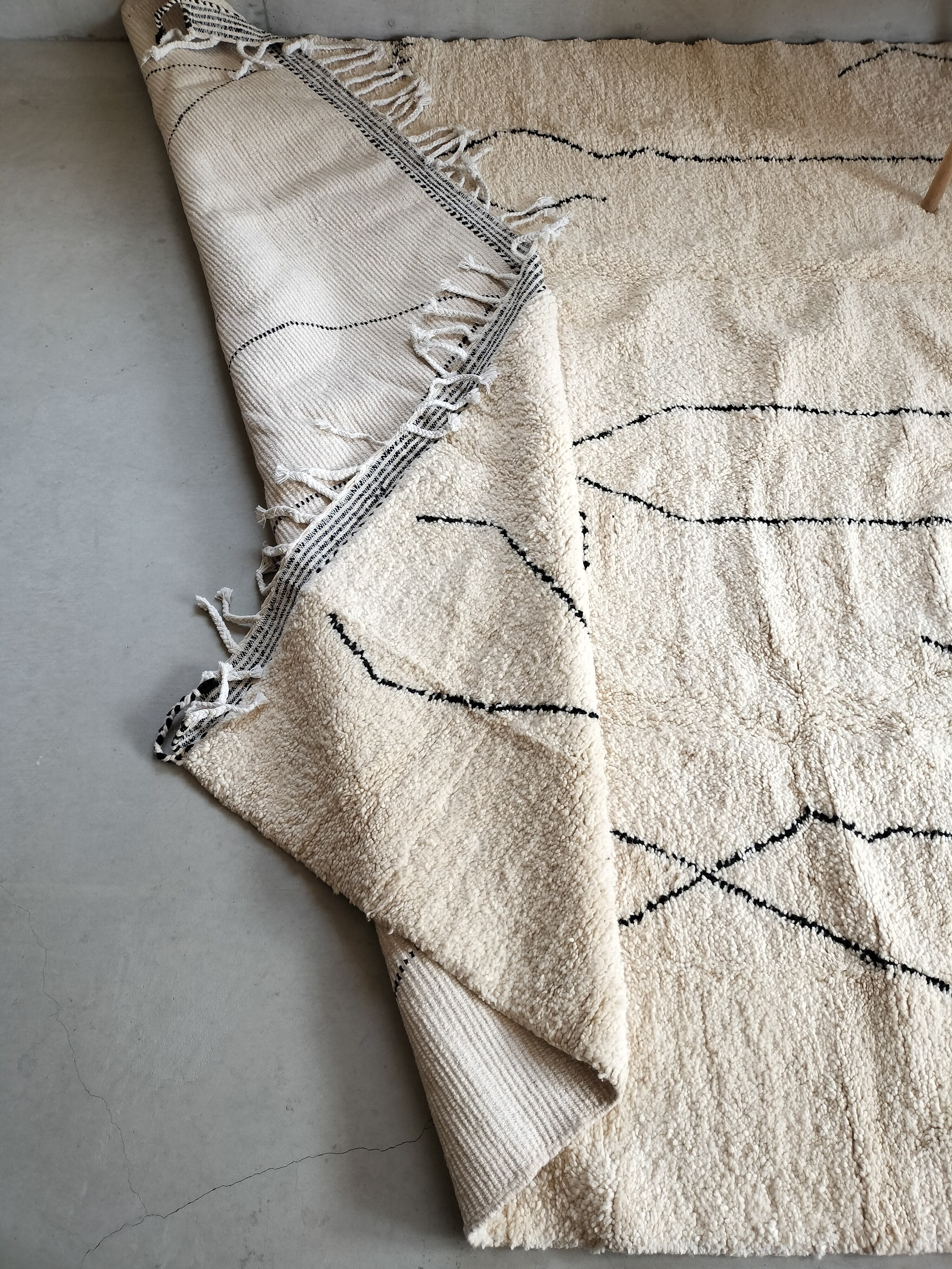 新品のアイボリーに黒で模様が入るモダンなベニワレンラグ。