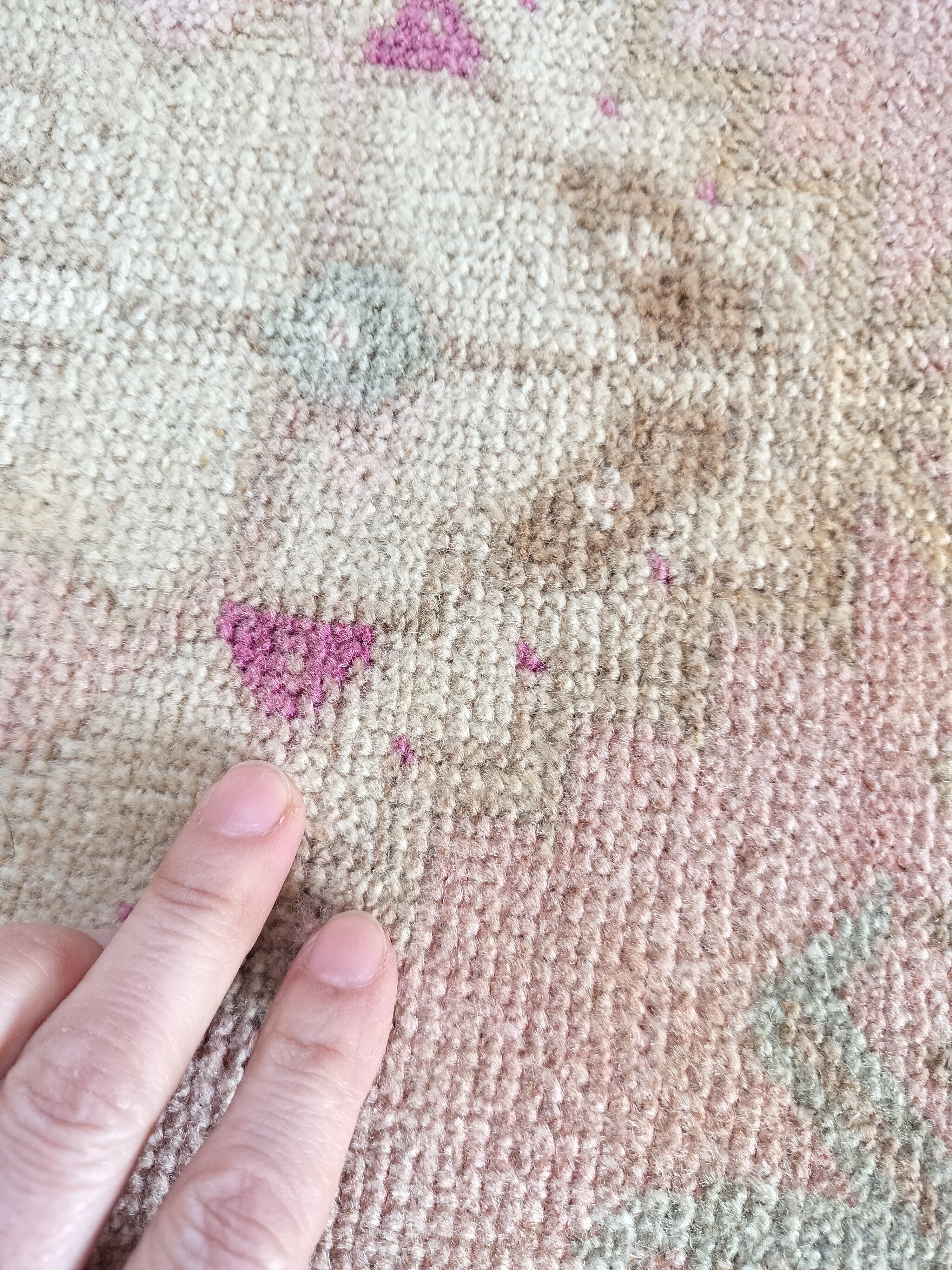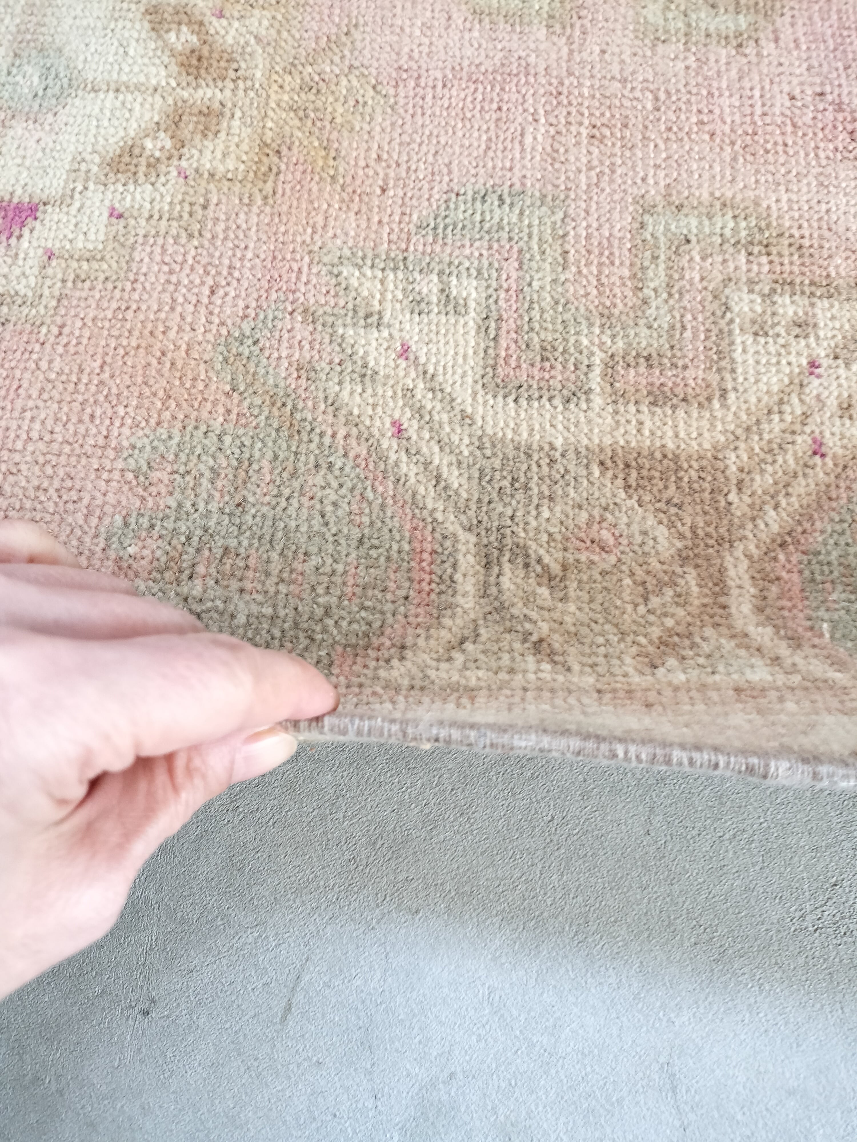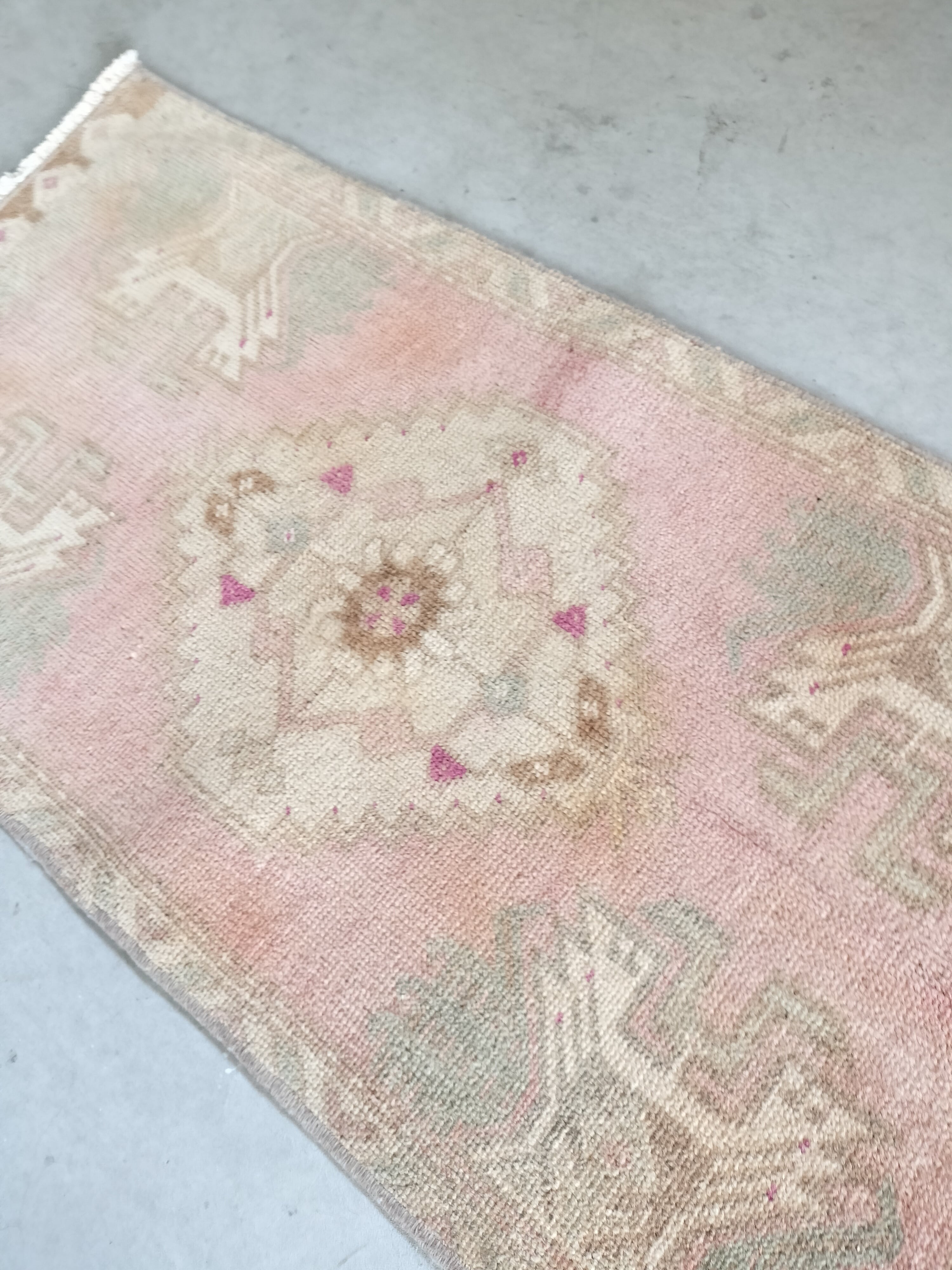 淡いペールピンクをベースに、両端にブラウン、中には淡い水色とアクセントのネオンピンクが入るラグ。