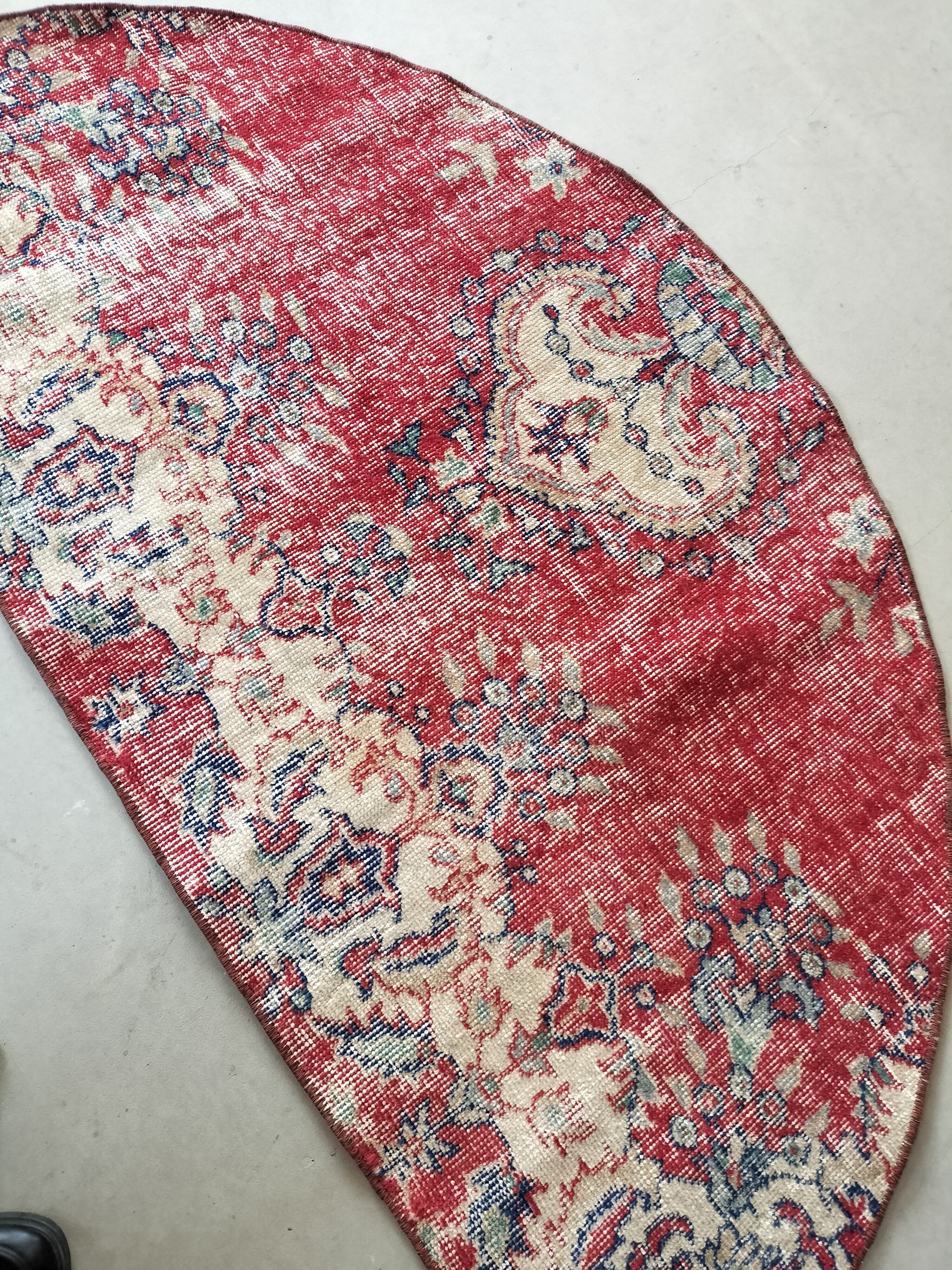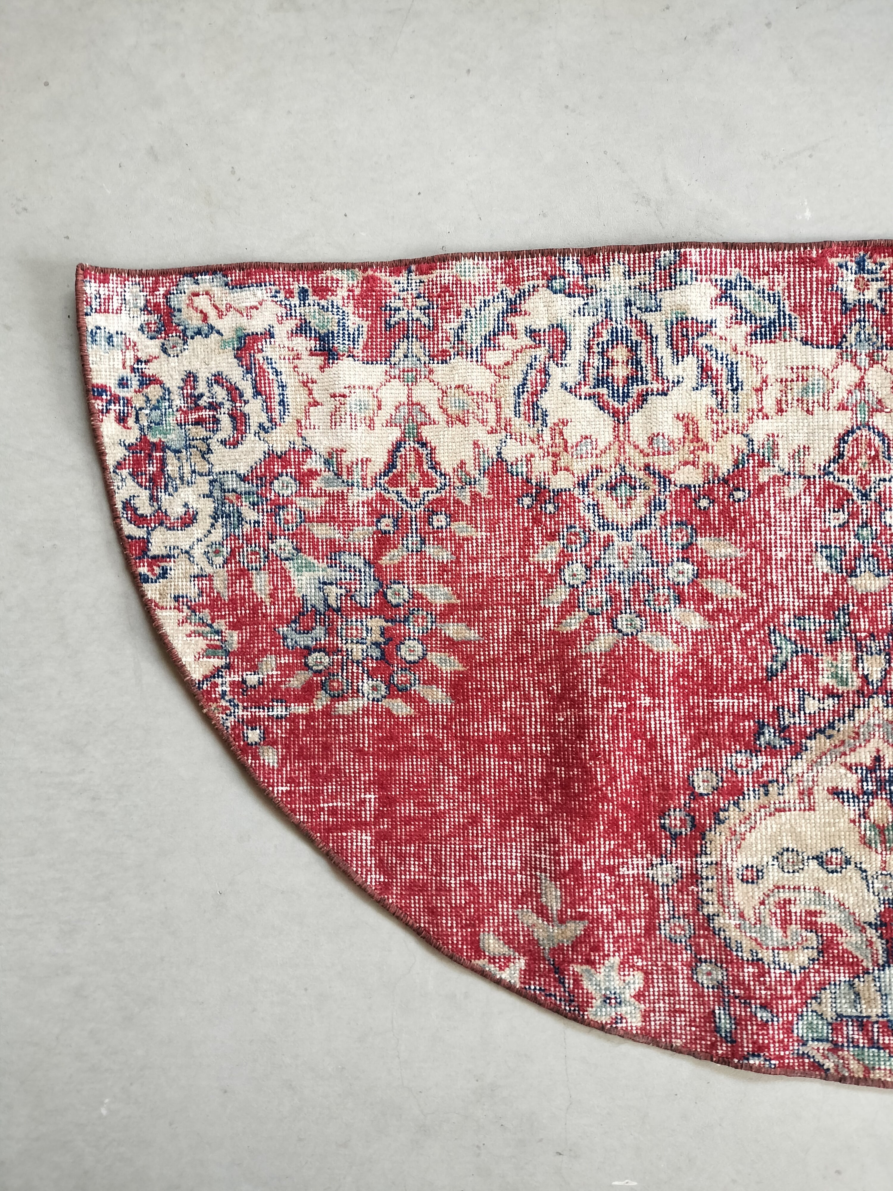 深みのあるレッドをベースに、きりっとしたロイヤルブルーやベージュで模様の入る半円型のラグ。