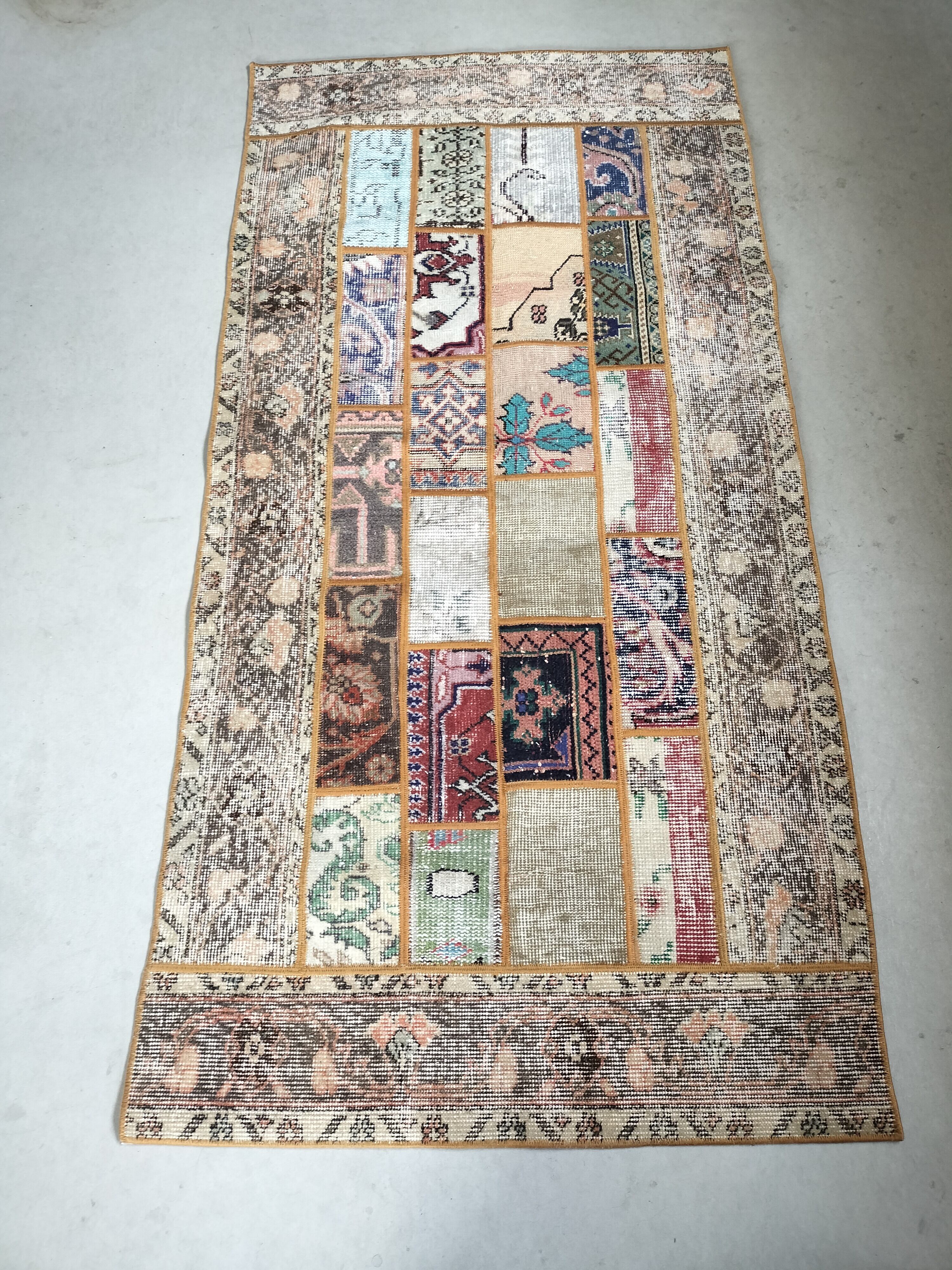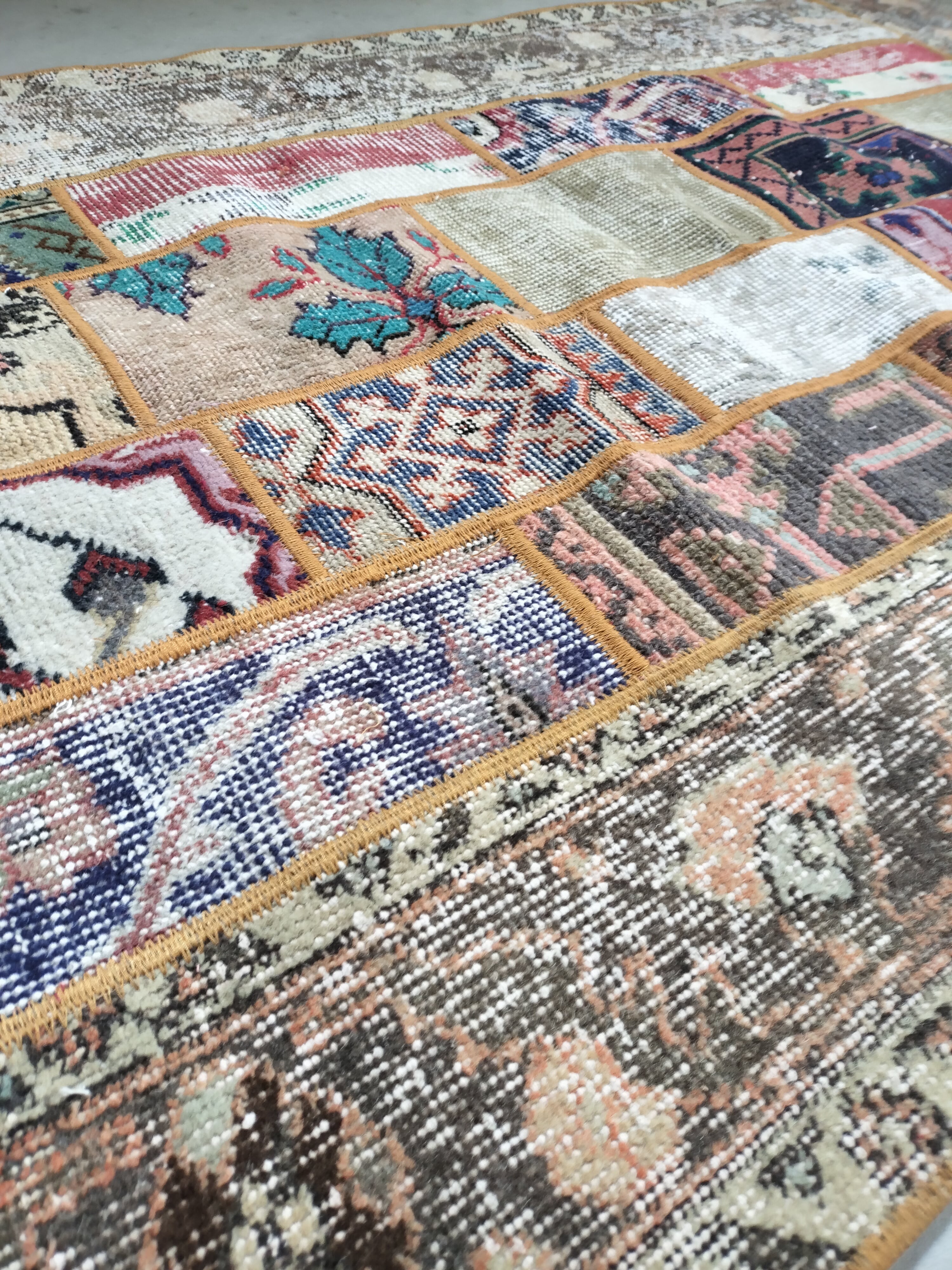 複数のラグを丁寧につなぎ合わせ新しい一枚に生まれ変わったパッチワークラグ。