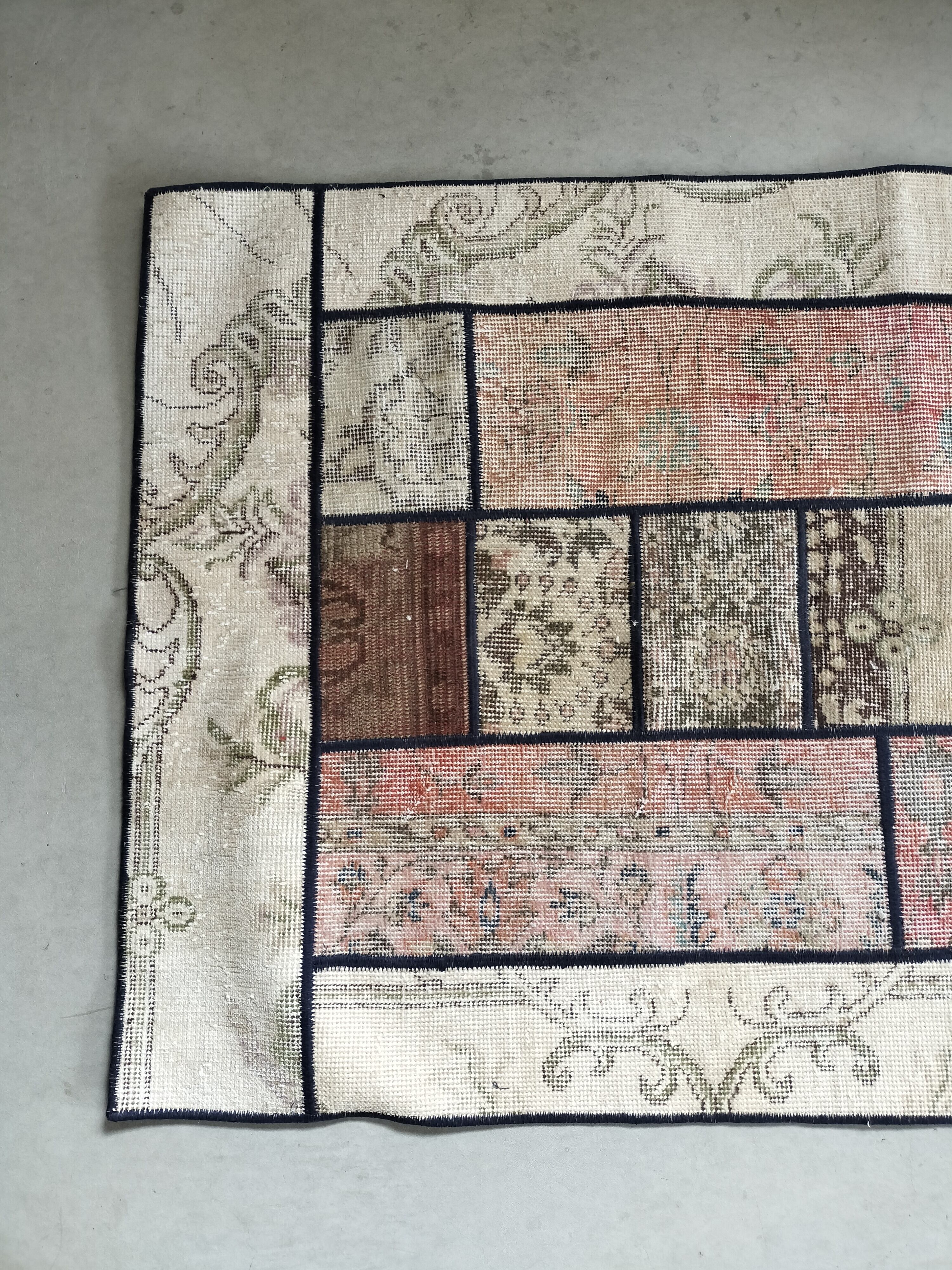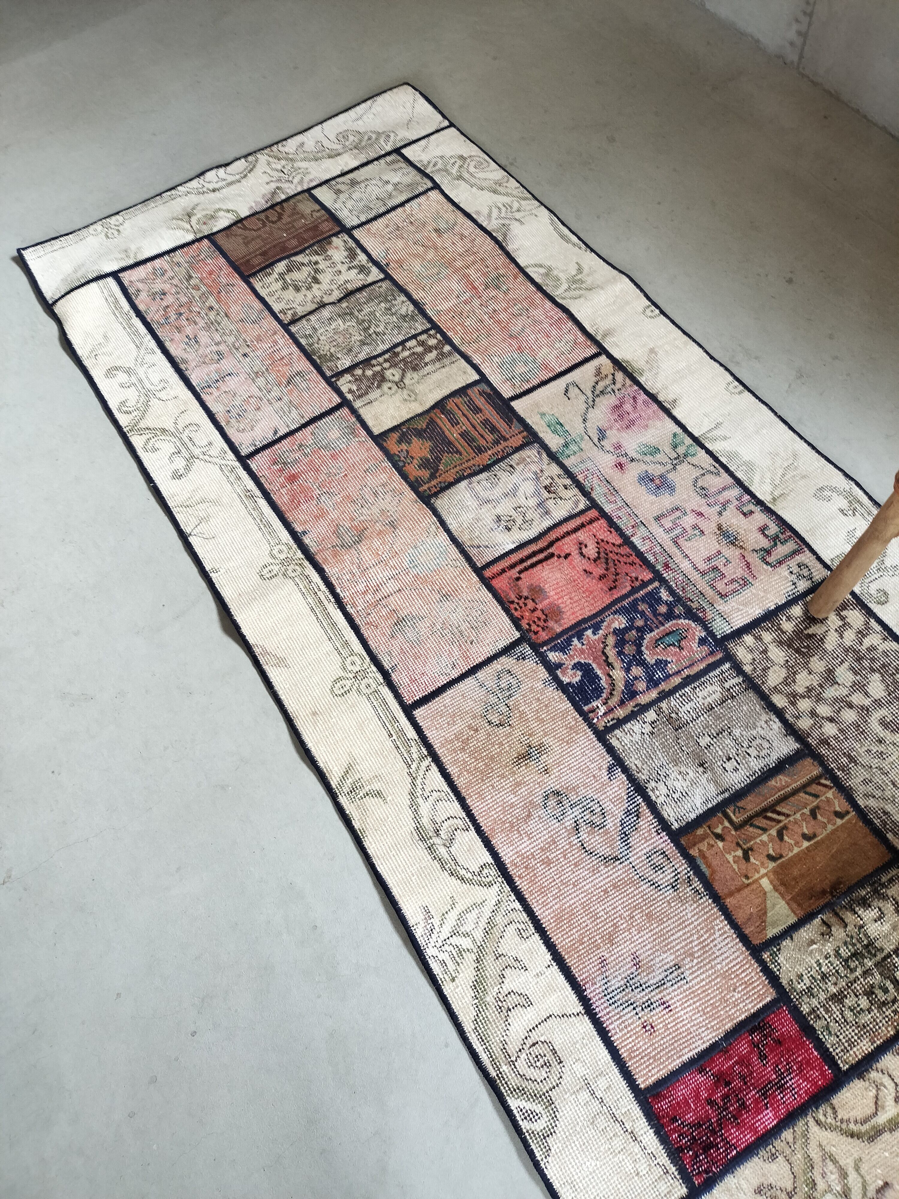 複数のラグを丁寧につなぎ合わせ新しい一枚に生まれ変わったパッチワークラグ。