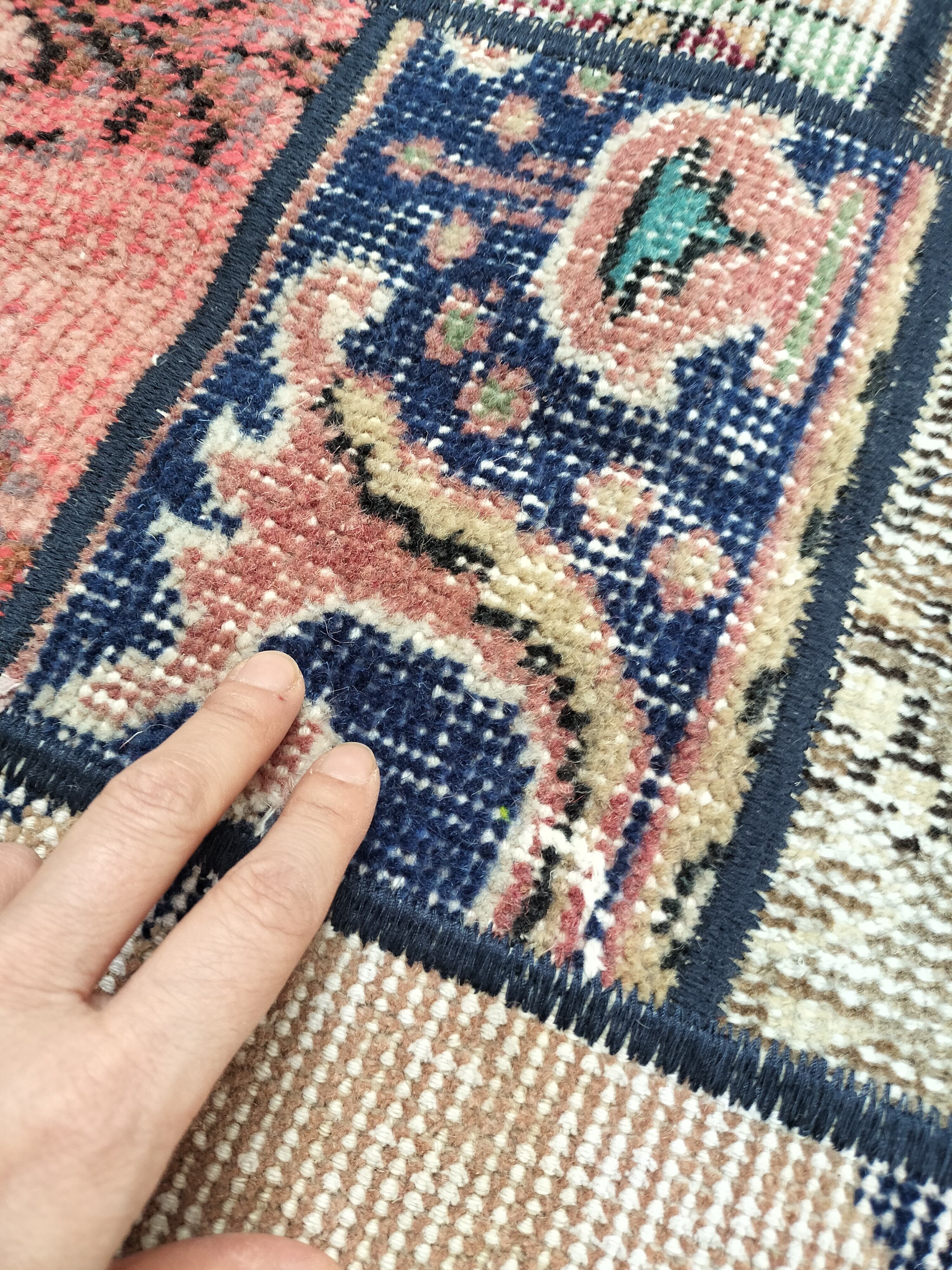 縁取りは上品なネイビーカラー、縁を囲むのは明るいベージュに優雅な柄のラグ、中にはサーモンピンクやベージュ、赤のラグがパッチワークされています。