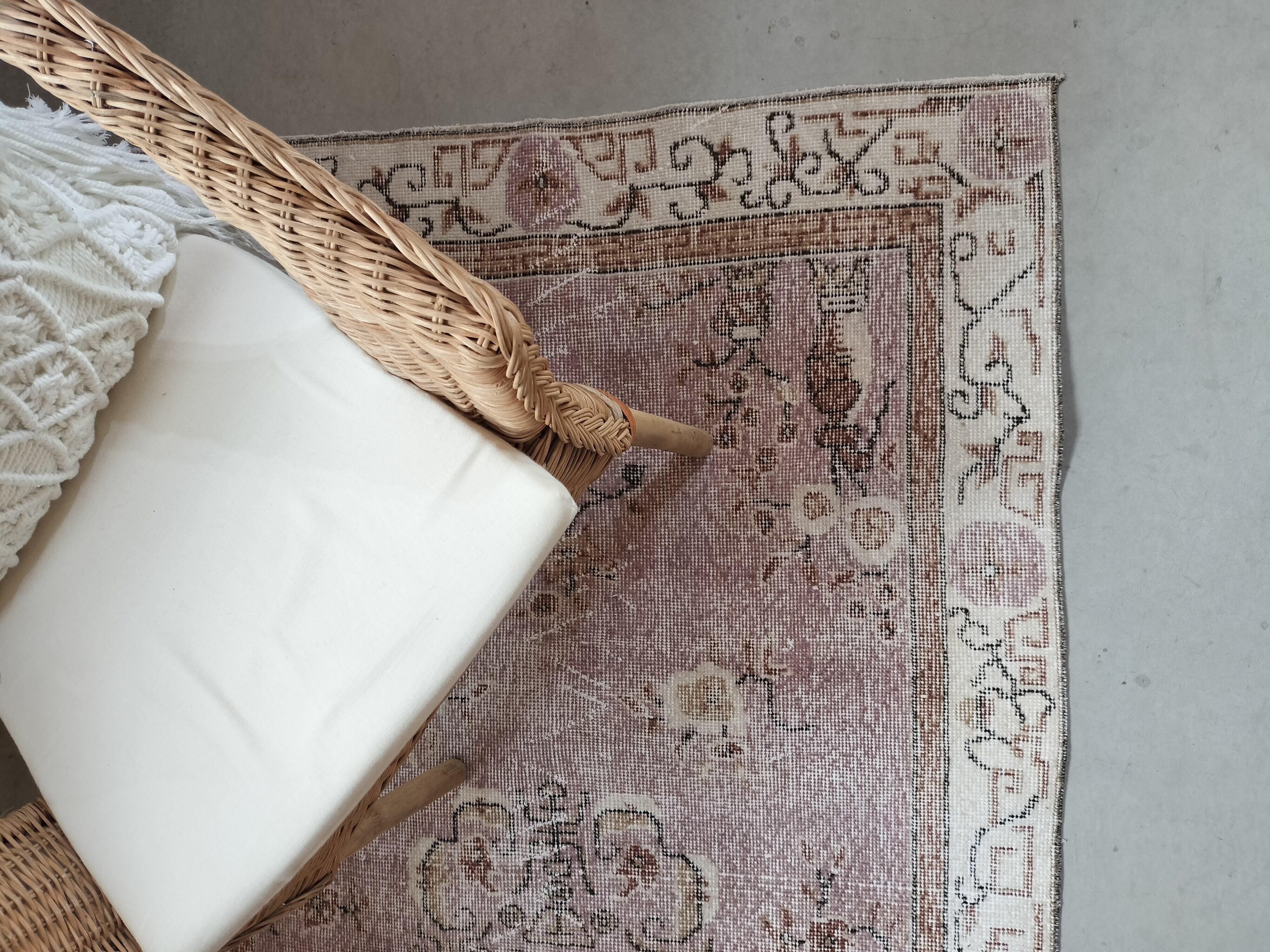 美しいラベンダーパープルのシノワズリ柄ラグ。珍しい色です。
