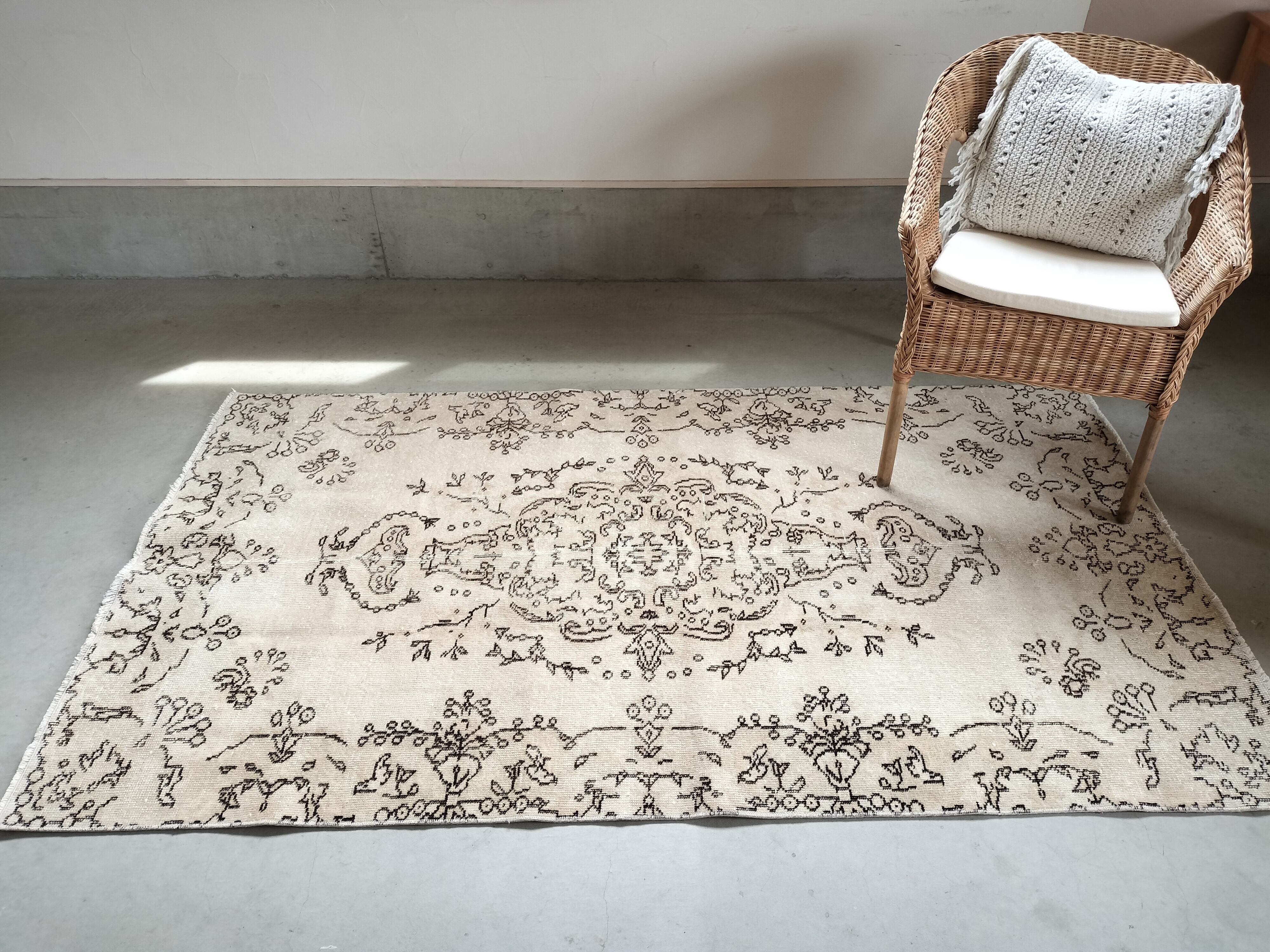 ベージュをベースにブラウンのラインが入った色味の少ない落ち着いた色味のラグ。ヴィンテージトルコラグは複数の色が入ることが多く、こちらのラグのようなシンプルな色味は珍しいです。
