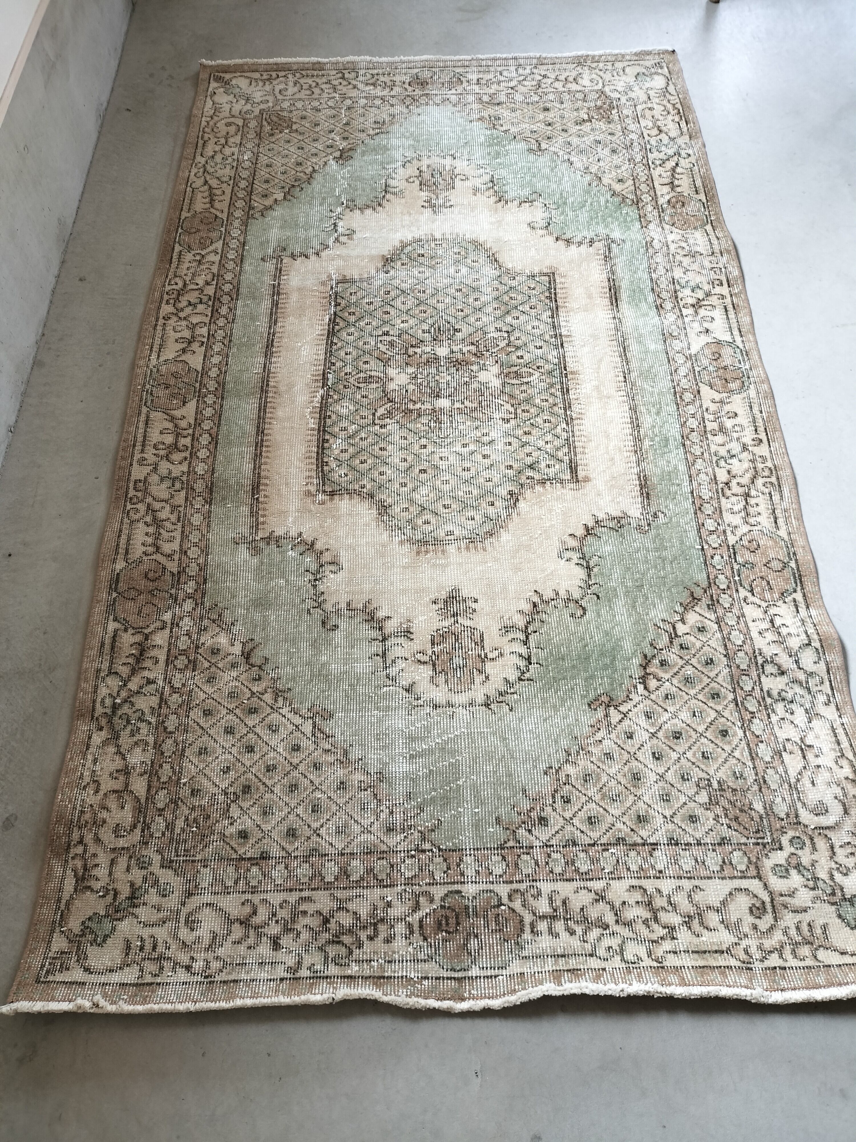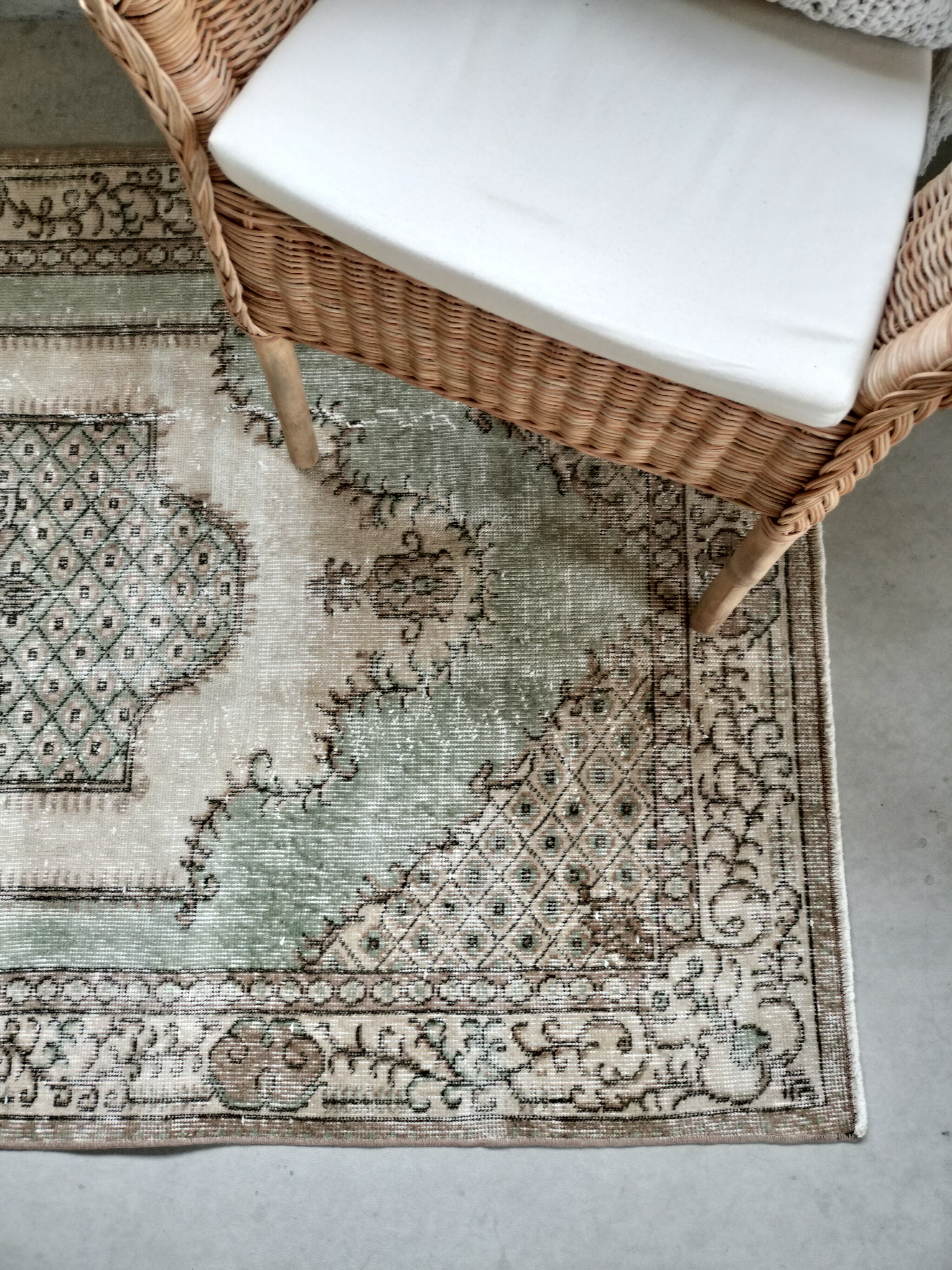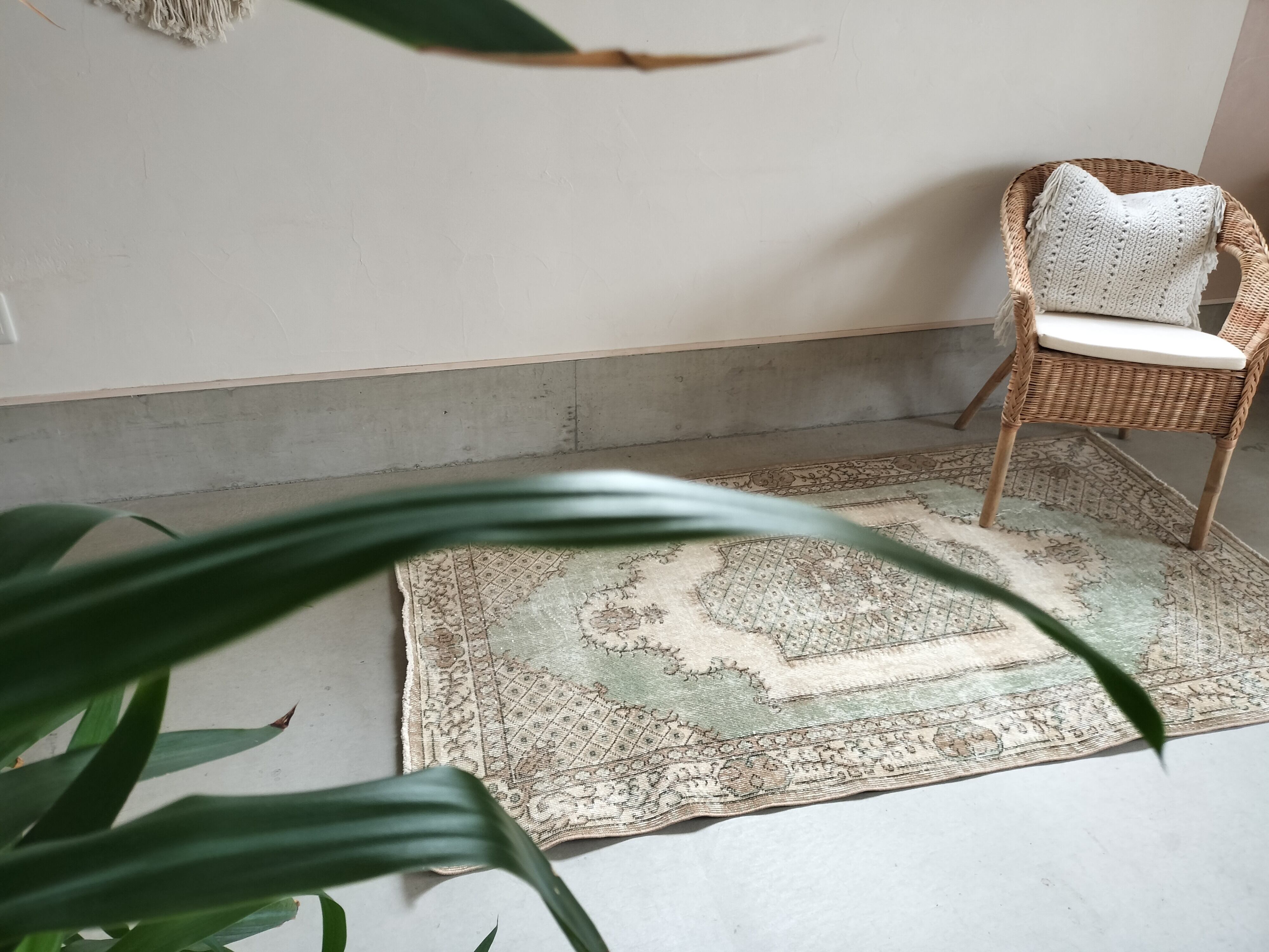 淡いブラウンとくすみミントグリーンが美しいヴィンテージトルコラグ。