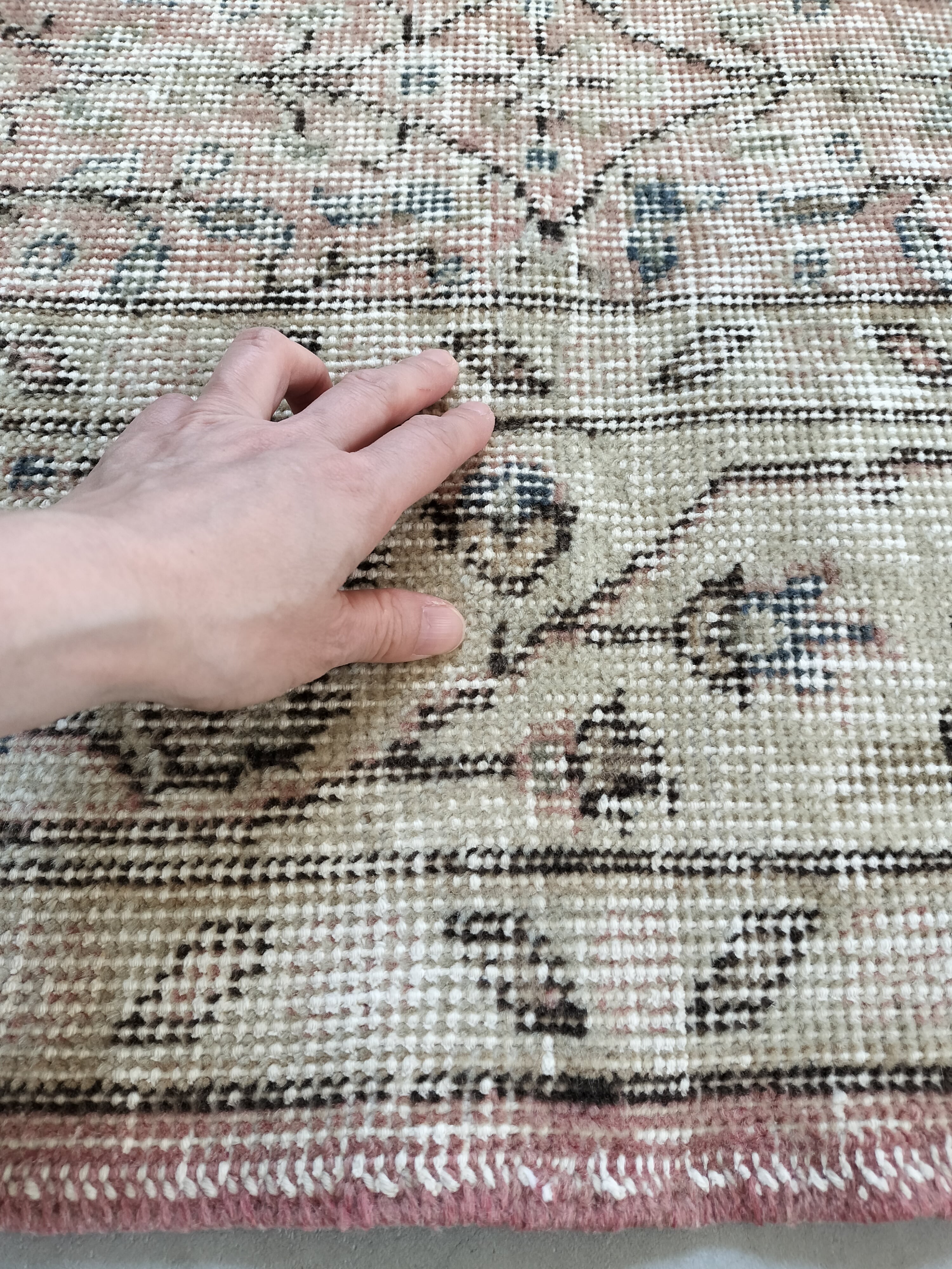 くすみのあるローズピンクにダークブラウンでラインが入る美しいラグ。