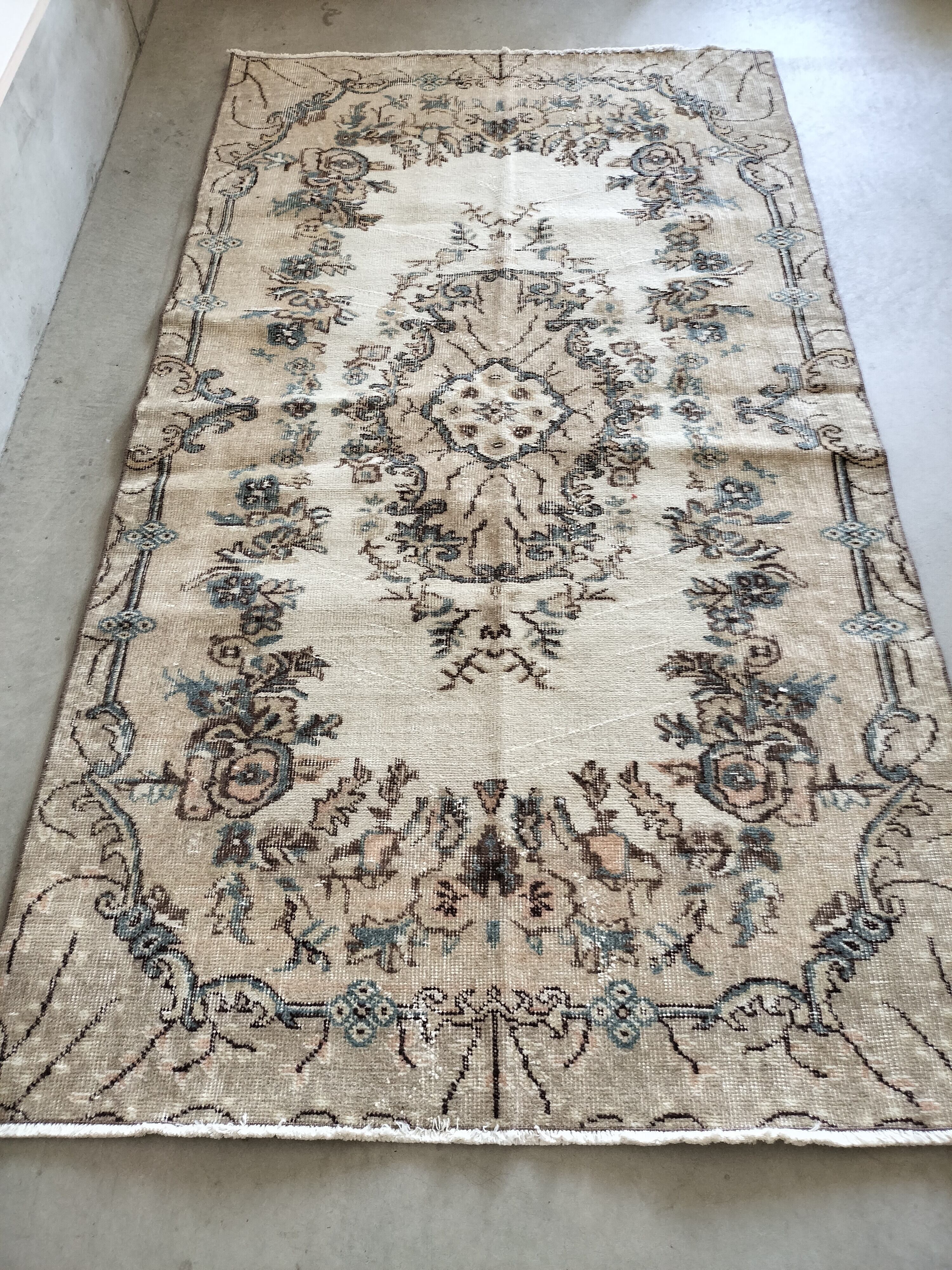 グレージュの囲みとメダリオンにベージュが入るヴィンテージトルコラグ。