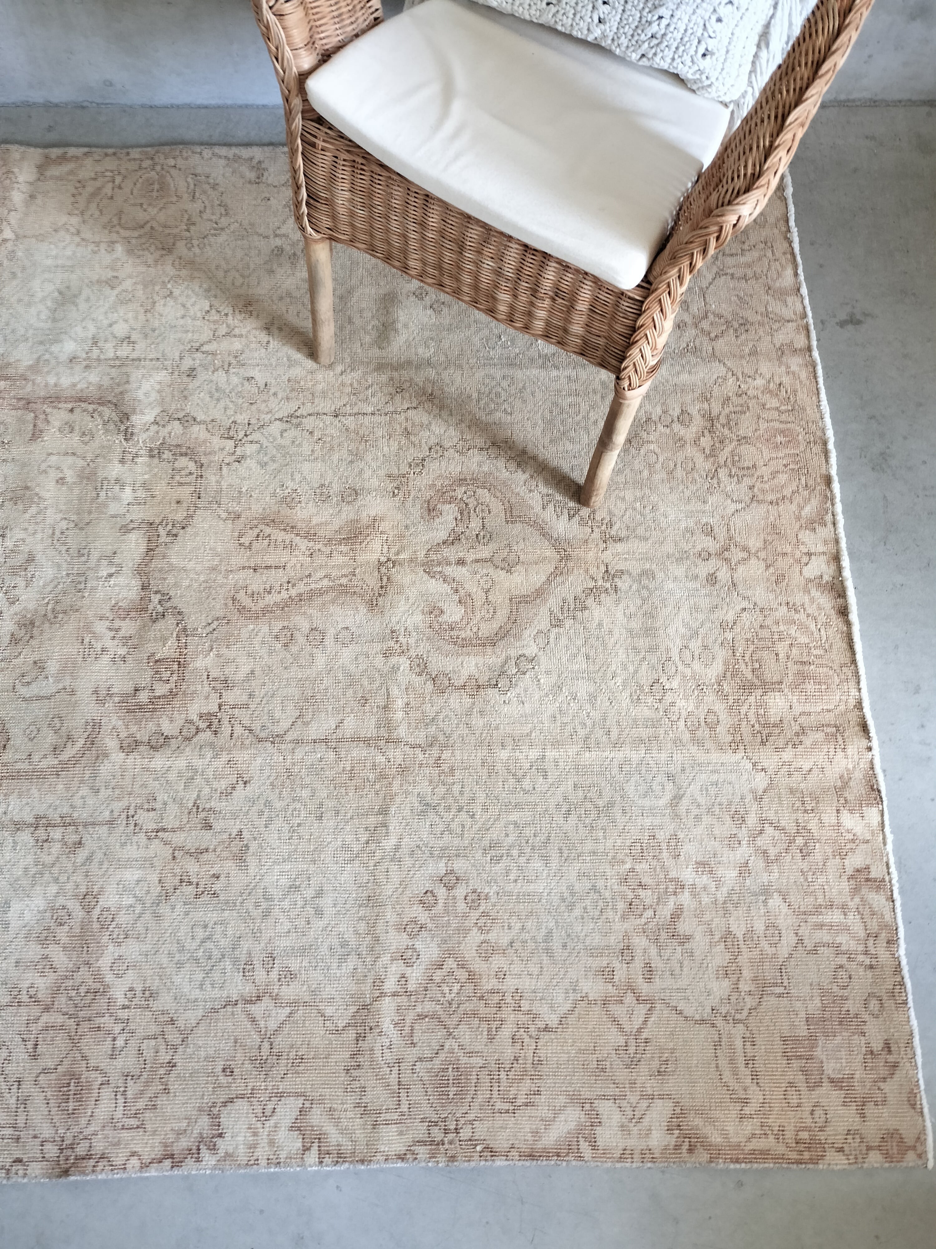 柔らかい色合いのクリームベージュの大判ヴィンテージトルコラグ。