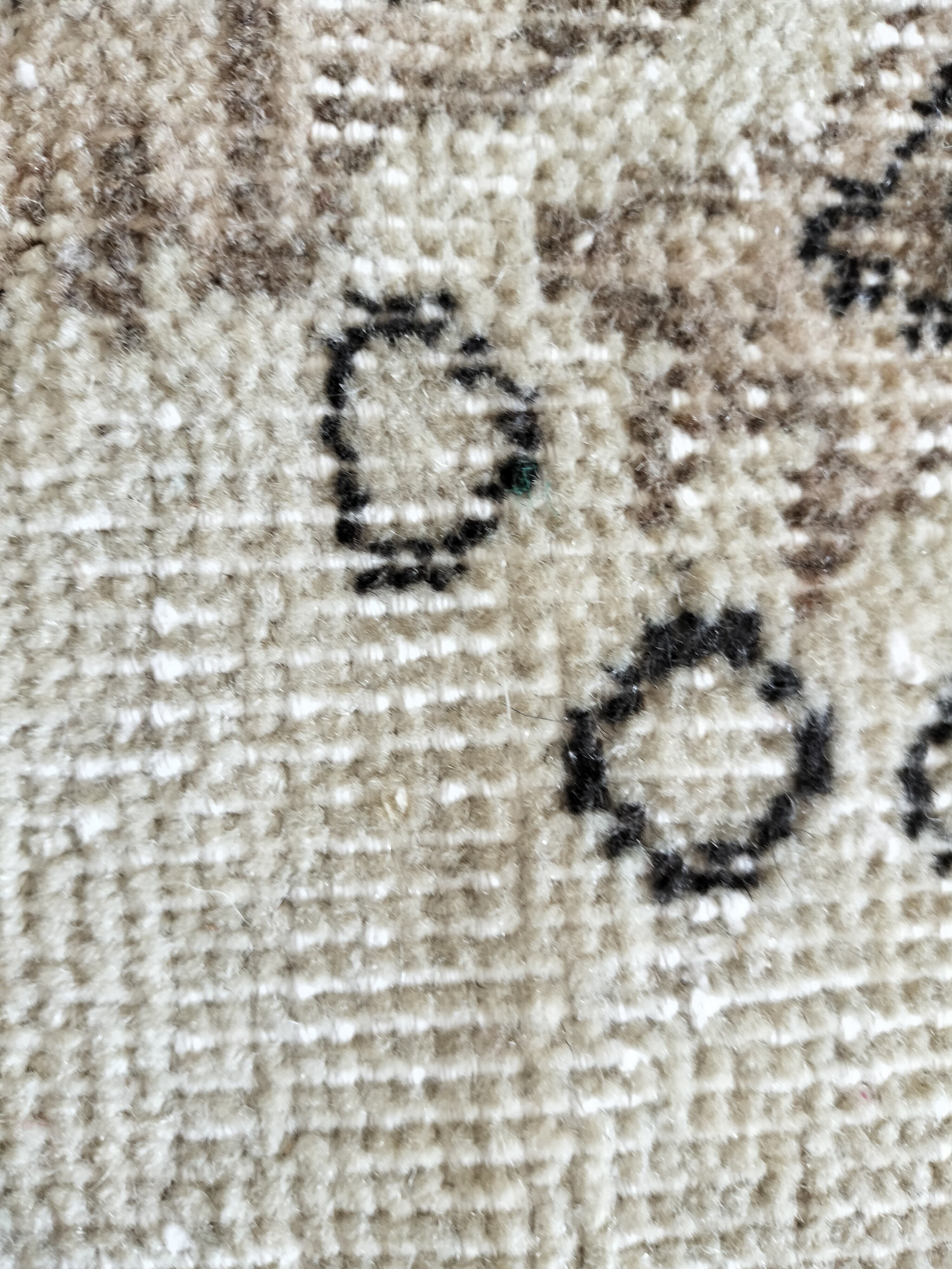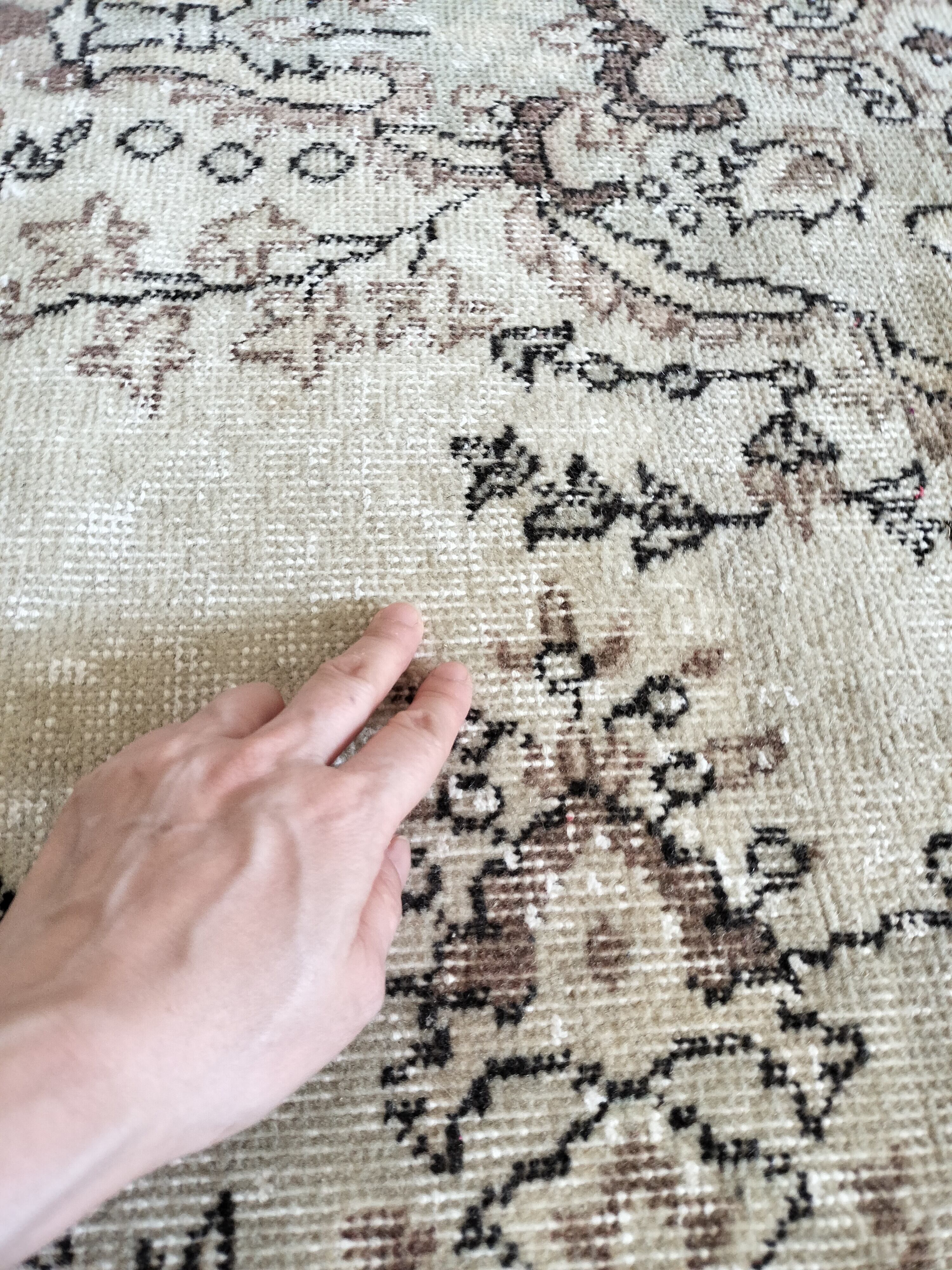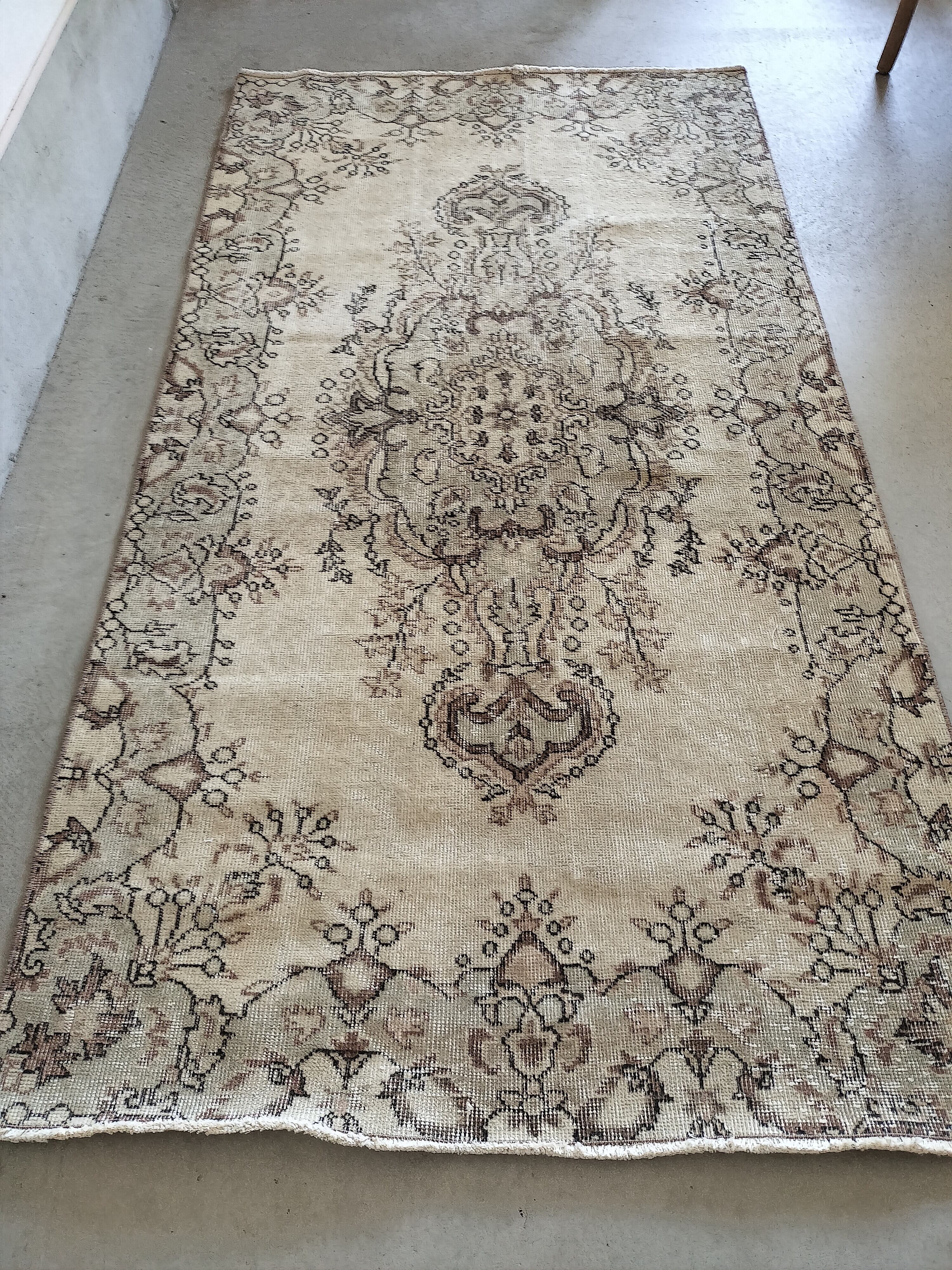 ベージュをベースにごく淡いベージュがかったグリーンで模様が入るメダリオンラグ。
