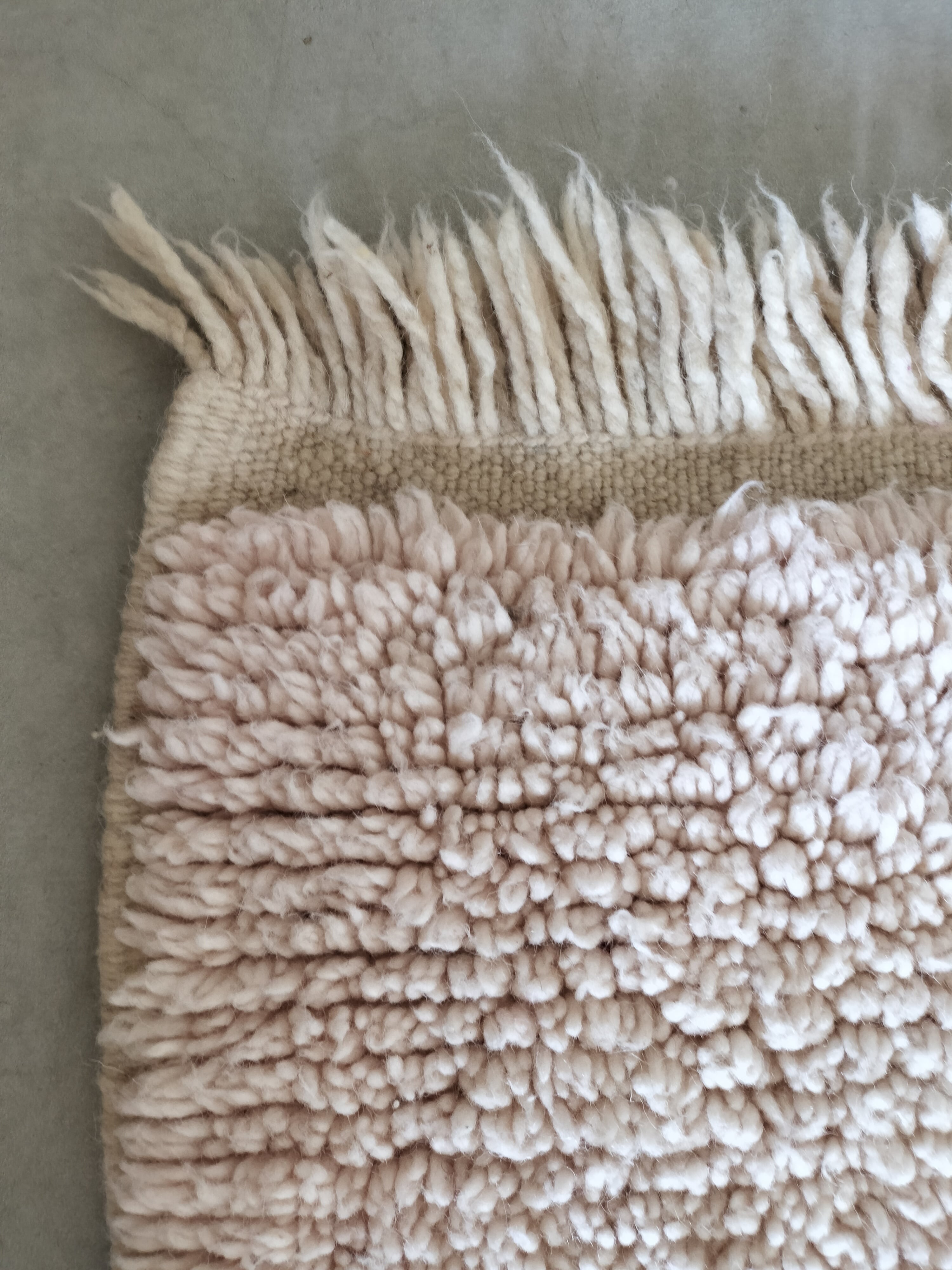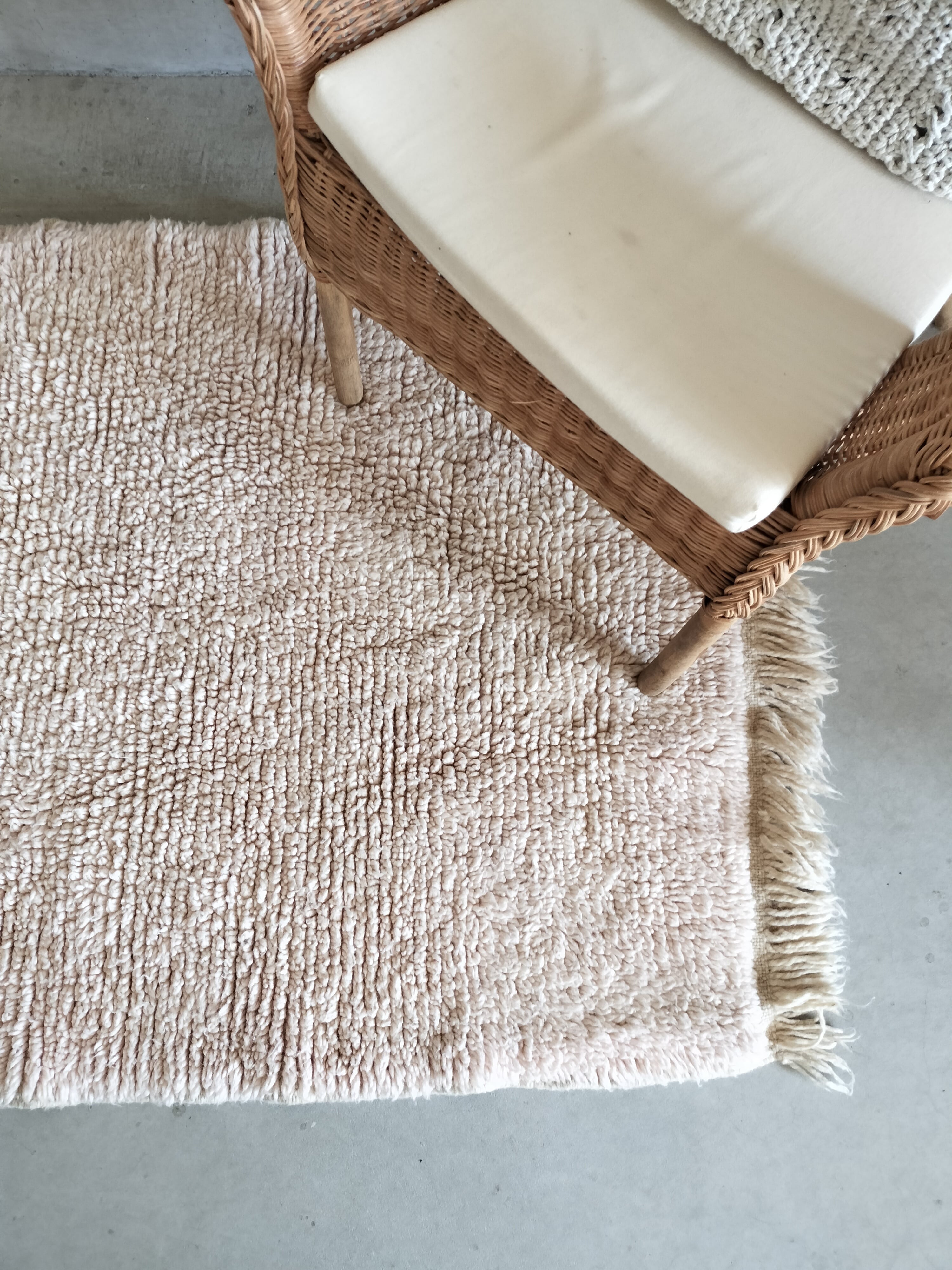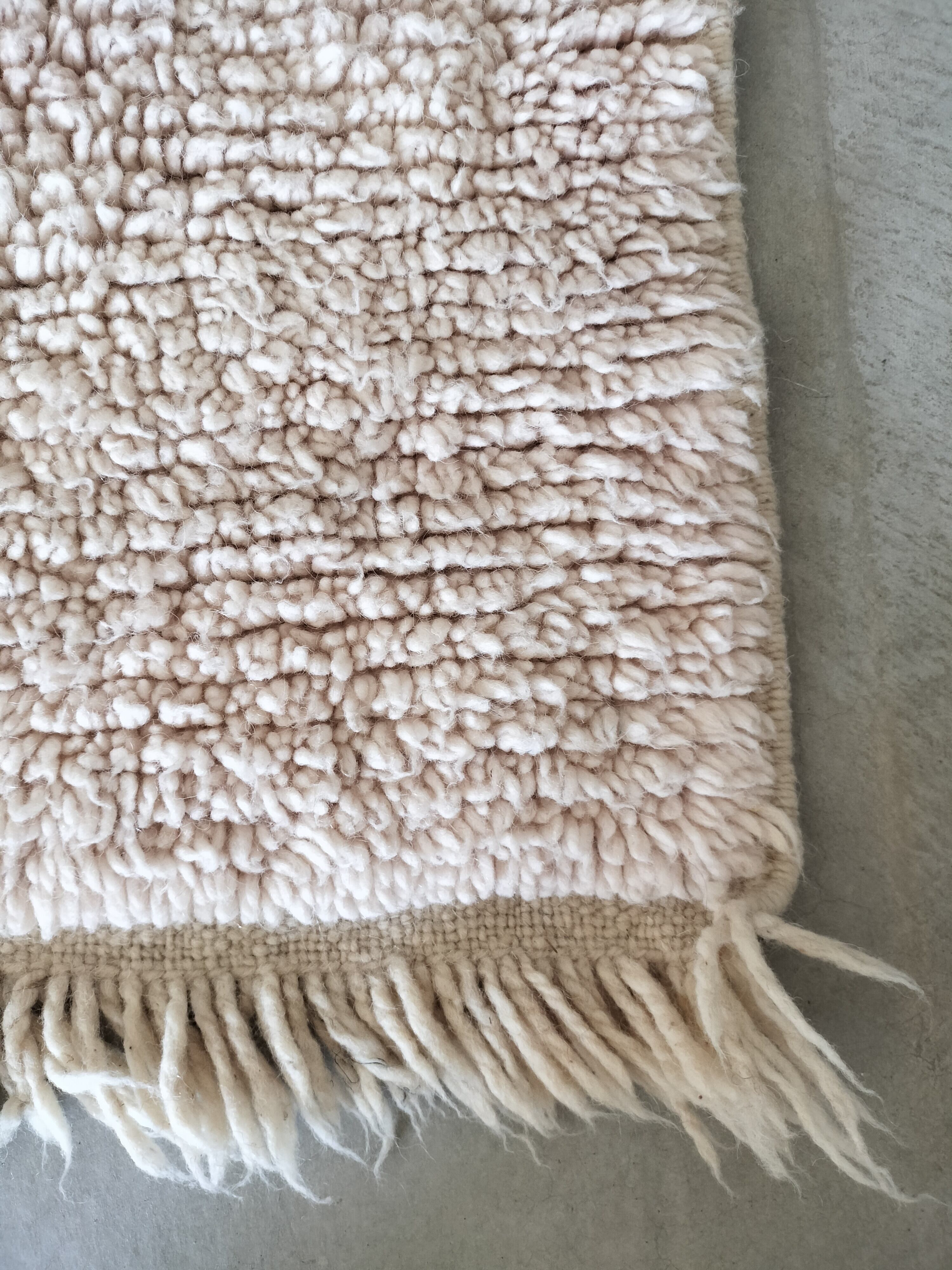 羊のもつそのままの色のアイボリーのナチュラルな印象のラグ。一部少しピンクがかったアイボリーです。手織りらしく完璧な長方形ではなく両端が少し幅が狭くなっています。