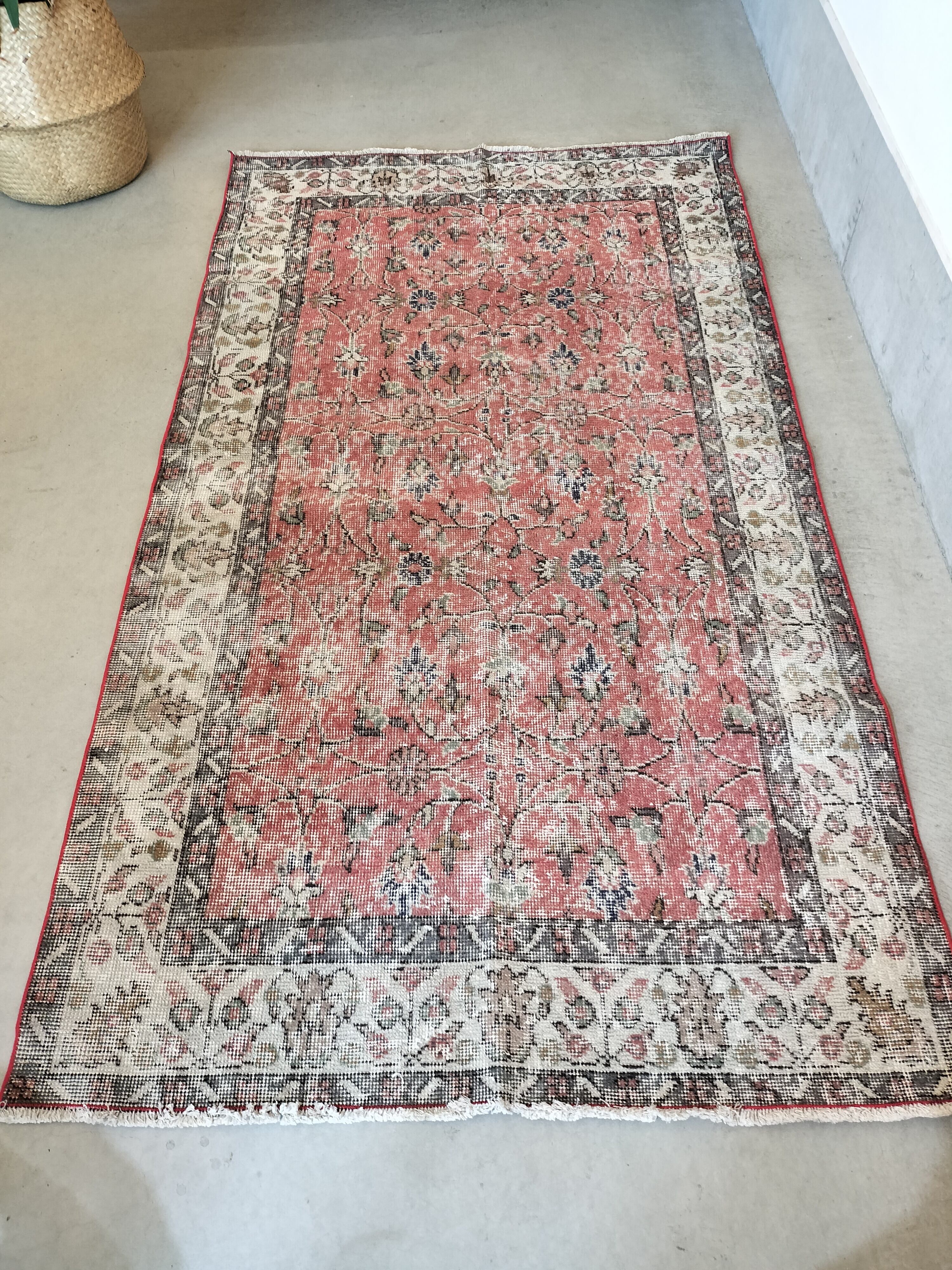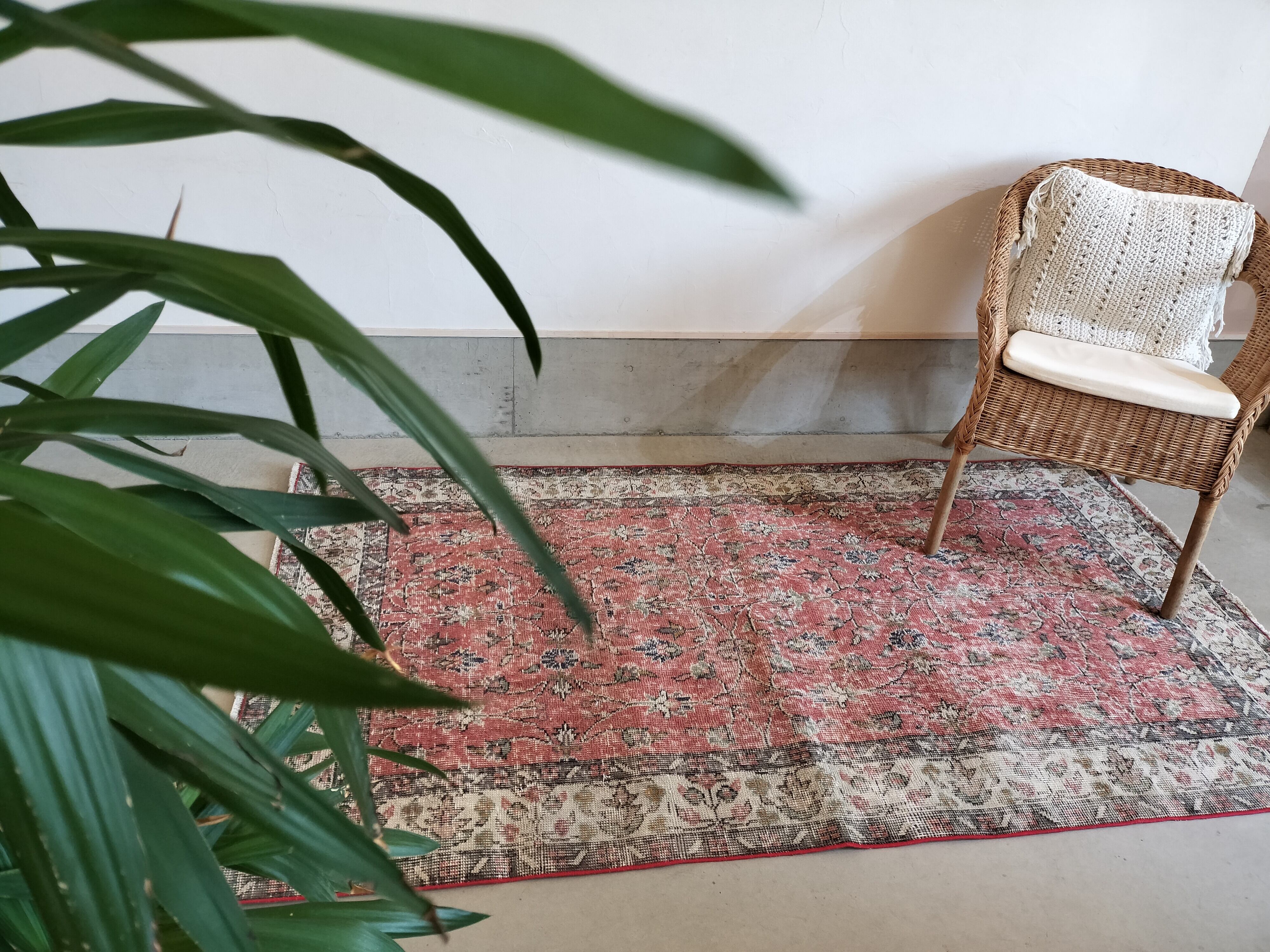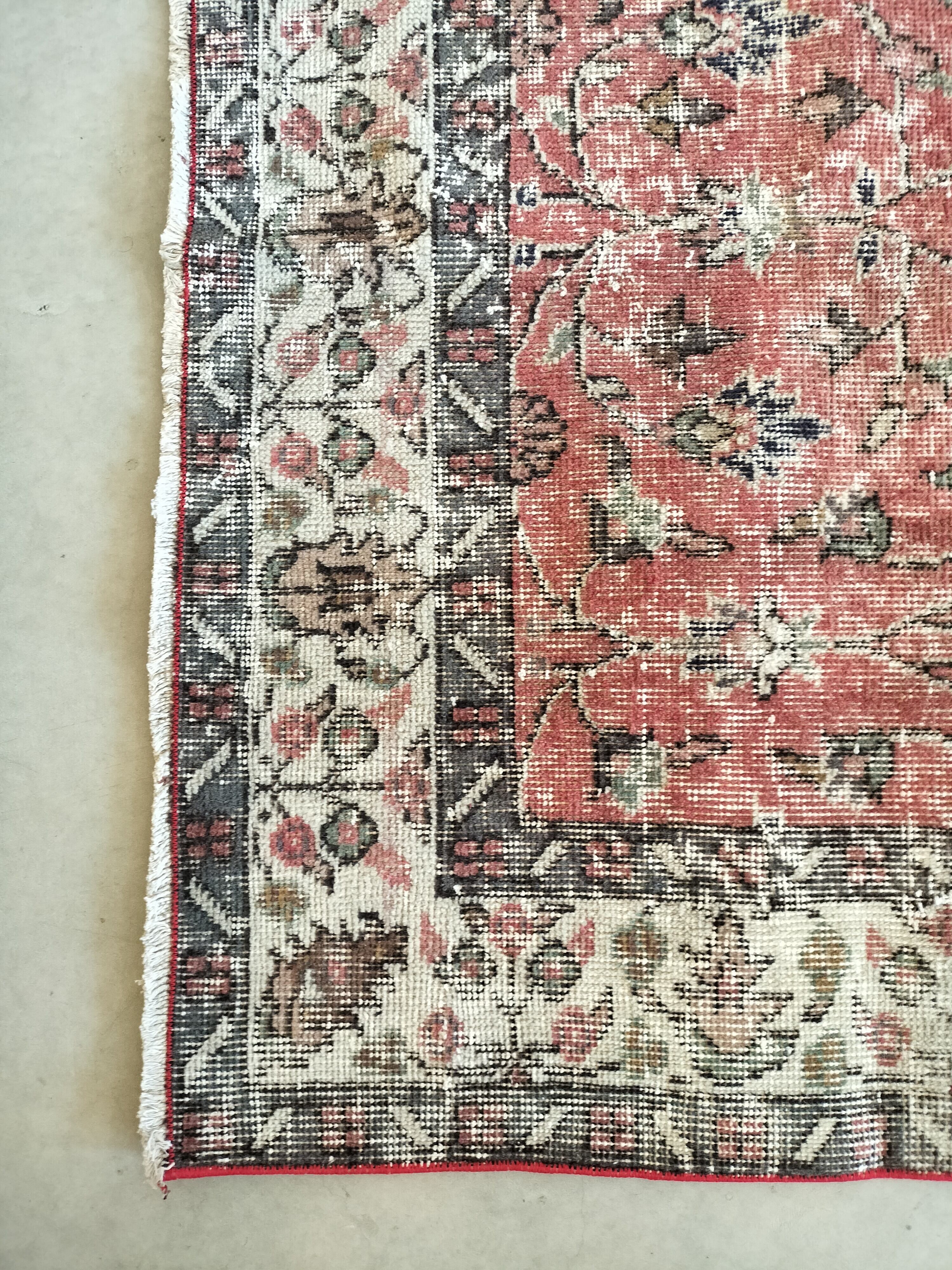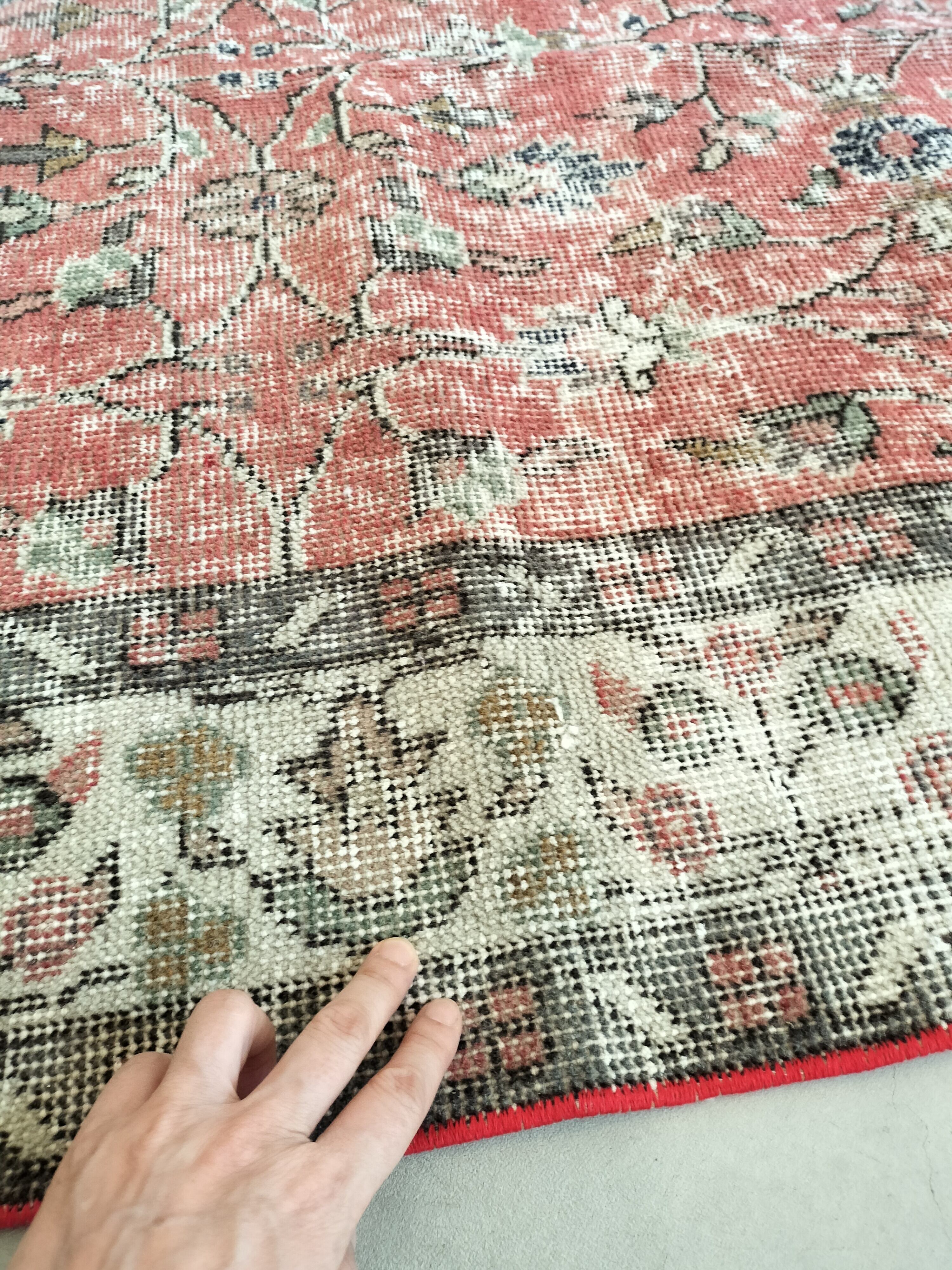 落ち着いたくすみレッドをベースに縁にはグレーやベージュのベーシックな色が入るヴィンテージトルコラグ。