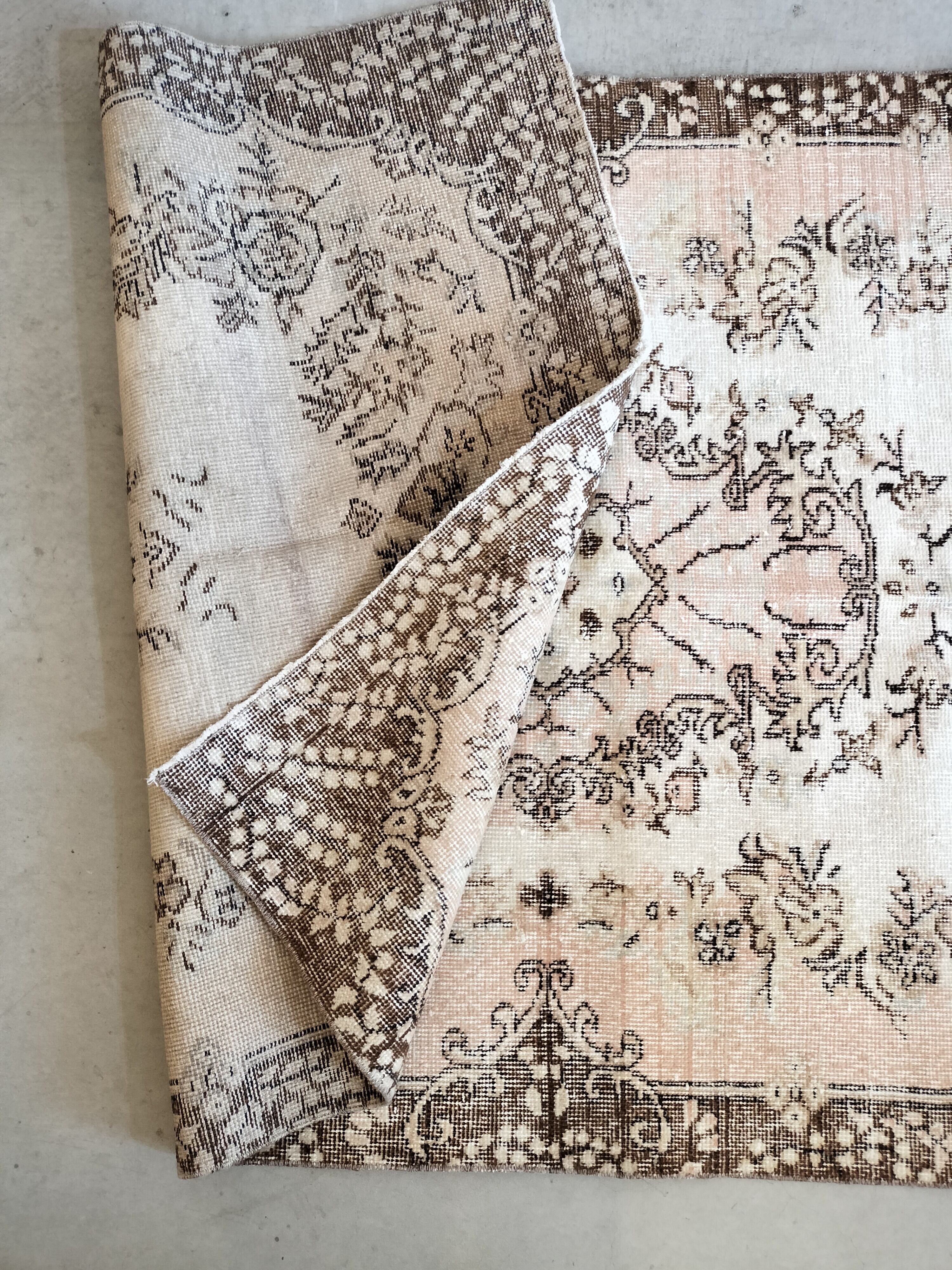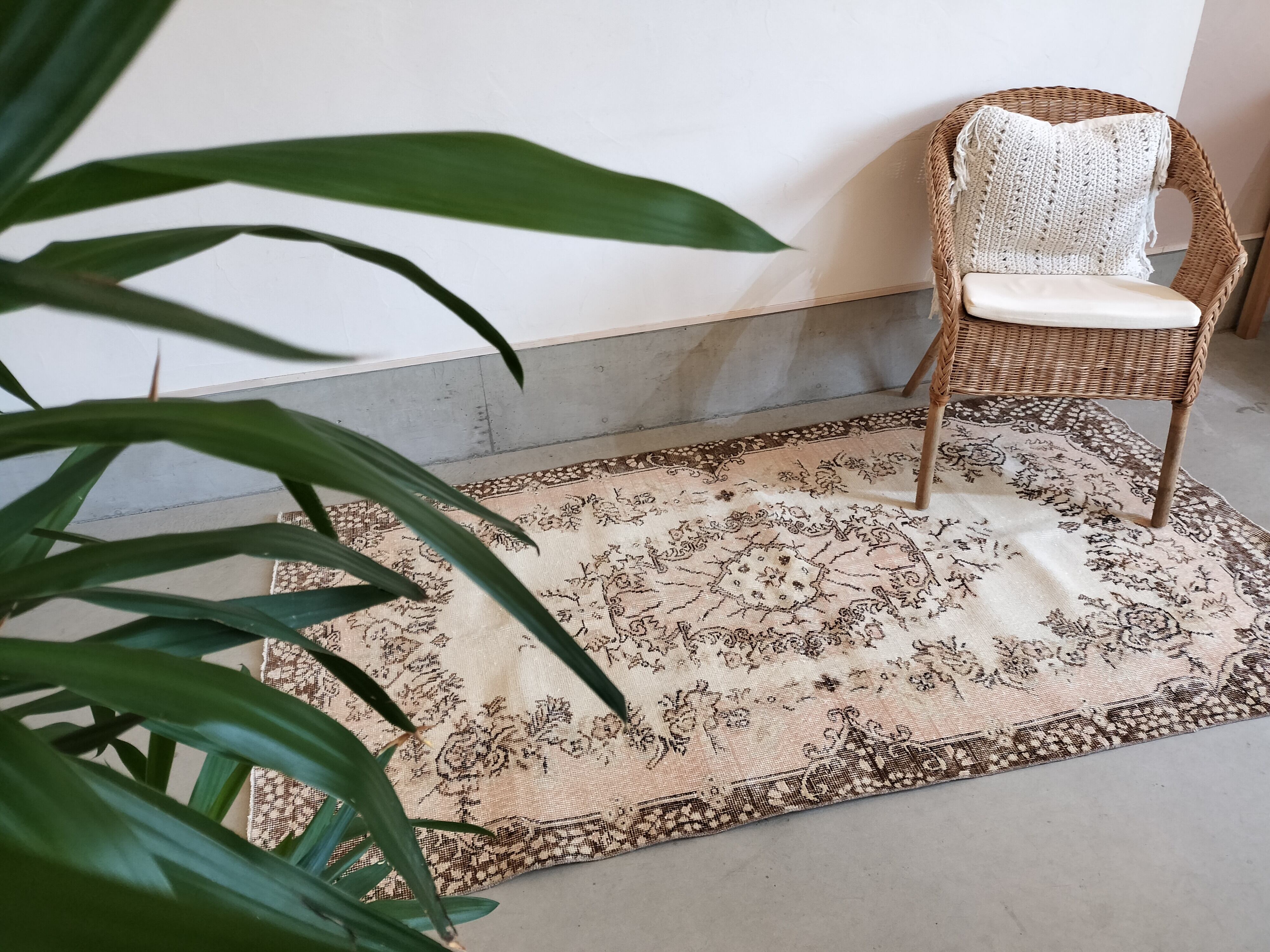 柔らかい印象のピンクベージュが美しいヴィンテージトルコラグ。