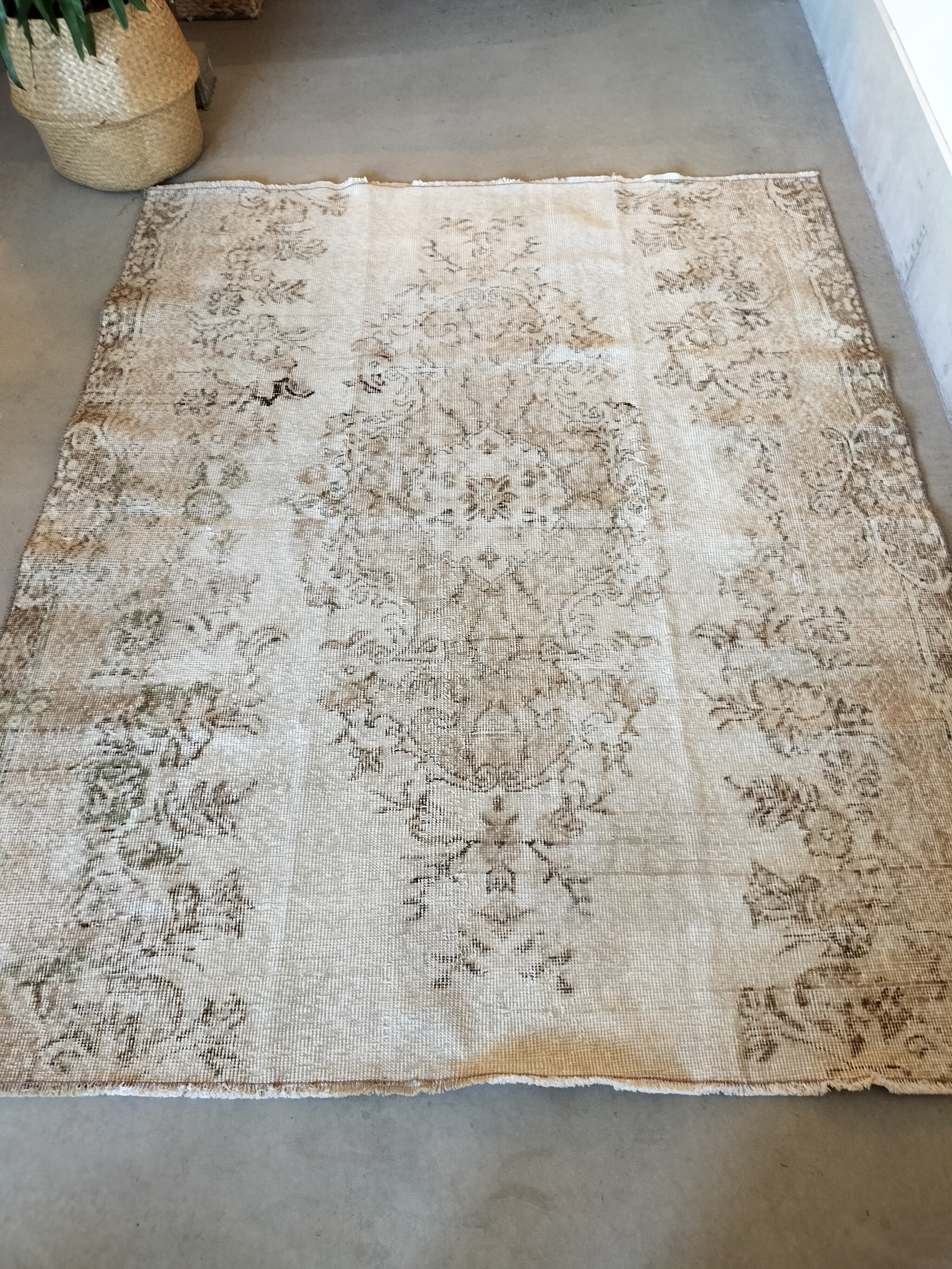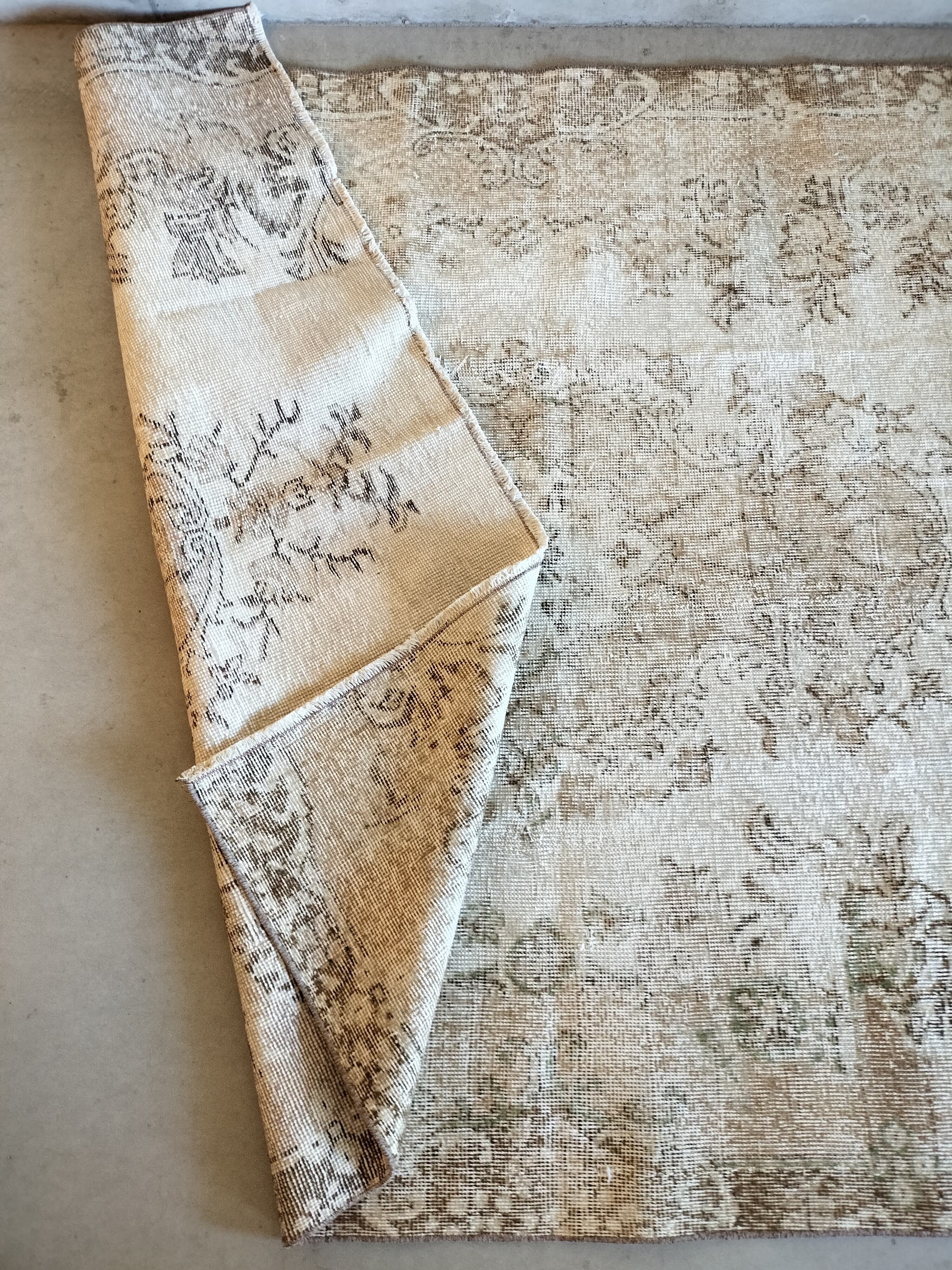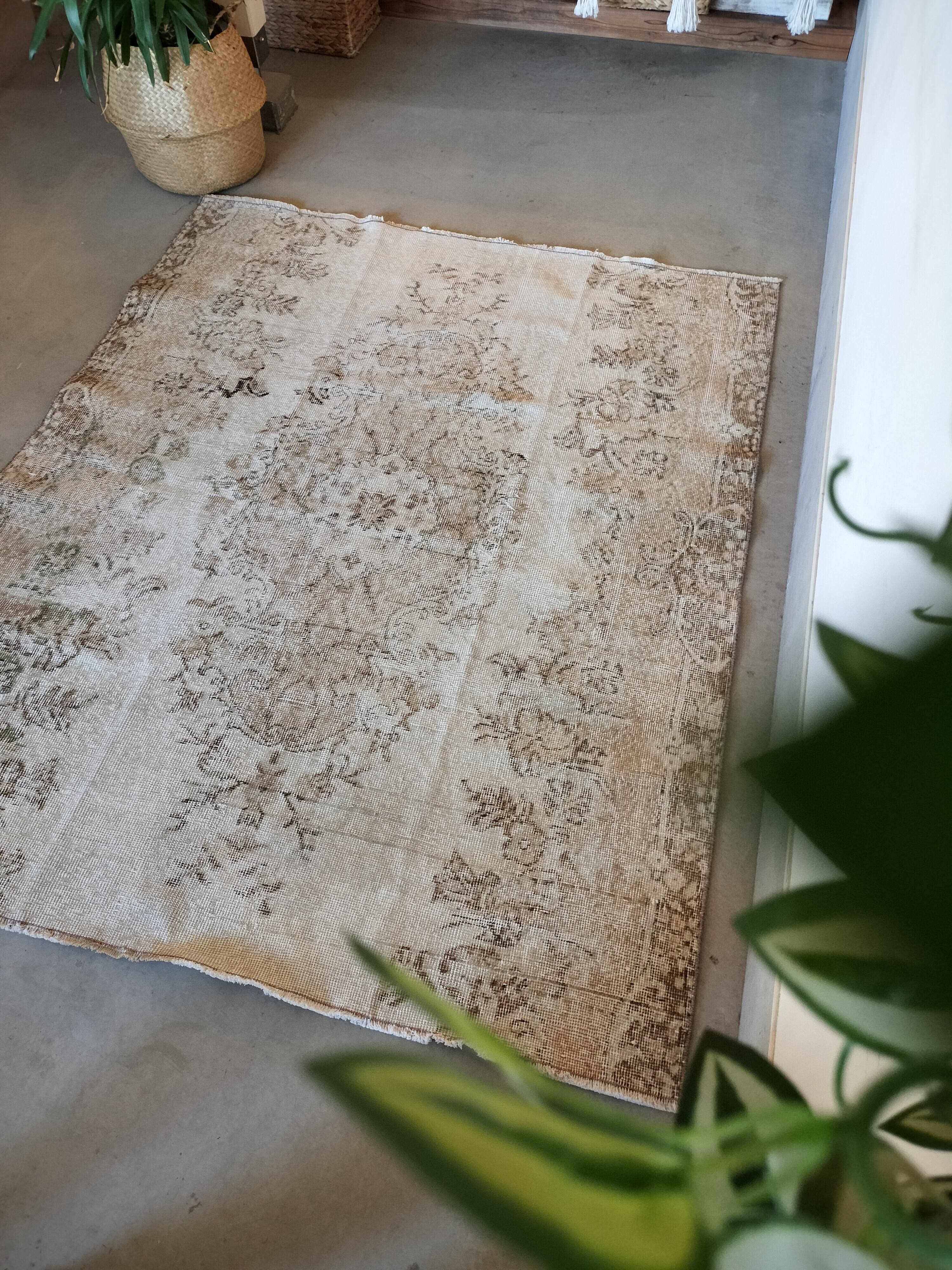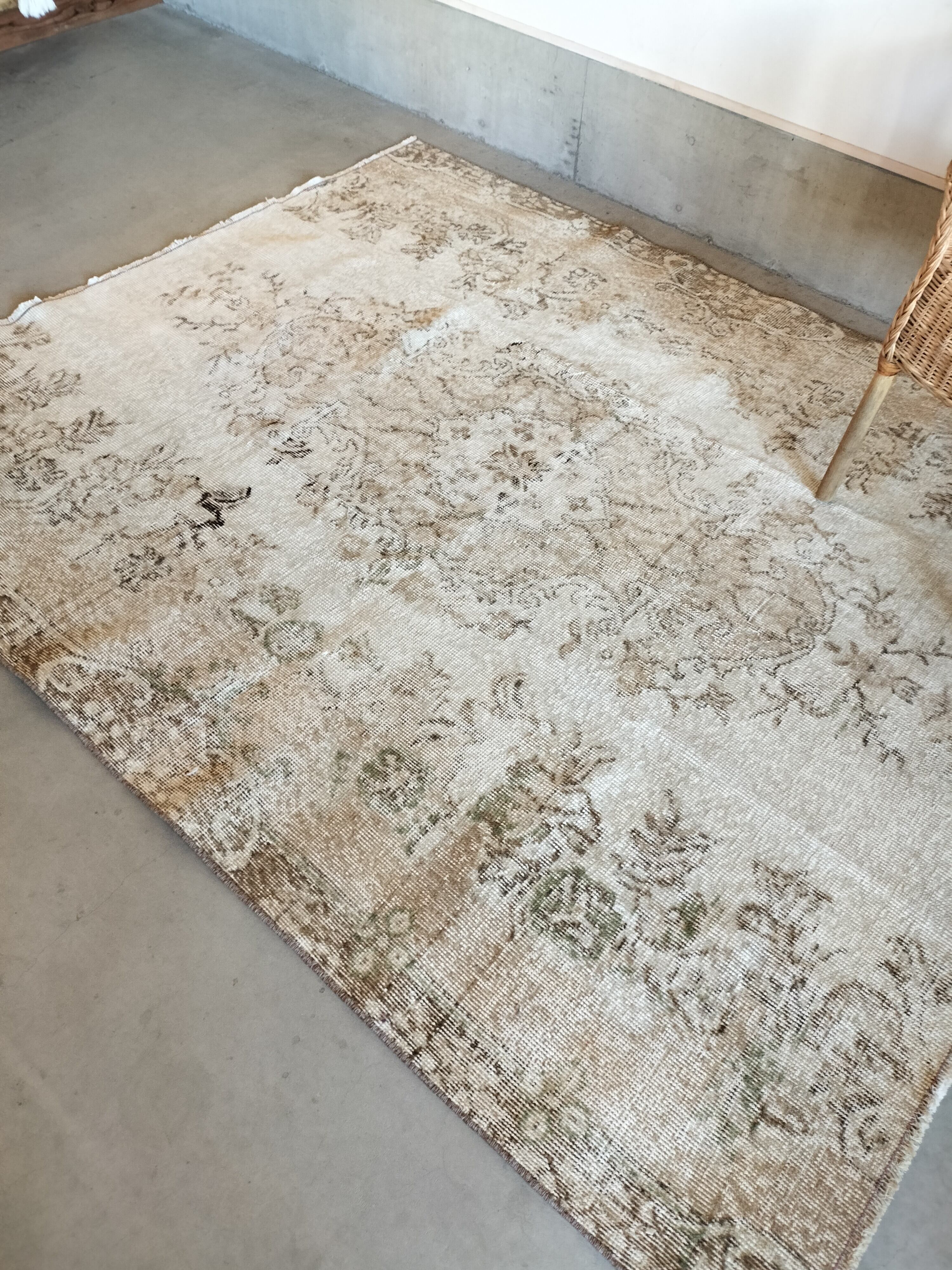柔らかいベージュに淡いブラウン、モスグリーンが少し入り水彩画のように繊細で上品なラグです。